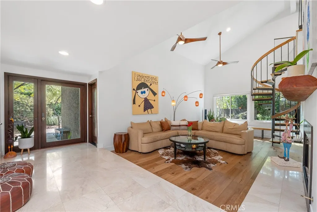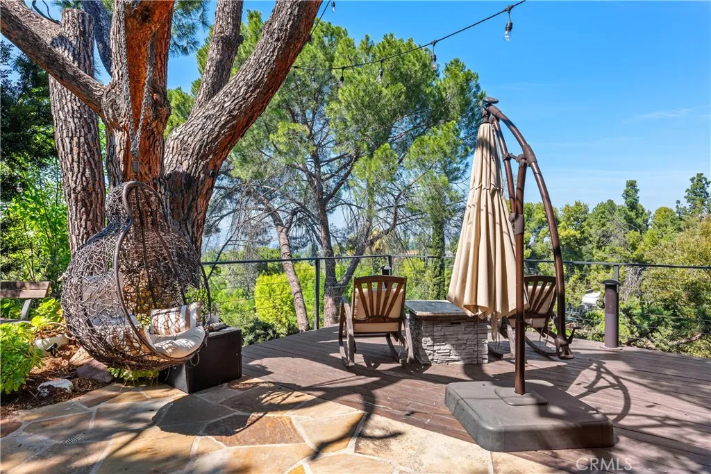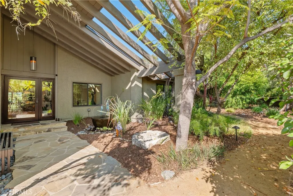 This absolutely stunning 4 bedroom, 3 bath, gated home has views of Warner Center and truly leaves nothing to be desired. A stone driveway and winding path lead to a custom glass front door, opening into a beautifully renovated single story home that seamlessly blends elegance and comfort. The dramatic two-story living room features an artistic spiral staircase leading to a loft, creating a striking architectural focal point. The gourmet kitchen, renovated in 2025, is a chefs dream, showcasing top-of-the-line Thermador appliances, sleek porcelain countertops, and an oversized center island with a breakfast bar. Expansive corner windows frame breathtaking views and effortlessly bring the outdoors inside. The kitchen opens to a spacious family room, warmed by a cozy fireplaceperfect for everyday living and entertaining. Wide-plank wood flooring and travertine flow throughout the home. Double doors welcome you into the serene primary suite, complete with a generously sized, custom-built closet. The spa-inspired primary bathroom, renovated and gorgeous, features quartz countertops, dual sinks, and a luxurious steam shower with dual shower heads. This home boasts numerous upgrades, including owner-paid in full solar with a battery backup, updated pool equipment and lighting, electrical panel, intercom and cameras, a newer 2026 roof, and more. The incredible covered outdoor kitchen completed in 2025, offers heating and a ceiling fan, allowing for year-round enjoyment. Private and serene, the grounds are nothing short of magical, day and night. Watch breathtaking sunsets, gather a