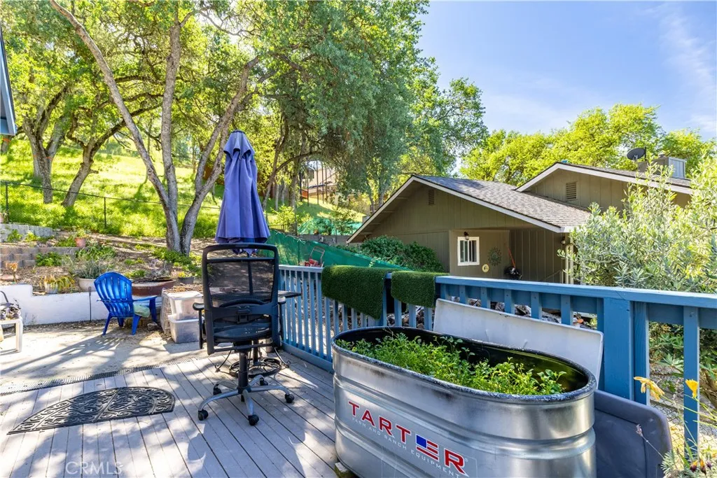 PRICE REDUCED! Located in the gated lake community of Oak Shores at Lake Nacimiento, this inviting 2 bedroom, 2 bath home also offers a bonus loft/office for added flexibility. Surrounded by mature oak trees, the home features a warm and welcoming interior with vaulted ceilings, skylights, wood shutters, and distressed oak floors that bring character and charm to the main living spaces. The spacious living area is filled with natural light and opens to a covered upper-level deck, creating a comfortable space to relax or entertain. The kitchen offers solid surface counters, a Bosch stove, and generous workspace, while the home also includes a stackable washer and dryer for convenience. The guest bedroom features a California king Murphy bed, and the primary suite is accented by a distinctive plank pecan barn door. A major highlight of the property is the owned solar system with two Tesla batteries, paired with an energy-efficient heat pump for year-round comfort and added efficiency. Additional features include a a whole house water filtration system, a stair chair lift, ceiling fans, carpet in select areas, and a deep, insulated, finished garage with a wine closet, and a tool shed for extra storage. Enjoy access to Oak Shores resort-style amenities, including pickleball courts, hiking trails, mini-golf, playground, campground, dog park, launch ramps, clubhouse, heated pool, and gated entry.