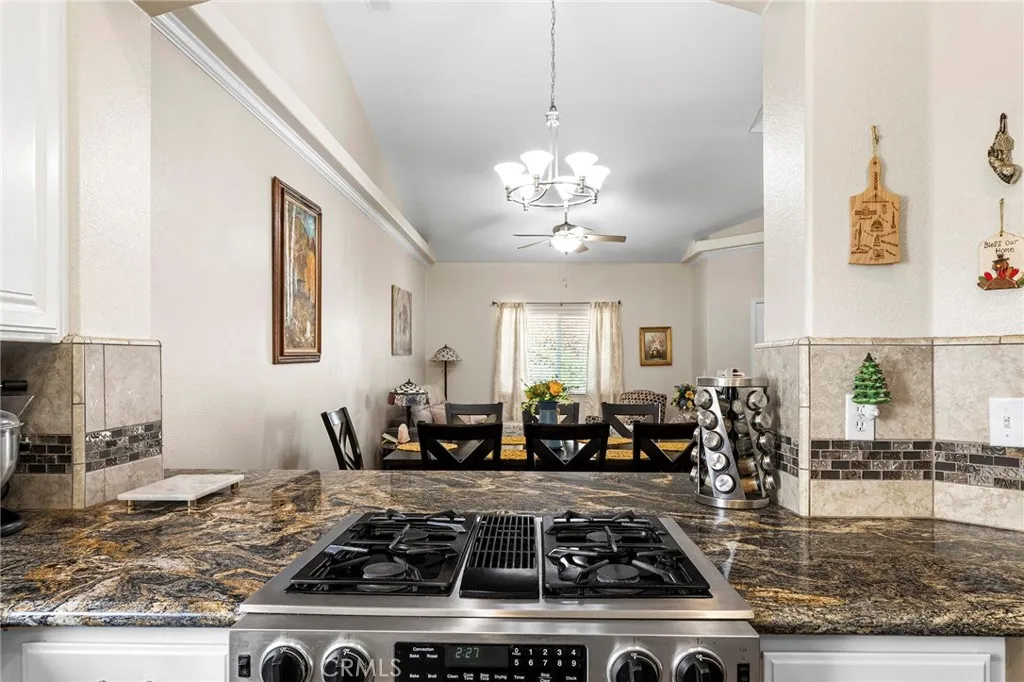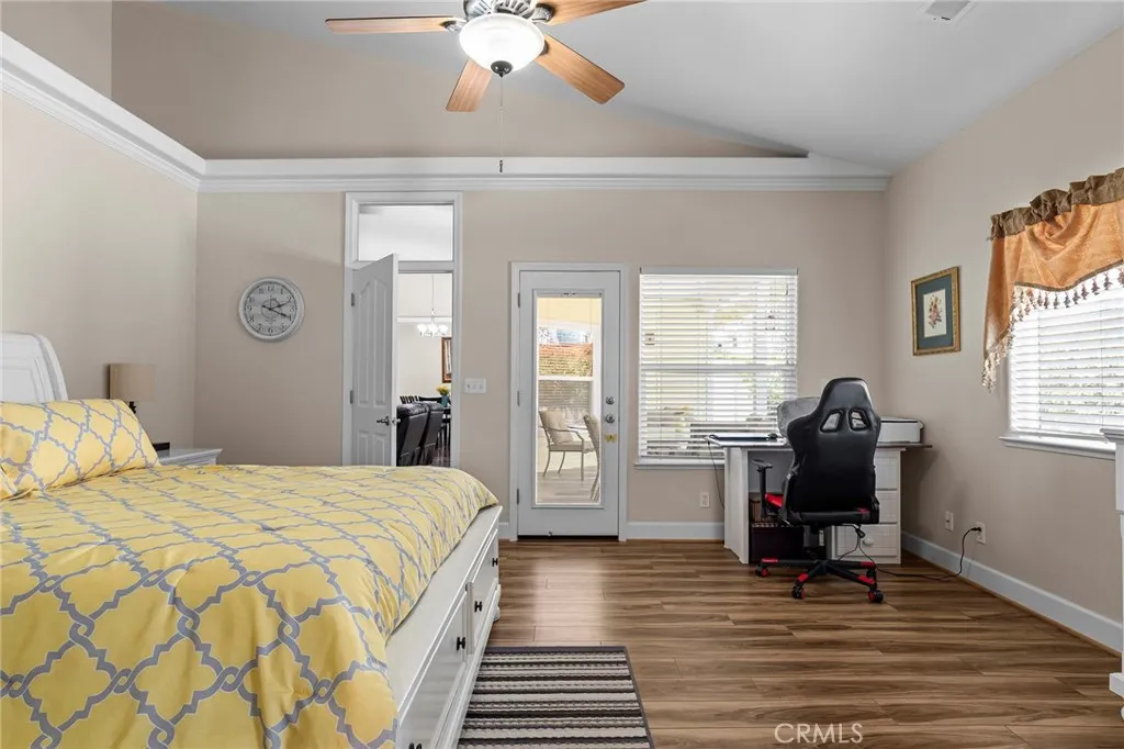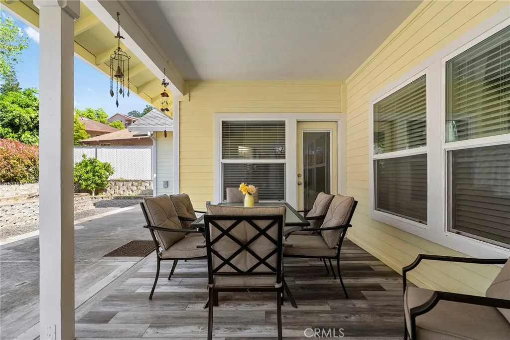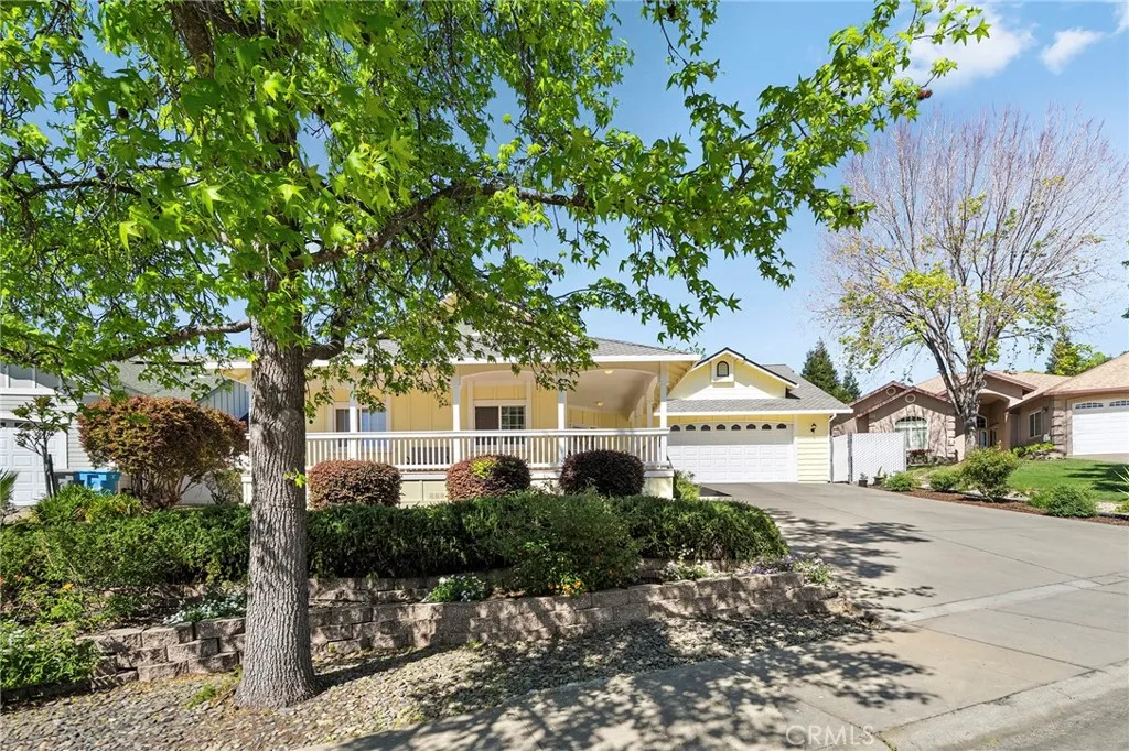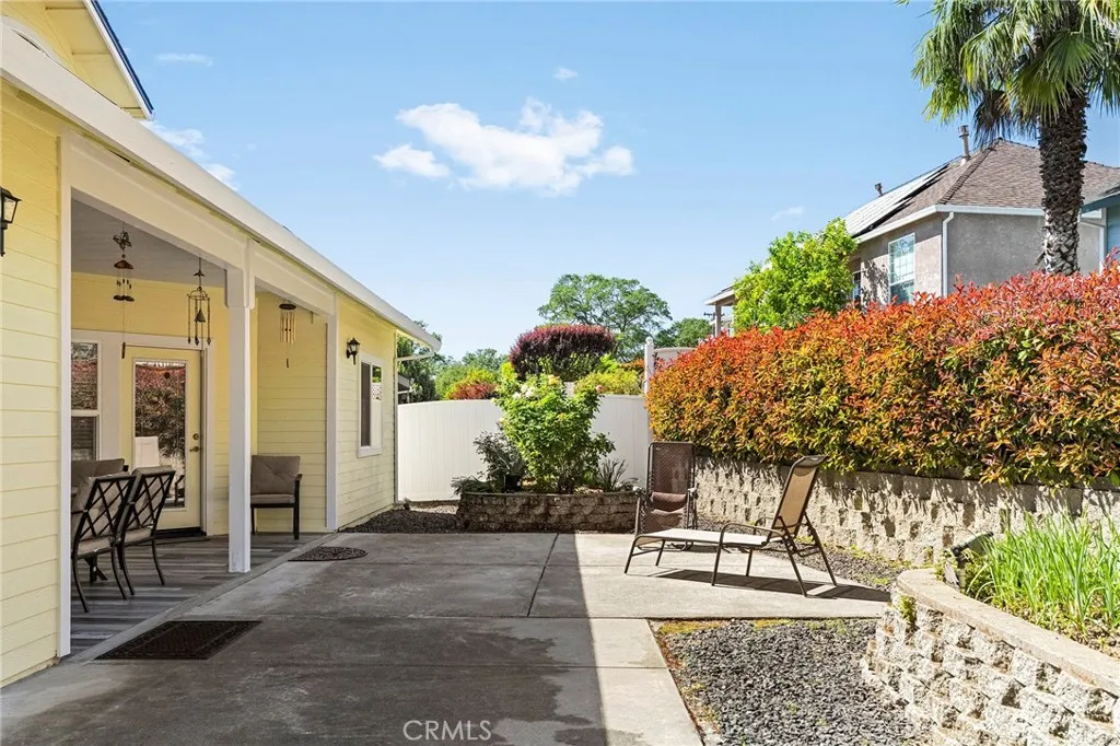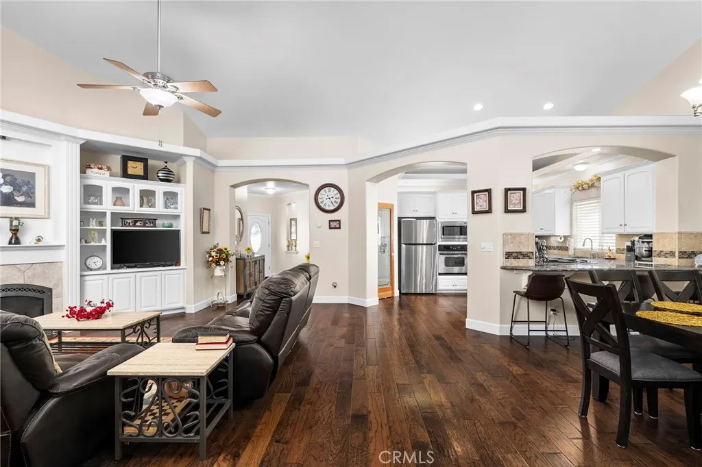 This beautiful home welcomes you with a marvelous open floor plan and soaring vaulted ceilings that make the living space feel bright, airy, and expansive. Natural light pours in, highlighting the high-end laminate wood flooring throughout the main living areas, while two bedrooms offer soft carpet for comfort and the primary suite offering updated flooring. The spacious living room features a cozy gas fireplace with a stunning built-in bookshelf, creating the perfect space to relax or gather. The kitchen is thoughtfully designed for both everyday living and entertaining, complete with granite countertops, tile backsplash, stainless steel appliances, a large pantry, two ovens for the bakers, and an eat-up bar for casual dining. The master suite is privately located on the opposite side of the home, offering a peaceful retreat. It features a spacious walk-in closet and a beautifully appointed bathroom with dual sinks, a soaking tub, and a walk-in shower with dual shower heads and updated fixtures. Both guest bedrooms are generously sized with high ceilings, and the hall bathroom includes a large vanity with double sinks and updated finishes. Step outside to a backyard designed for enjoyment, featuring a covered patio perfect for evening entertaining, raised garden beds, and mature fig and orange trees. The front of the home offers a large composite deck, ideal for sipping your morning coffee in a quiet, peaceful setting. Additional highlights include a spacious laundry room with ample storage and counter space, ceiling fans throughout, an oversized two-car garage, and a full