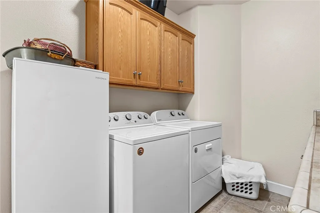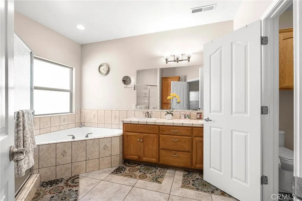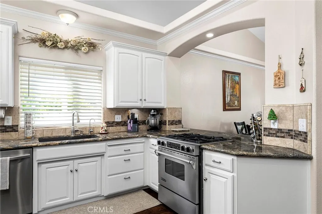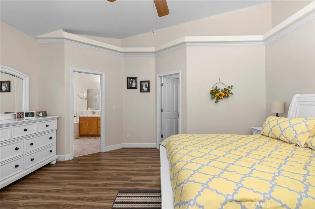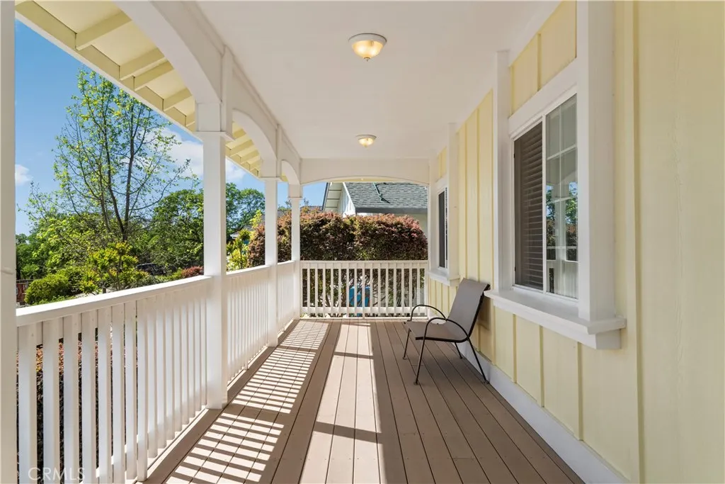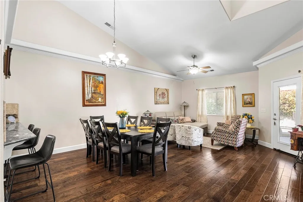 This beautiful home welcomes you with a marvelous open floor plan and soaring vaulted ceilings that make the living space feel bright, airy, and expansive. Natural light pours in, highlighting the high-end laminate wood flooring throughout the main living areas, while two bedrooms offer soft carpet for comfort and the primary suite offering updated flooring. The spacious living room features a cozy gas fireplace with a stunning built-in bookshelf, creating the perfect space to relax or gather. The kitchen is thoughtfully designed for both everyday living and entertaining, complete with granite countertops, tile backsplash, stainless steel appliances, a large pantry, two ovens for the bakers, and an eat-up bar for casual dining. The master suite is privately located on the opposite side of the home, offering a peaceful retreat. It features a spacious walk-in closet and a beautifully appointed bathroom with dual sinks, a soaking tub, and a walk-in shower with dual shower heads and updated fixtures. Both guest bedrooms are generously sized with high ceilings, and the hall bathroom includes a large vanity with double sinks and updated finishes. Step outside to a backyard designed for enjoyment, featuring a covered patio perfect for evening entertaining, raised garden beds, and mature fig and orange trees. The front of the home offers a large composite deck, ideal for sipping your morning coffee in a quiet, peaceful setting. Additional highlights include a spacious laundry room with ample storage and counter space, ceiling fans throughout, an oversized two-car garage, and a full