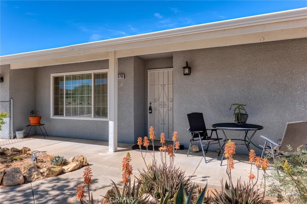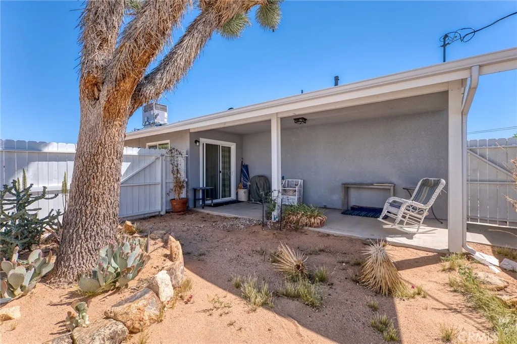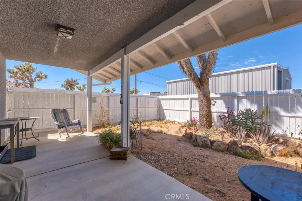 One of the cleanest and most inviting corner properties youll find, this home immediately stands out with its curb appeal, thoughtful upgrades, and private setting. The owner has taken great care in enhancing the property with a newer roof, an upgraded kitchen, improved fencing, and additional improvements throughout, adding both value and peace of mind. Featuring both front and rear fencing, including a fully enclosed backyard with privacy fencing, this property is framed by mature trees and natural desert landscaping, creating a peaceful and secluded atmosphere. Enjoy your morning coffee on the front porch or unwind in the spacious rear patio area designed for relaxing and entertaining. Step inside to a bright, vibrant interior filled with natural light, custom painted walls, unique ceiling fans, dual-pane windows, and attractive wood style flooring that flows seamlessly throughout. The dining area connects beautifully to a stunning kitchen complete with custom painted cabinetry and a stylish tile backsplash, offering both charm and functionality. A wide hallway with built-in storage cabinets adds convenience, while both bedrooms are well sized and inviting. The spacious two-car garage provides plenty of room for vehicles, storage, or workspace. Out back, the private patio area is truly special, perfect for hosting gatherings or simply enjoying quiet desert evenings under the stars. This is a hidden gem that delivers comfort, style, and privacy all in one. A must-see property that you wont want to misscome experience it for yourself today.
