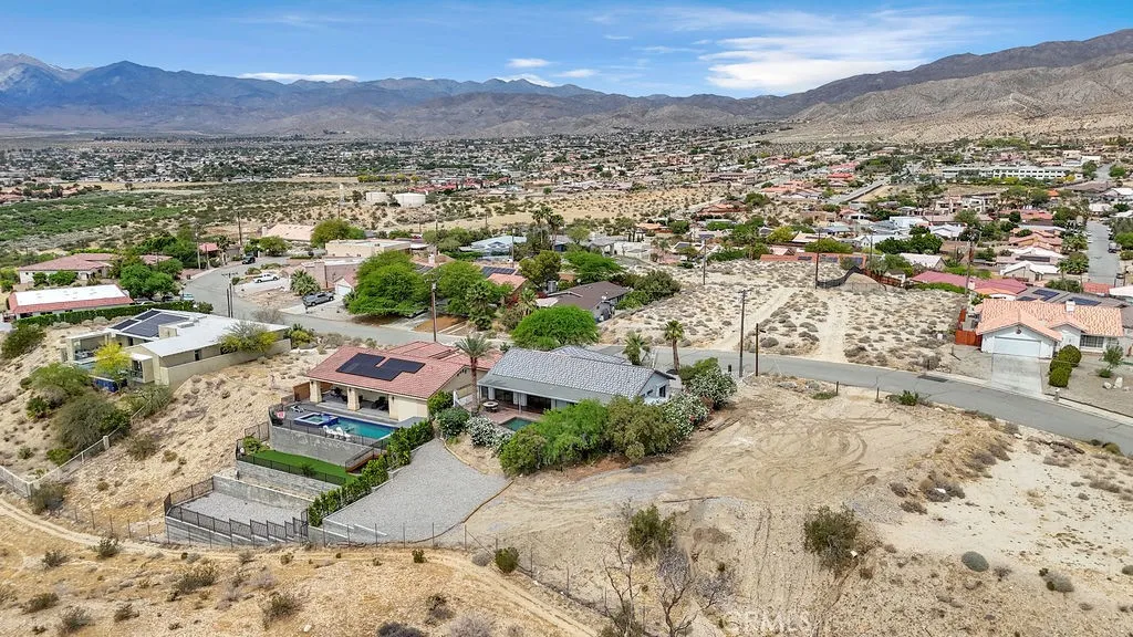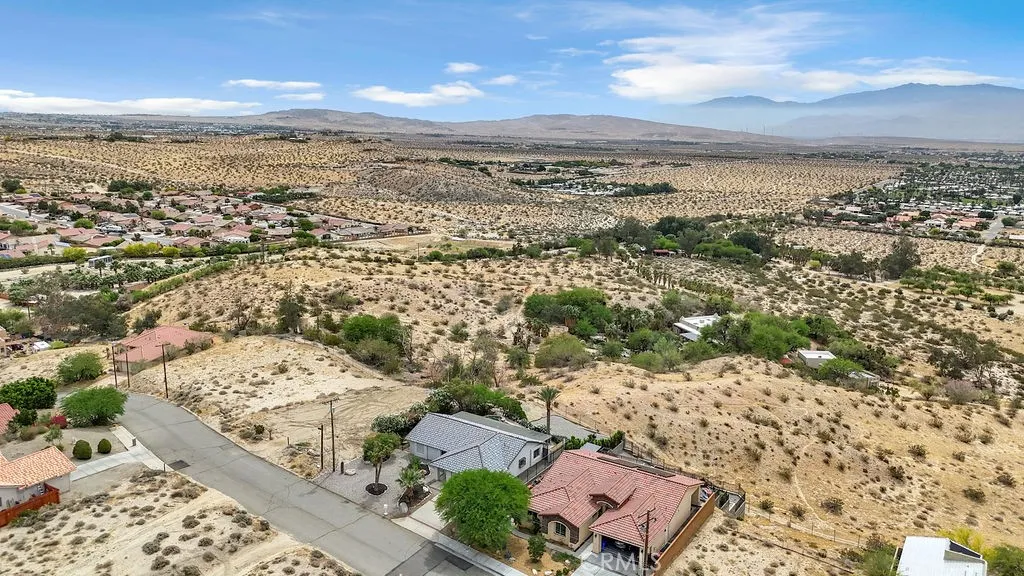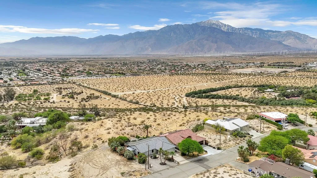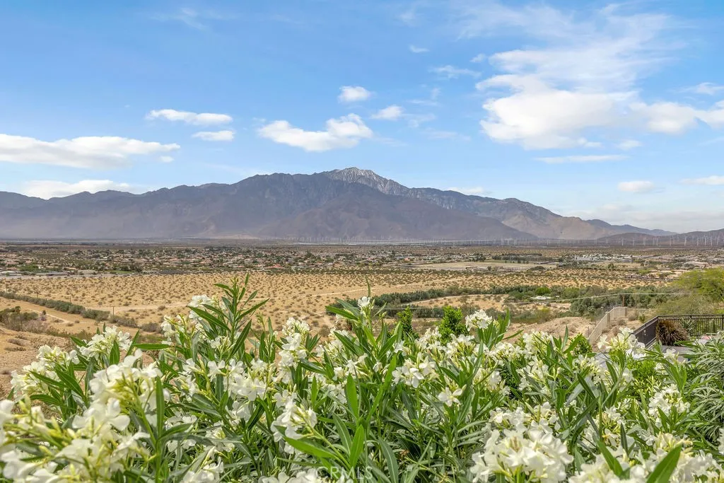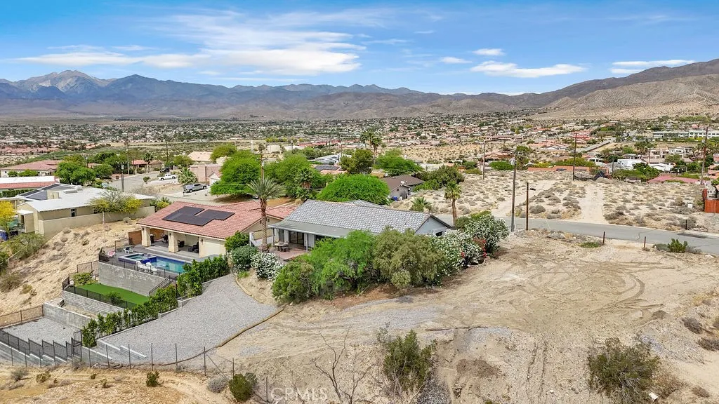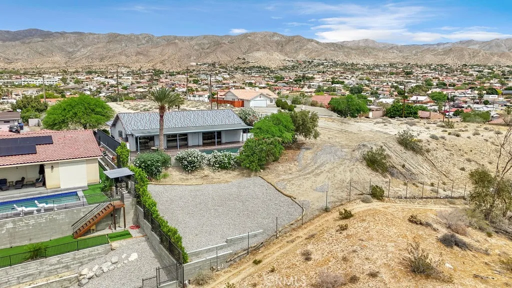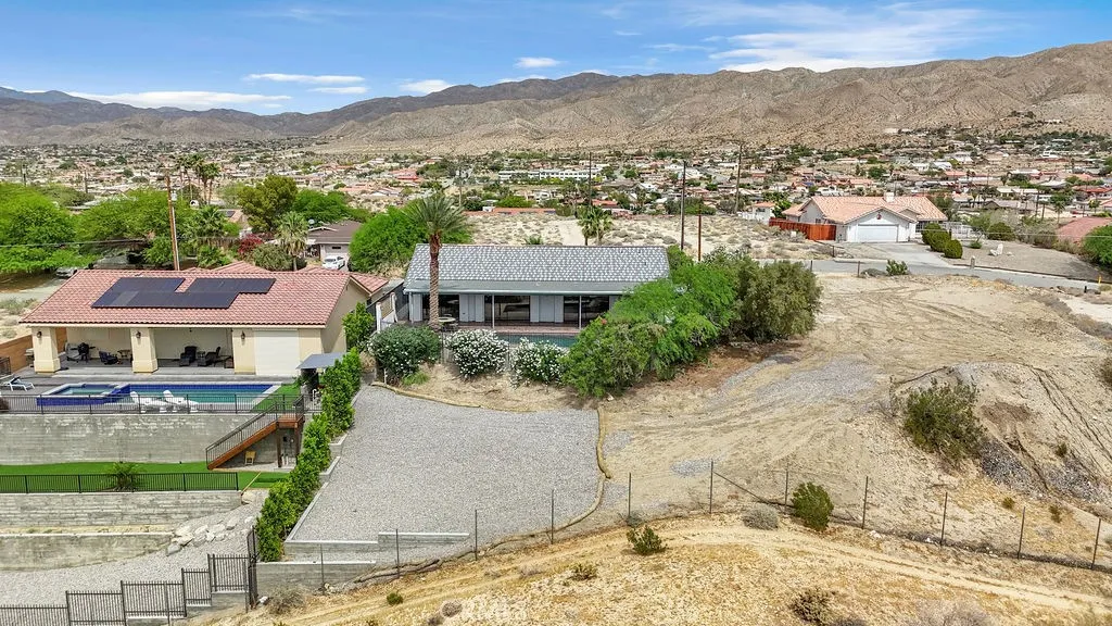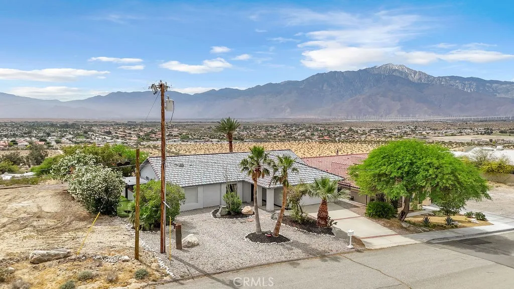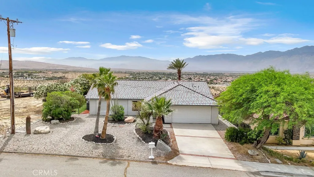 Perched atop Miracle Hill, this beautifully remodeled hilltop home offers breathtaking, unobstructed views of the San Jacinto and San Gorgonio mountain ranges. Designed for both comfort and entertaining, the backyard features a sparkling pool with spa and waterfall, extensive flatwork, stamped concrete, and a full-length covered patioperfect for enjoying the surrounding scenery and desert sunsets. Inside, the home showcases high-gloss marble-style tile flooring, a spacious living room with vaulted ceilings, and an abundance of natural light. Sliding glass doors from the living room, dining area, and primary bedroom create a seamless indoor-outdoor flow, opening directly to the pool and panoramic views. The kitchen is thoughtfully updated with antique-style cabinetry, custom stone countertops, a designer stone backsplash, and matching Samsung stainless steel appliances, including microwave, oven, refrigerator, and dishwasher. A large pantry and direct access to the garage add convenience. All bedrooms are well-appointed, with ceiling fans and updated lighting throughout the home. The secondary bedrooms feature mirrored closet doors, with one offering private patio access. The guest bathroom includes upgraded cabinetry, granite countertops, and a full tub with custom tile surround. The primary suite enjoys stunning mountain views, a spacious walk-in closet, and an en-suite bathroom with updated finishes. This exceptional property combines elevated positioning, quality upgrades, and resort-style outdoor living in a prime Desert Hot Springs location.