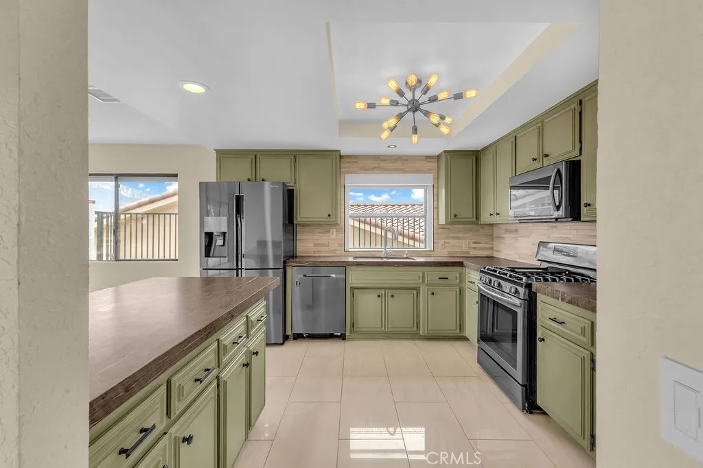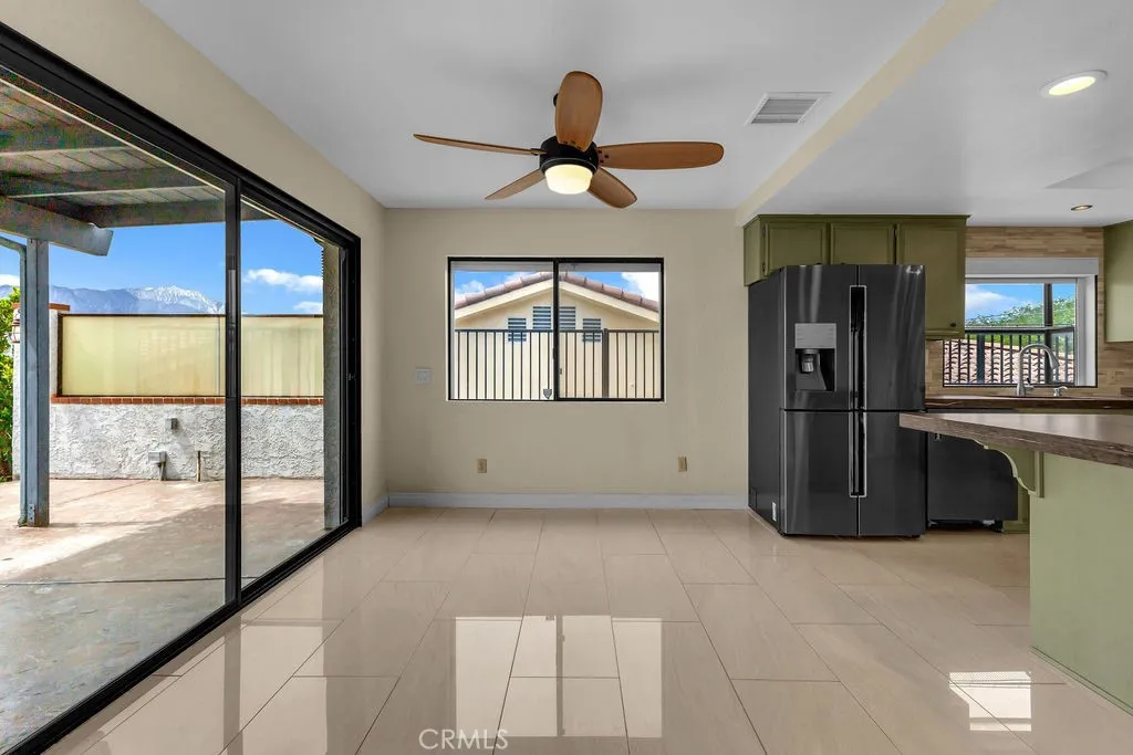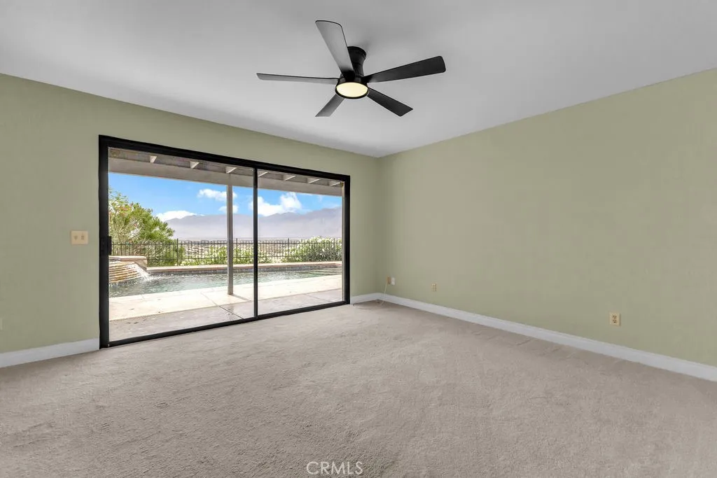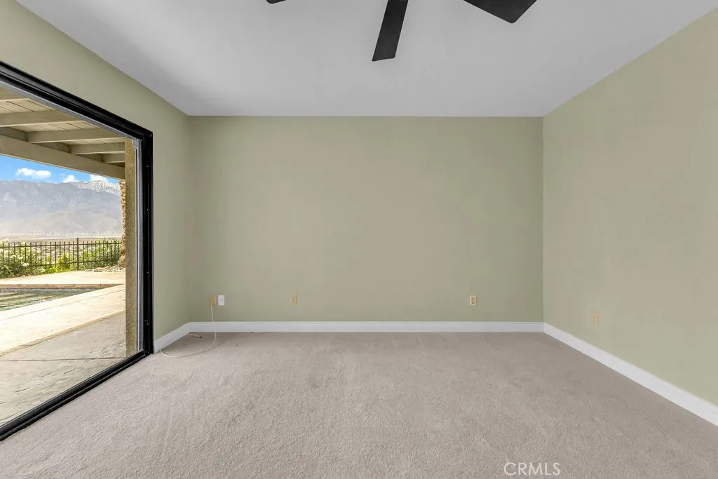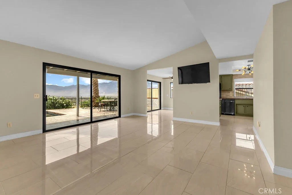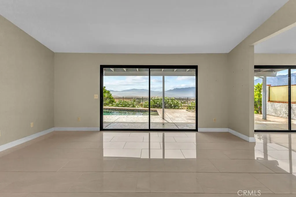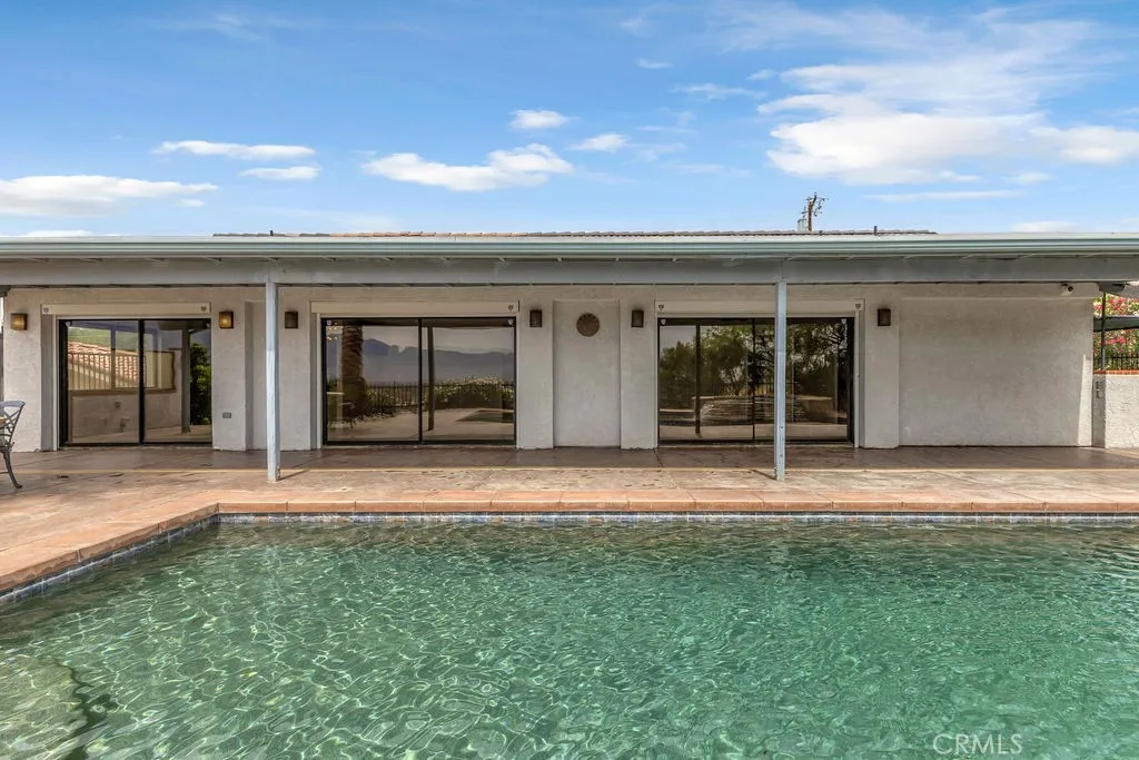 Perched atop Miracle Hill, this beautifully remodeled hilltop home offers breathtaking, unobstructed views of the San Jacinto and San Gorgonio mountain ranges. Designed for both comfort and entertaining, the backyard features a sparkling pool with spa and waterfall, extensive flatwork, stamped concrete, and a full-length covered patioperfect for enjoying the surrounding scenery and desert sunsets. Inside, the home showcases high-gloss marble-style tile flooring, a spacious living room with vaulted ceilings, and an abundance of natural light. Sliding glass doors from the living room, dining area, and primary bedroom create a seamless indoor-outdoor flow, opening directly to the pool and panoramic views. The kitchen is thoughtfully updated with antique-style cabinetry, custom stone countertops, a designer stone backsplash, and matching Samsung stainless steel appliances, including microwave, oven, refrigerator, and dishwasher. A large pantry and direct access to the garage add convenience. All bedrooms are well-appointed, with ceiling fans and updated lighting throughout the home. The secondary bedrooms feature mirrored closet doors, with one offering private patio access. The guest bathroom includes upgraded cabinetry, granite countertops, and a full tub with custom tile surround. The primary suite enjoys stunning mountain views, a spacious walk-in closet, and an en-suite bathroom with updated finishes. This exceptional property combines elevated positioning, quality upgrades, and resort-style outdoor living in a prime Desert Hot Springs location.