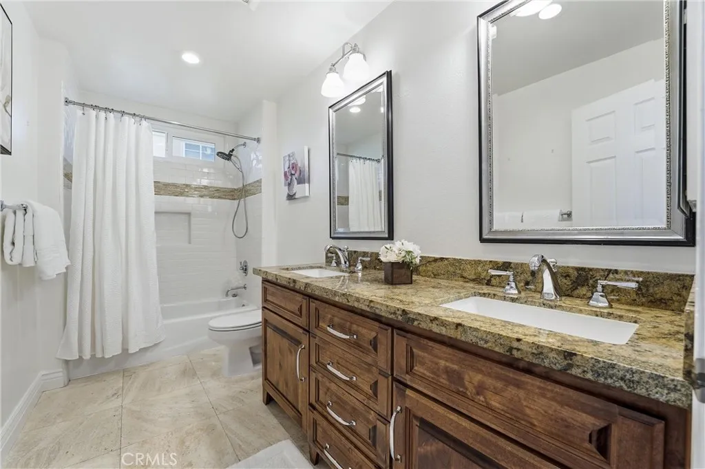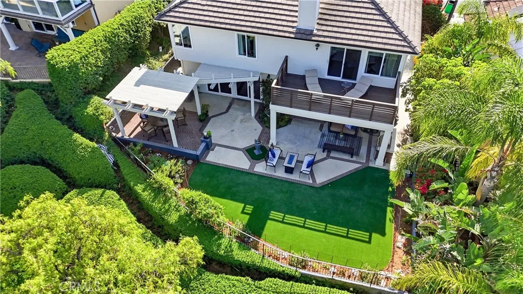 Welcome to this remodeled single-family home located in the guard-gated community of Rocking Horse Ridge in Orange, offering canyon views, a private backyard, and a functional floor plan designed for modern living. Positioned on an elevated lot with no direct rear neighbors, this home combines privacy, natural light, and access to sought-after community amenities including a 24-hour guard gate, pool, spa, clubhouse, park, pickleball, and tennis courts. The interior features a remodeled kitchen with custom wood cabinetry, granite countertops, stainless steel appliances, and a center island that opens to the family room and backyard. Multiple living spaces include a formal living room and a separate family room with exposed wood beam ceilings, a stone fireplace, and wired surround sound. Real hardwood flooring and travertine tile run throughout, complemented by recessed lighting and all new interior paint. Additional upgrades include double pane windows, a whole house fan, and a full repipe completed by previous owners. The primary suite offers canyon views, a private balcony, fireplace, and ample space for a retreat-style setting. An optional fifth bedroom or loft provides flexibility for a home office, guest space, or additional living area. The backyard is designed for both entertaining and everyday use, featuring a covered patio with lighting, built-in BBQ, seating areas, artificial turf, and a new irrigation system (2025). A fenced dog run adds additional functionality. The elevated lot enhances both privacy and view orientation. Additional features include an epoxy-coat