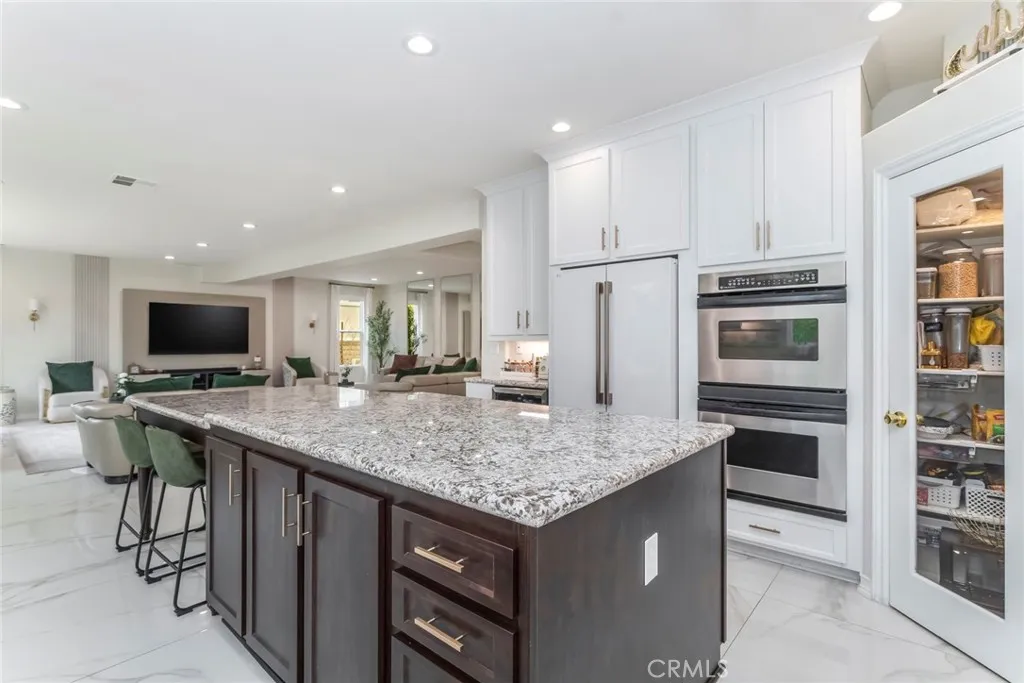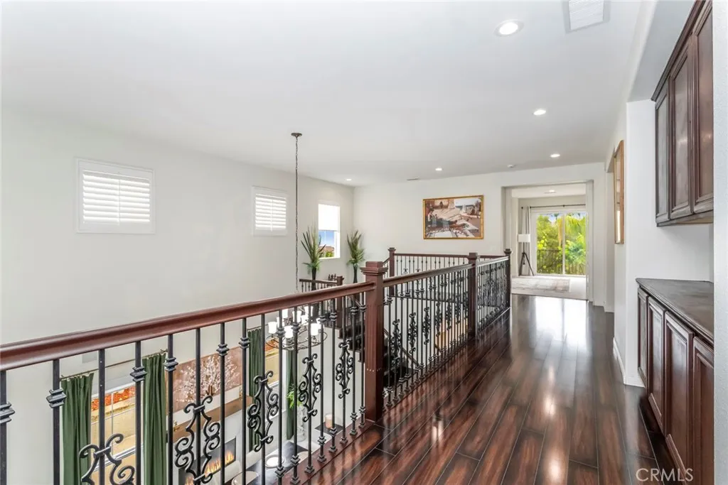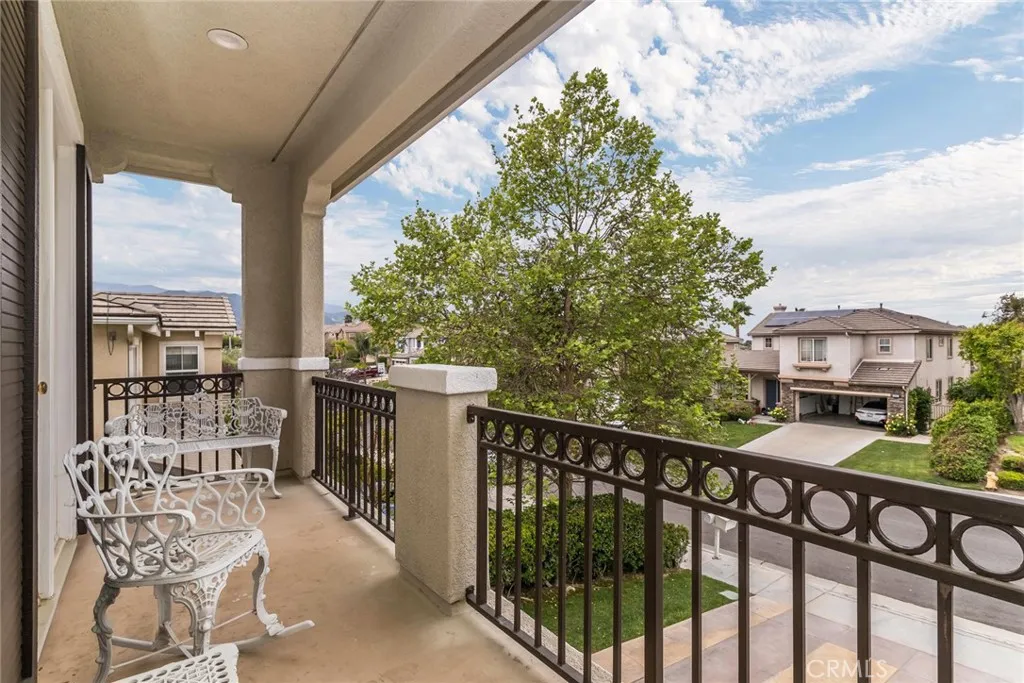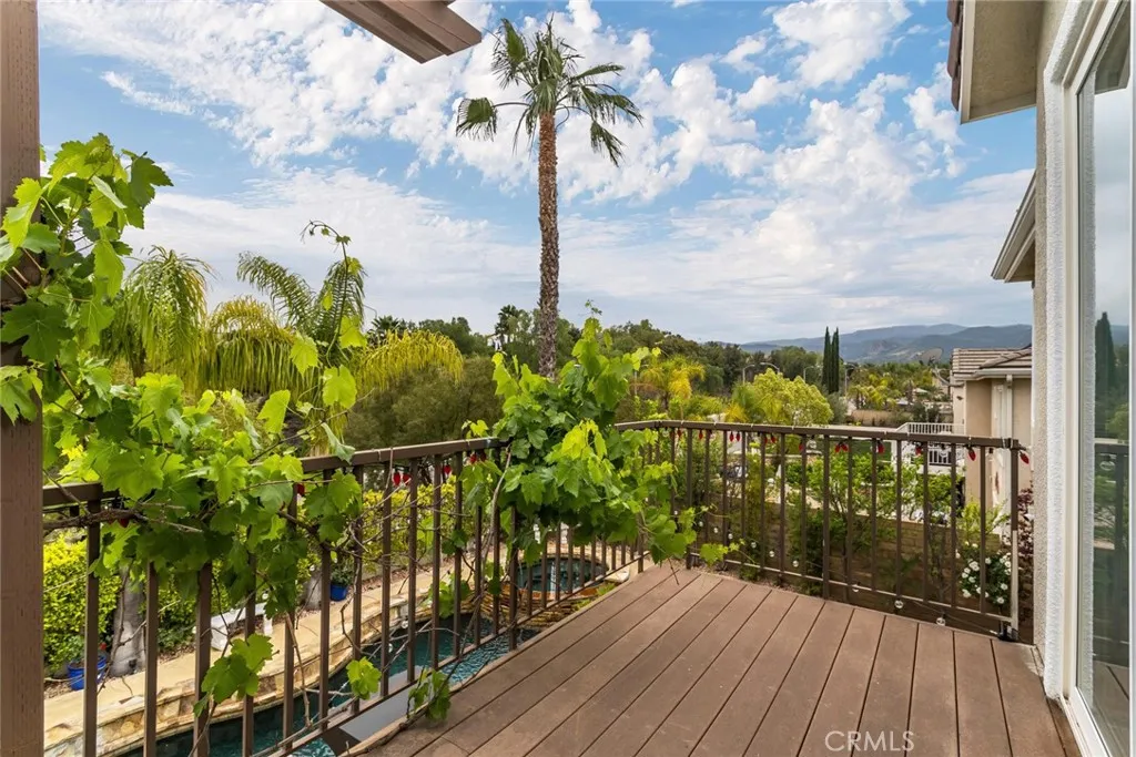 Welcome to this stunning Executive Pool Home, ideally situated at the end of a beautiful cul-de-sac in upper Stevenson Ranch in the highly desired Twilight Vista tract. From the moment you arrive, the home makes a lasting impression with exceptional curb appeal, highlighted by a private courtyard with professional landscaping and tranquil fountains. Through the grand double doors you will find a breathtaking formal entry, where soaring ceilings and a dramatic wrought-iron staircase create a striking focal point. Rich marble-inspired 20 x 20 tile flooring spans the lower level, while the upper level is beautifully finished with warm wood flooring, creating a cohesive blend of elegance and comfort throughout. Spanning nearly 3600 sq ft, the expansive floor plan features 5 bedrooms, 5 baths, a huge great room, formal dining, office nook and upstairs laundry. The expanded great room includes modern wood slat wall detail, ambiance lighting and tons of windows filling the space with natural light. At the center of it all, the newly updated kitchen impresses with an oversized center island, white shaker cabinetry, gorgeous granite counters, walk in pantry, stainless appliances, and modern hardware. The space opens seamlessly to the inviting great room perfect for hosting large gatherings. The main level also features a generously sized bedroom and a private full bath, ideal for guests, multigenerational living, or a home office. Upstairs, the primary suite offers a true retreat, complete with a private balcony capturing sweeping views of Stevenson Ranch and the surrounding mountai