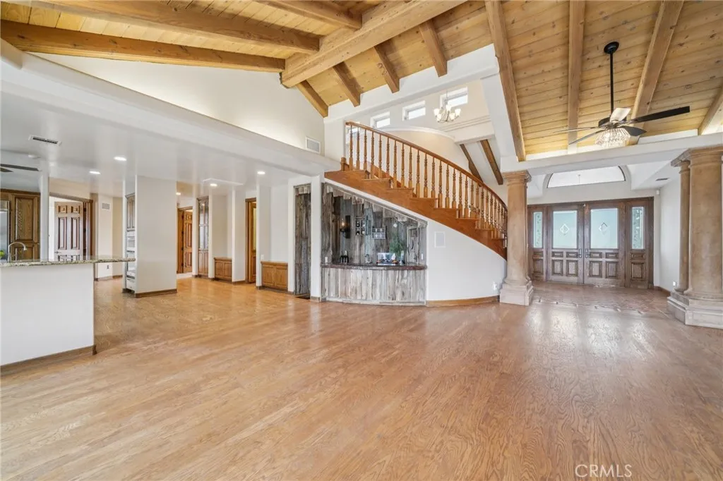 Experience elevated country living in this extraordinary equestrian estate in the prestigious La Cresta community. Set on 5.55 scenic acres, this one-of-a-kind property captures sweeping panoramic views from nearly every room and offers an unmatched blend of luxury, versatility, and lifestyle. Beyond the grand double-door entry, a dramatic foyer with terra cotta tile leads to elegant formal living and dining spaces featuring marble flooring, soaring wood-beamed ceilings, and expansive windows framing breathtaking mountain and garden vistas. The impressive family room is designed for gathering, complete with a fireplace, custom built-ins, rich wood flooring, and French doors that open to the outdoor living areas. The chefs kitchen offers granite countertops, a large center island, ample cabinetry, and picturesque views. Multiple flexible spacesincluding a private office, den, and spa roomprovide endless options for work, relaxation, and entertaining. The luxurious primary suite is a private retreat with a fireplace, dedicated office, outdoor access, and a spa-inspired bathroom featuring a soaking tub, dual vanities, and dual walk-in closets. Upstairs, dual staircases lead to a spacious loft, three additional bedrooms, and a large view balcony. Designed for multi-generational living or income potential, the property includes a studio casita with full bath and kitchenette, as well as a converted caretakers residence attached to the barn with its own living space, kitchen, and bedrooms. Equestrian and outdoor amenities abound, including a 5-stall barn, RV garage, fenced pool wi