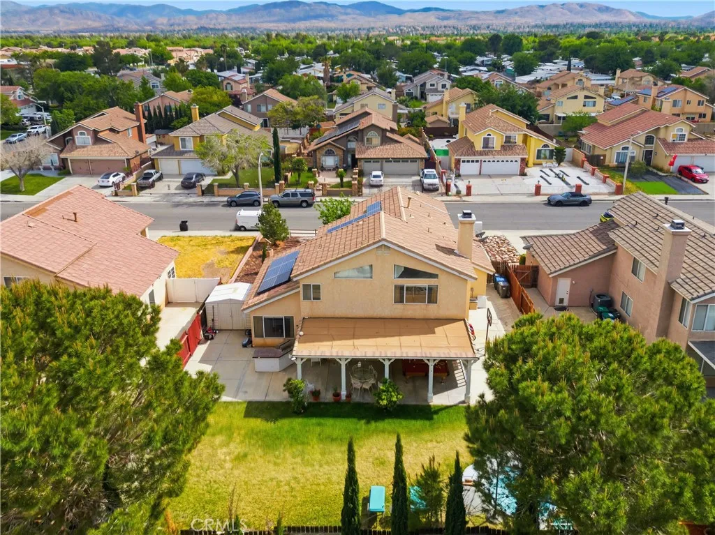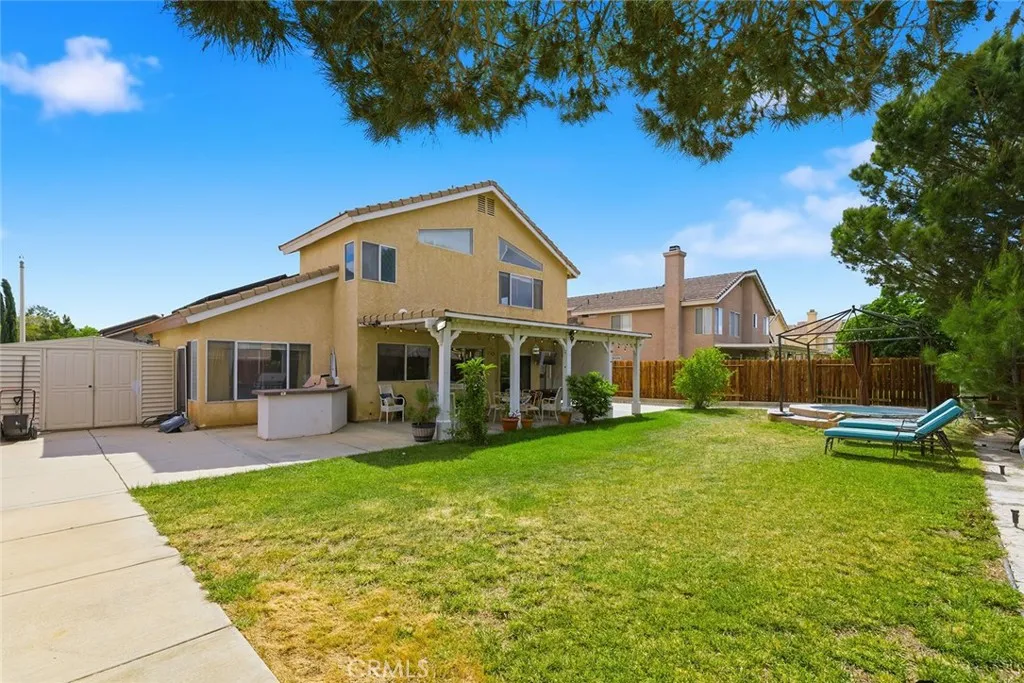 Spacious two-story home in Palmdale featuring 4 bedrooms and 3 full bathrooms, offering 1,929 sq ft of comfortable living space on a 7,335 sq ft lot. This well-maintained residence showcases high and cathedral ceilings, abundant natural light, and a functional floor plan ideal for everyday living and entertaining. The recently updated kitchen features a center island with ample cabinetry and opens to the family and living areas, complete with a fireplace. From the living room, a sliding glass door creates a seamless indoor-outdoor flow, enhancing the homes open and airy feel. Recently updated bathrooms add to the homes modern appeal. Designed with efficiency in mind, the home includes a solar energy system and dual pane windows ideal for Palmdales seasonal temperature extremes helping provide added comfort and potential utility savings year-round. Additional highlights include wood laminate flooring, central heating and air conditioning, and full copper plumbing. The attached garage offers a versatile flex space, currently set up as an insulated room ideal for a home office, gym, or creative space, with the option to convert back to a full three-car garage configuration. The property also features a spacious backyard designed for enjoyment and entertaining, complete with a built-in BBQ area, in-ground wading pool, and additional storage shed. Ample parking is available with an extended driveway, including potential RV parking. Conveniently located near shopping, schools, and commuter routes, this home offers comfort, flexibility, and accessibility.