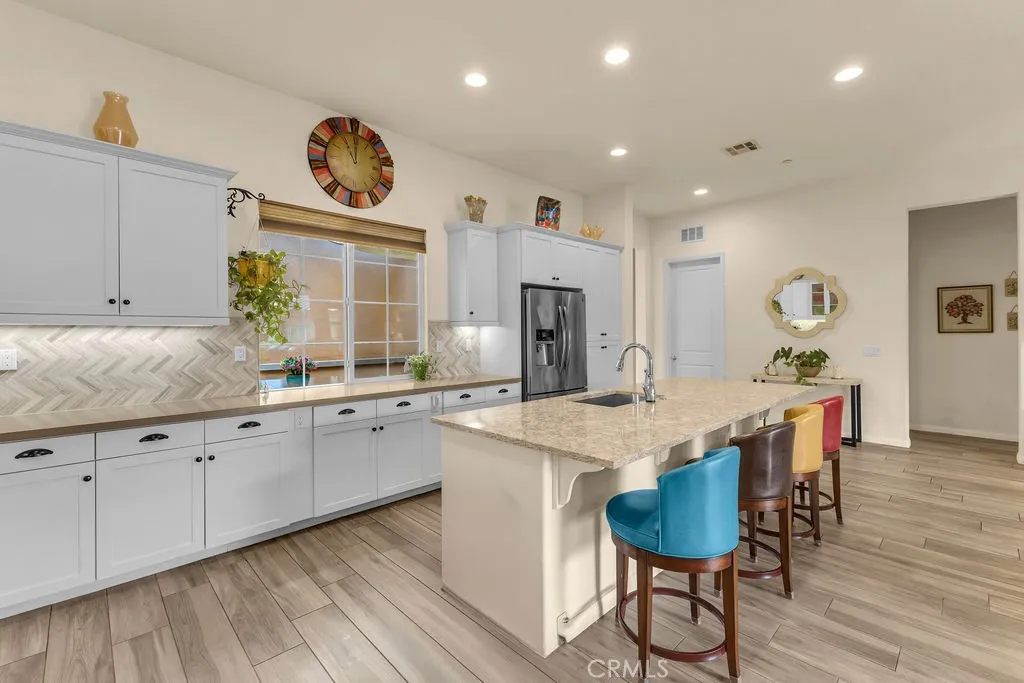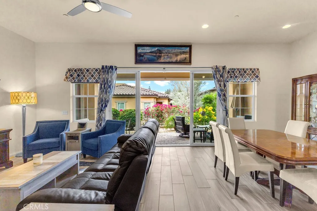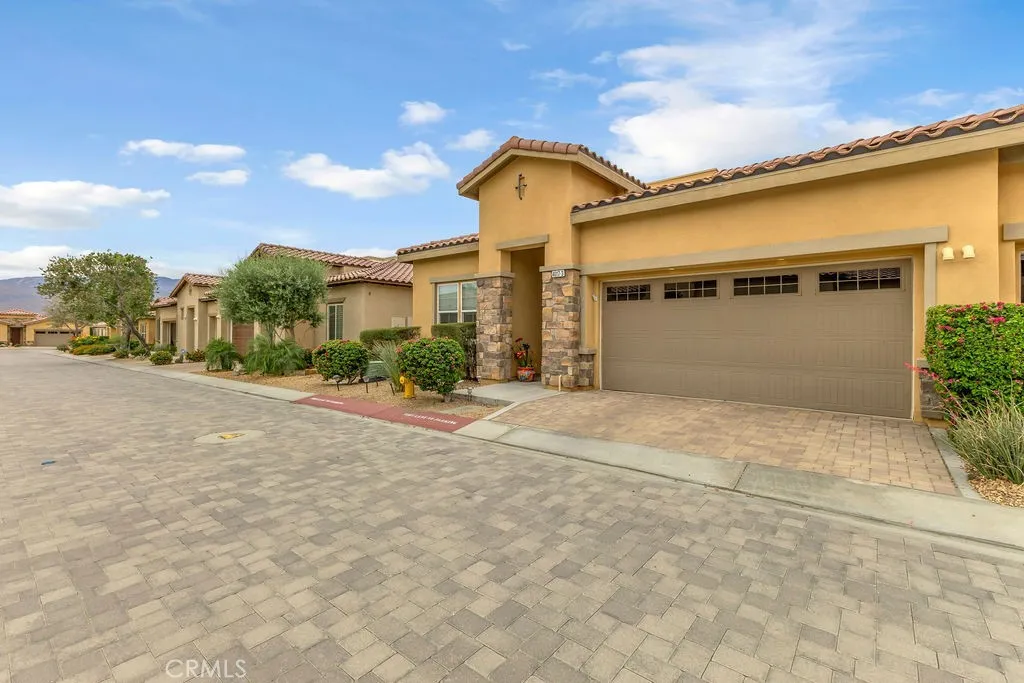 Turnkey furnished Granada model in the highly sought after 55+ community of Villa Portofino. This beautifully maintained 3 bedroom, 2 bath home offers 1,926 sq ft of thoughtfully designed living space, featuring a rare interior courtyard style outdoor area in addition to a private rear patio, creating multiple spaces to relax, entertain, or enjoy quiet desert mornings. The open concept floor plan seamlessly connects the kitchen, dining, and living areas, filled with natural light and designed for both everyday living and hosting. Offered optionally fully furnished, this home provides a seamless move in experience. The kitchen features abundant cabinetry, generous counter space, and a large island that anchors the heart of the home. The spacious primary suite offers a peaceful retreat with dual vanities, a soaking tub, separate walk in shower, and a generous walk in closet. Two additional bedrooms provide flexibility for guests, a home office, or hobbies. Upgrades include wood look tile flooring, carpet in bedrooms, a tankless water heater, EV charger, and solar for energy efficiency. The HOA covers landscaping and cable, allowing for easy, low maintenance living. Villa Portofino residents enjoy resort style amenities including a clubhouse, fitness center, pool, social events, and more. Offered furnished per inventory, this home is move in ready and ideal for full time living or a seasonal getaway.