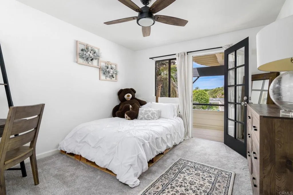 Designed by a renowned local architect, this contemporary home sits on a quiet Muirlands cul-de-sac with peek ocean views from multiple vantage points. Curved architecture and soaring cathedral ceilings with exposed wood beam trusses define the home's dramatic character. The main level features an open living and dining area anchored by a stacked stone fireplace, with French doors leading to one of several private balconies. The kitchen showcases walnut flat-panel cabinetry, a calacatta-style quartz waterfall island with cooktop, built-in wall oven, and an arched beam ceiling that mirrors the home's sculptural lines. The primary suite offers an elevated sleeping area, a second stacked stone fireplace, in-ceiling speakers, and balcony access with sunset views. The renovated primary bath includes dual sinks, a vanity area, and standalone shower. Three additional bedrooms and two renovated bathrooms with ample counter space round out the home. A lower level with its own private entrance features a second living area, wet bar, and flexible space to suit any lifestyle.Recent upgrades include a new roof, HVAC with multiple zoned controls, whole-home data wiring, Bose in-ceiling sound, Belgard hardscape, new deck and staircase, recessed lighting, new carpet, freshly painted inside and out, and epoxy-finished garage floors. Bold architecture paired with thoughtful, modern upgrades this is La Jolla living at its finest, just minutes from world-class beaches, dining, and the Village.