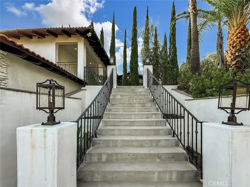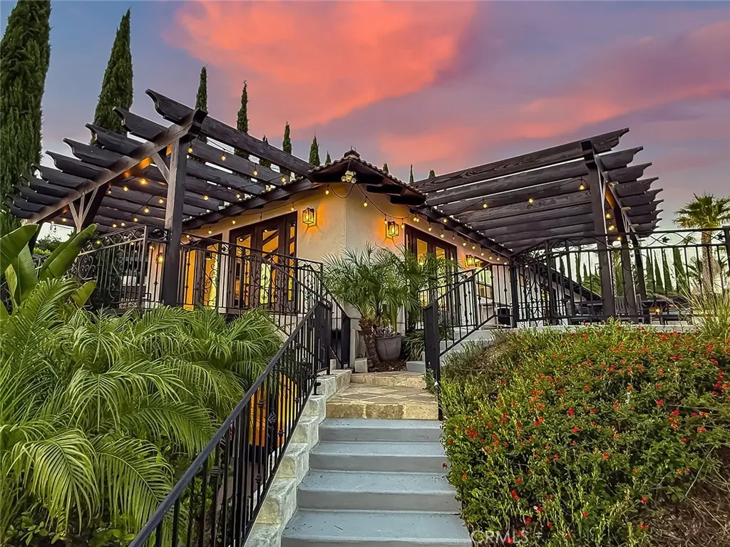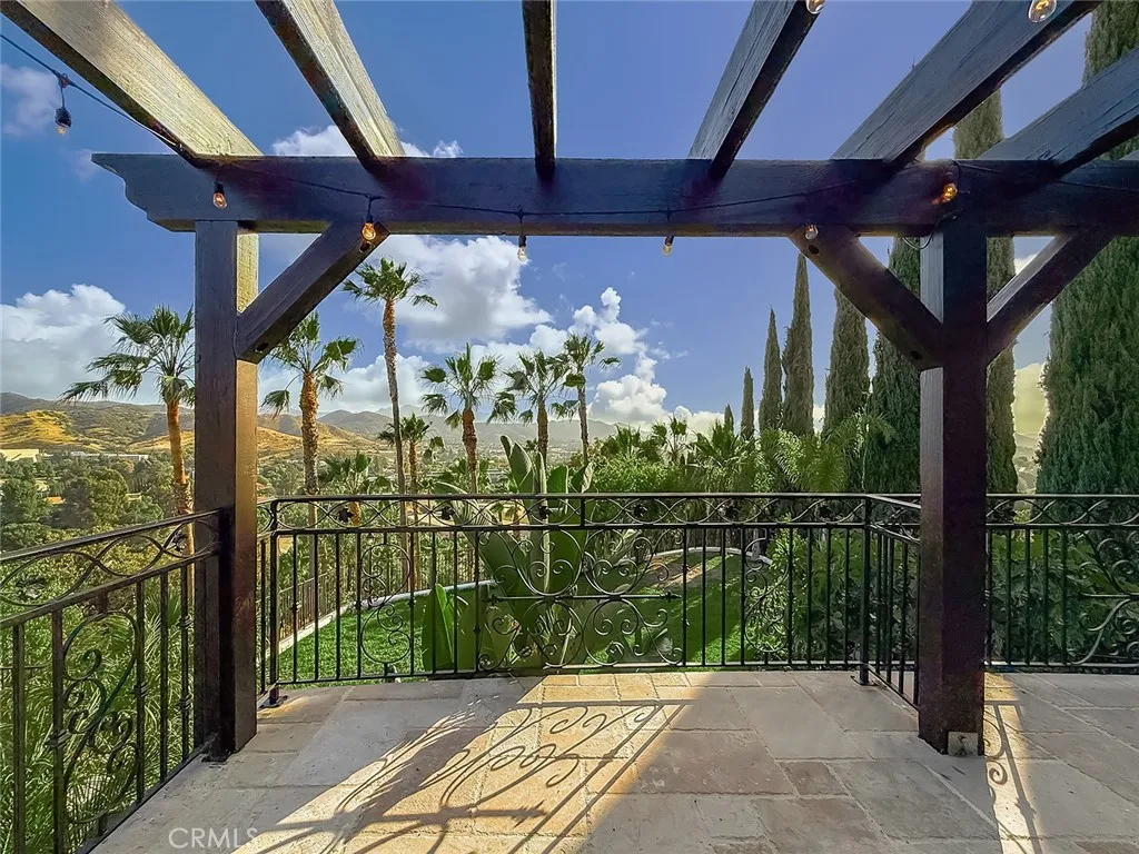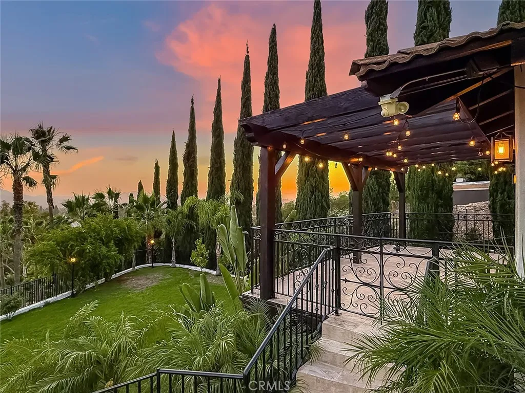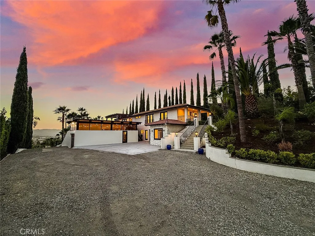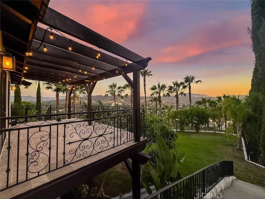 Luxury Live Auction! Bidding to start from $1,700,000! One-of-a-kind Spanish Hacienda estate with sweeping mountain and city views, privately gated and surrounded by mature Mediterranean landscaping on a fully fenced acre. The gourmet kitchen features granite countertops, stainless steel appliances, and a walk in pantry that flows into the dining area and living room with a custom fireplace. Three sets of French doors open to dual patios overlooking the lush grounds and capturing stunning sunrise and sunset views. The spacious primary suite includes dual closets, scenic views, and a spa inspired bathroom with soaking tub, frameless glass shower, and dual sinks. The lower level is designed for entertaining with a large family room, fireplace, full size custom wet bar, and direct access to the backyard. Two additional bedrooms on this level each include private ensuite bathrooms. A rare four car garage with tandem workspace is ideal for car enthusiasts and features an in ground hydraulic lift, compressor, engine hoist, and built in steel cabinetry. Additional upgrades include custom windows and doors, smooth stucco, updated plumbing, and HVAC. Zoned RE20 with space for horses, chickens, and gardening, the property includes a custom chicken coop and plenty of room for farm to table living. Conveniently located near mountain trails, shopping, dining, the 23 and 101 freeways, and Conejo Valley schools!
