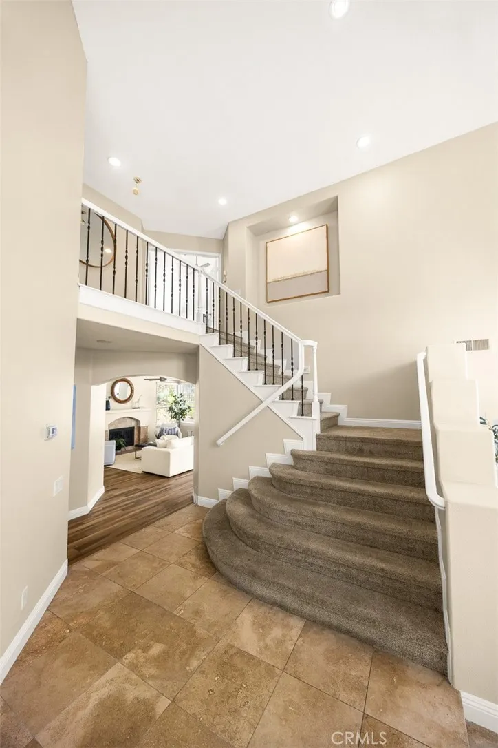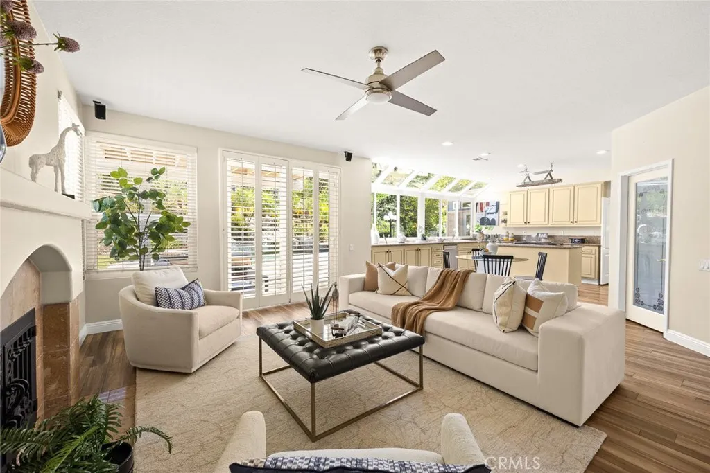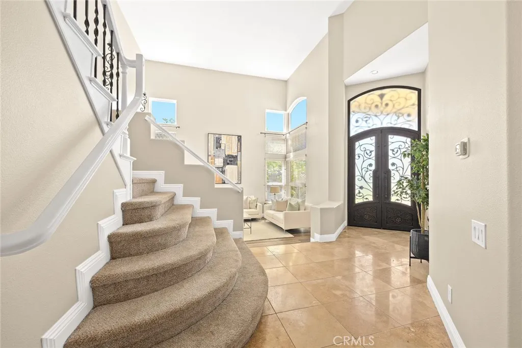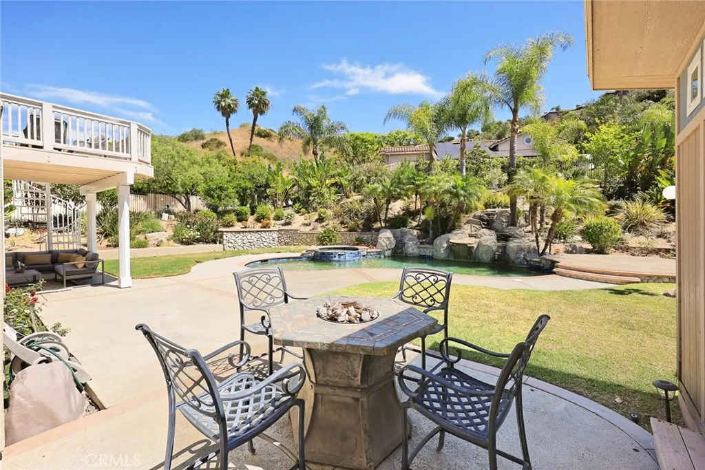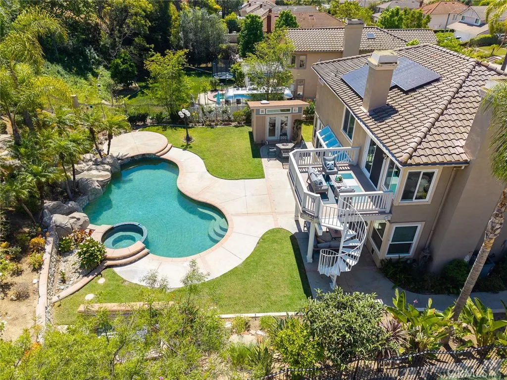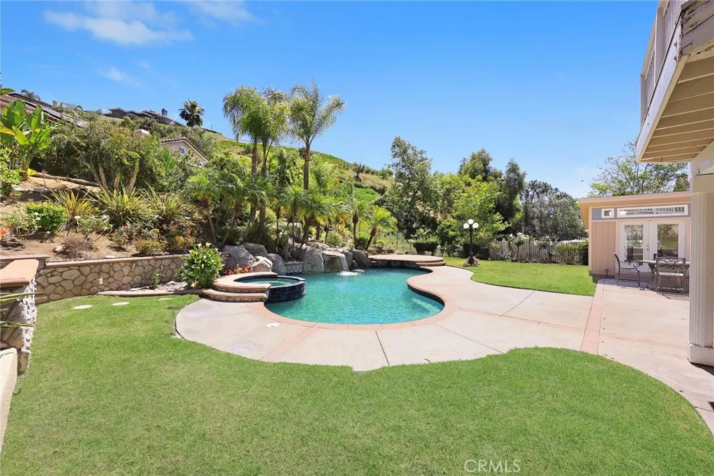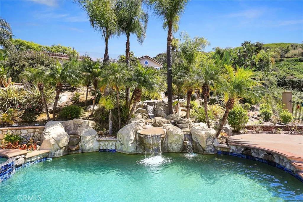 Nestled on one of Yorba Lindas most picturesque streets, this stunning 5-bedroom, 3.5-bath pool and spa residence offers the perfect blend of elegance, comfort, and resort-style living. From its exceptional curb appeal to the breathtaking backyard, every detail is designed to impress. Step through custom iron and natural wood double doors into a dramatic cathedral-ceiling living room, where soaring ceilings, rich wood flooring, and stone accents create a grand first impression. The formal dining room flows seamlessly to the outdoors, capturing serene views of the lush landscaping and sparkling pool. The gourmet kitchen is both stylish and functional, featuring granite countertops, a large center island, walk-in pantry, and expansive windows that flood the space with natural light while framing tranquil views of cascading waterfalls. Open to the kitchen, the inviting family room offers a cozy gas fireplace, custom French doors, and direct access to the backyardperfect for effortless indoor-outdoor living. A highly desirable main-level ensuite bedroom, along with a guest powder room, provides ideal flexibility for guests or multi-generational living. Upstairs, the luxurious primary suite serves as a private retreat, complete with a balcony overlooking the resort-style backyard, a dual-sided fireplace shared with a sitting area, two walk-in closets, and a spa-inspired bath featuring a jetted tub, separate shower, and dual vanities. Additional bedrooms include two connected by a Jack-and-Jill bathroom, plus another bedroom and full bath. The backyard is a true showpiecea tropic