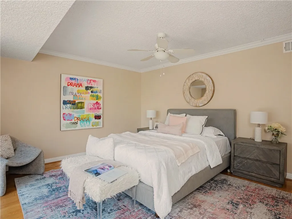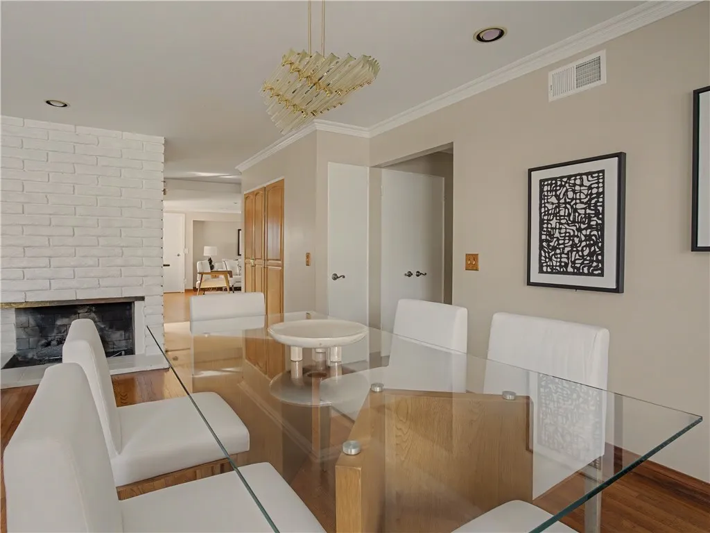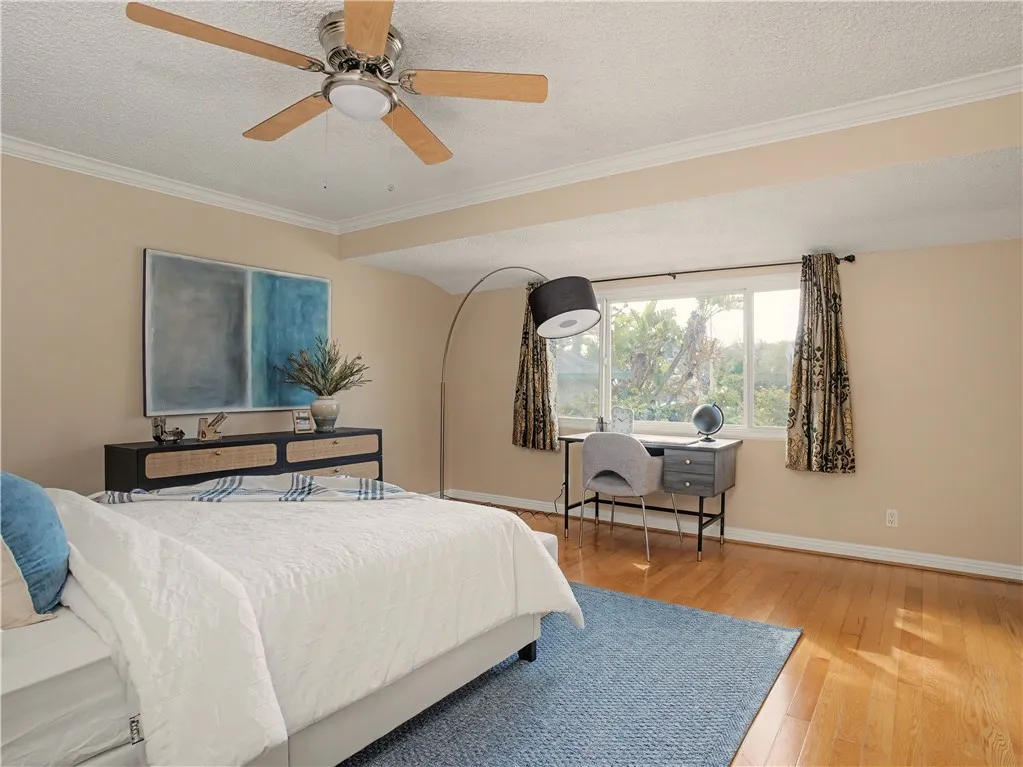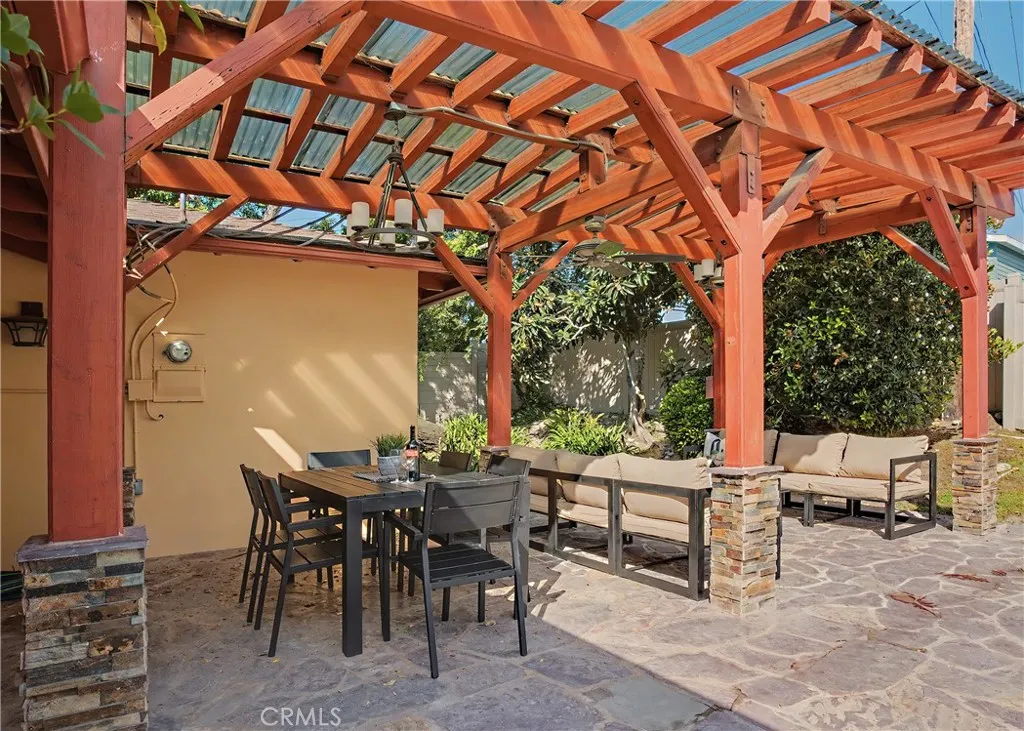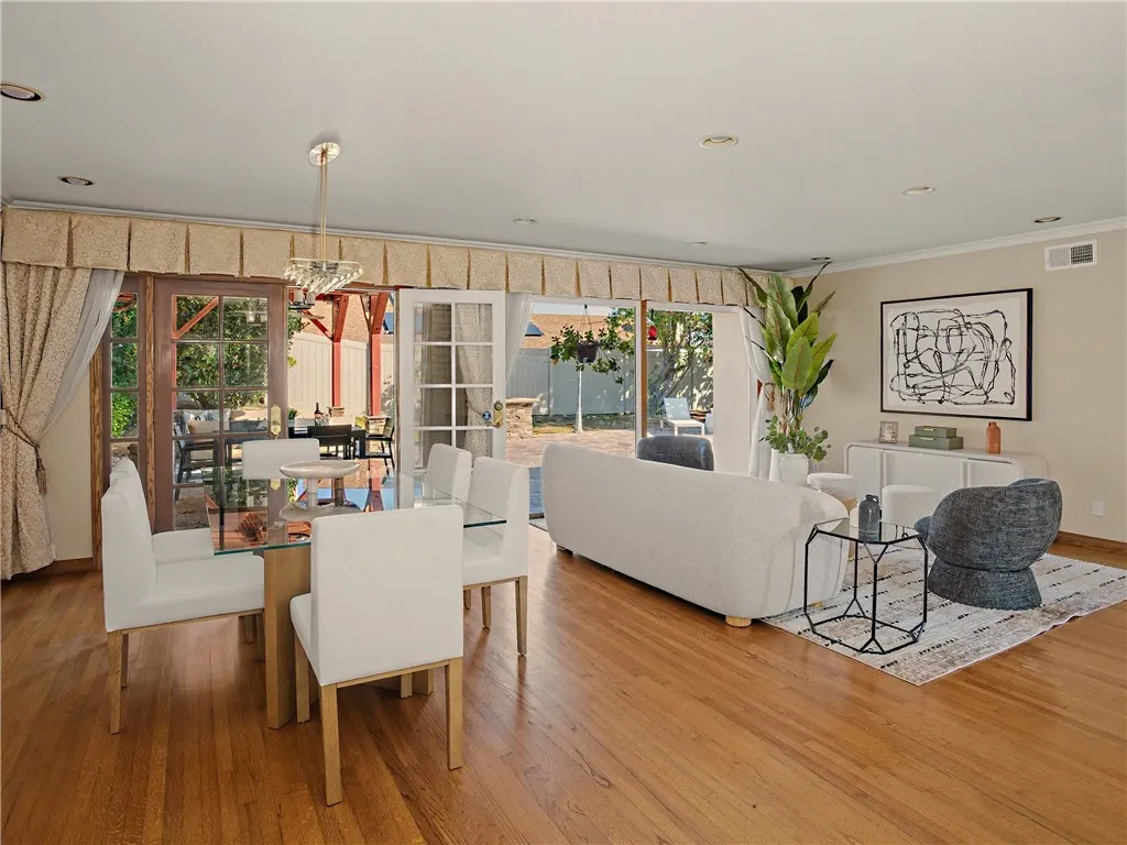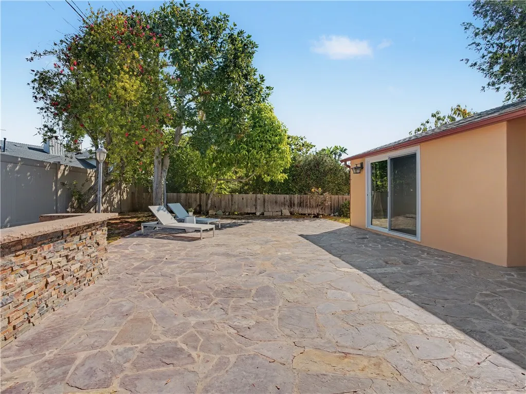 Beautifully updated turn-key spacious single level home with 4 bedrooms, 3 baths, and Living/Dining and Family areas. The home has hardwood floors, crown molding, granite counters and double pane windows/doors throughout for a sunlit, natural ambience. Its efficient layout is designed to enjoy flowing indoor/outdoor living. Enter into the Living/Dining room that opens to French doors to a custom-built backyard entertaining area with a huge slate patio, barbecue station to put your own appliance, and large covered pergola with lights, fan, and new privacy vinyl fence. A full glass wall in the Living Room/Dining area overlooks the patio and completes the indoor/outdoor feeling. Sunny Kitchen with granite counters, breakfast bar, breakfast nook area, wood cabinetry, built-in fridge and new flooring. Family Room off the kitchen opens to a sunny and private brick patio. Large Primary Suite with an entire wall of built-in closets/cabinets and primary bath with walk-in shower. Of the 3 additional bedrooms, 2 are primary-size bedrooms. The large rear-bedroom opens onto the slate patio through a new 8-feet double-paned sliding door. The whimsical fourth bedroom is perfect for a child's room or a home-office, and opens to the private brick patio. All 3 bathrooms are updated, with granite counters, and one with a double sink. The two-car finished garage off the Family Room with built-in cabinetry could be flex room for exercise, office, game room, etc. Laundry area is located here. This home has great curb-appeal with new paint in and out, a new roof, newly refinished wood floors, gra