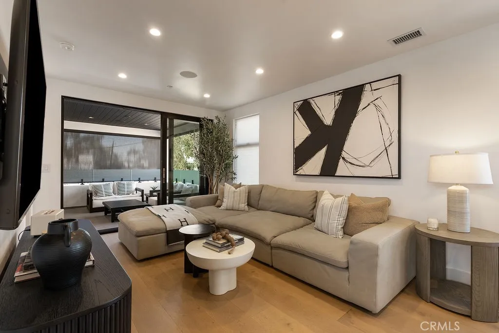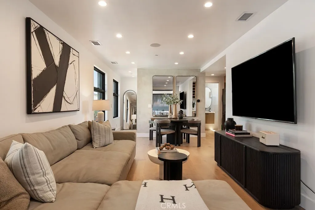 Located within the coveted Flower Streets of Corona del Mars Village, 521 Iris Avenue presents a rare opportunity to own a brand-new coastal residence just moments from the areas best beaches, dining, and boutique shopping. Built in 2024, this thoughtfully designed back unit spans approximately 1,100 square feet across three levels, offering 2 bedrooms and 2.5 bathrooms with a seamless blend of modern design and everyday functionality. The open-concept main level connects the living and dining areas to a chef-inspired kitchen, all flowing effortlessly to a covered deckideal for indoor-outdoor living. The kitchen is appointed with quartz countertops, white oak cabinetry, Thermador appliances including a built-in refrigerator, open shelving, and a pot filler, delivering both style and performance. Throughout the home, wide-plank white oak flooring, vaulted ceilings, custom tilework, accent walls, and integrated indoor-outdoor audio create a clean, elevated aesthetic. Upstairs, the primary suite serves as a private retreat, complete with its own balcony, walk-in closet, dual sinks, and a floating vanity. A rooftop patio crowns the home, offering panoramic city-light views and an ideal setting for relaxing or entertaining. Additional highlights include a one-car garage with epoxy flooring and a modern glass roll-up door, along with a covered parking space for added convenience. Perfectly positioned in the heart of the Village, the home is just blocks from the beach and within close proximity to Fashion Island, Laguna Beach, top-rated schools, and the vibrant coastal lifestyle