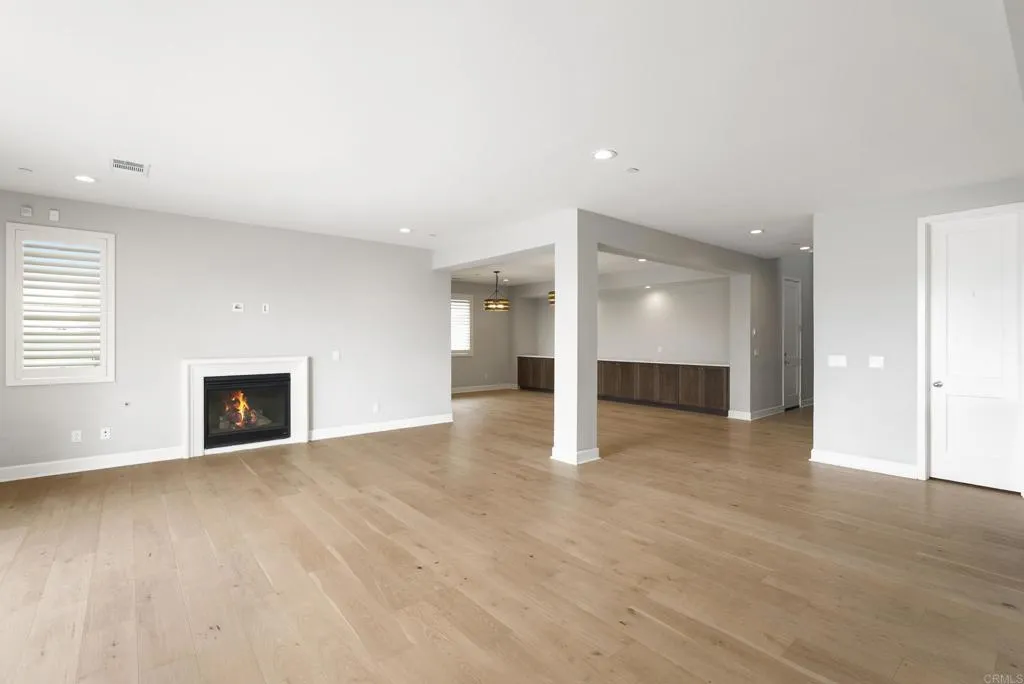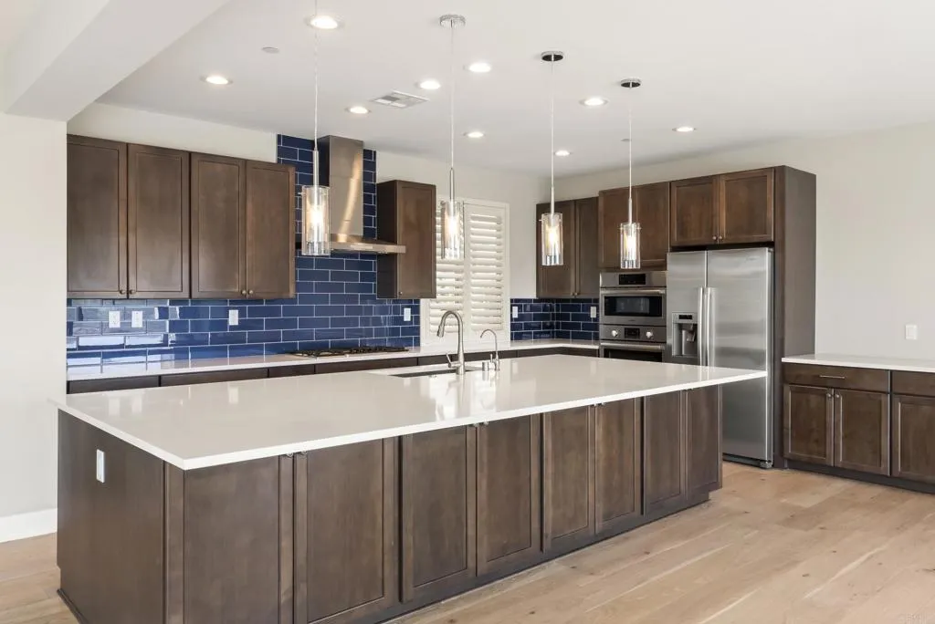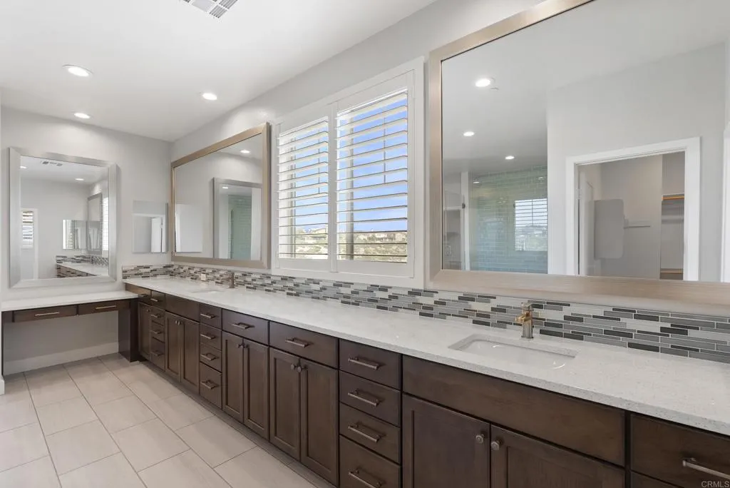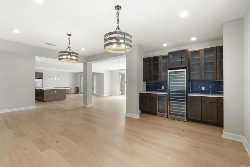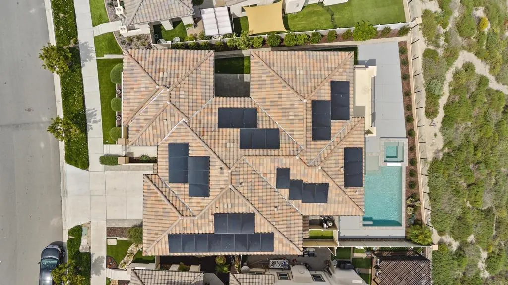 Perfectly positioned on a premier view lot with open canyon and mountain views, this extensively upgraded 5-bedroom, 4.5-bath residence offers 4,118 sq ft, an attached casita with its own private entrance, pool/spa, and owned solar with battery storage. A dramatic two-story foyer introduces volume and natural light, leading into the heart of the home, where wide-plank hardwood floors connect the kitchen, family room, and dining areas. The kitchen is centered around an expansive island and features quartz countertops, Bosch appliances, walk-in pantry, and spacious daily dining area. Formal dining room is scaled for larger gatherings and anchored by a built-in buffet and dedicated bar area with wine refrigerators. Family room features a gas fireplace and opens to the outdoor living areas. Attached casita offers a private exterior entrance and dedicated patio that includes an open living space, walk-in closet, bath with walk-in shower, and kitchenette and also connects to the main home. Half bath completes the main level. Upstairs, the primary suite includes built-in cabinetry with a beverage refrigerator and opens to a private deck with stunning views. Spa-inspired bath includes dual vanities, soaking tub, an oversized walk-in shower with bench and dual shower heads, and two walk-in closets. Two additional bedrooms share a Jack and Jill bath, and an ensuite bedroom offers its own private bath. Laundry room completes the upper level. Outdoors, the California room extends the living area, complete with fireplace, ceiling fan, recessed lighting, and motorized drop-down screens.