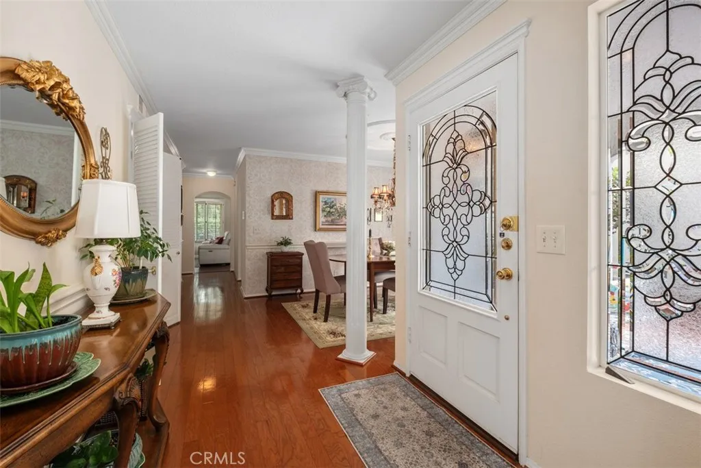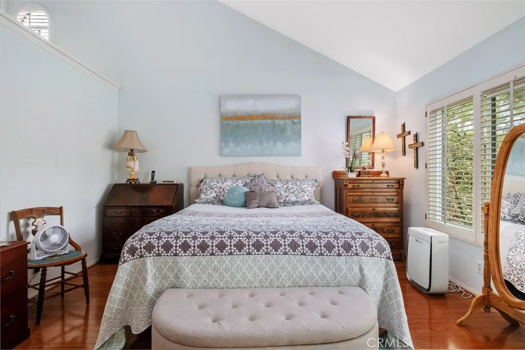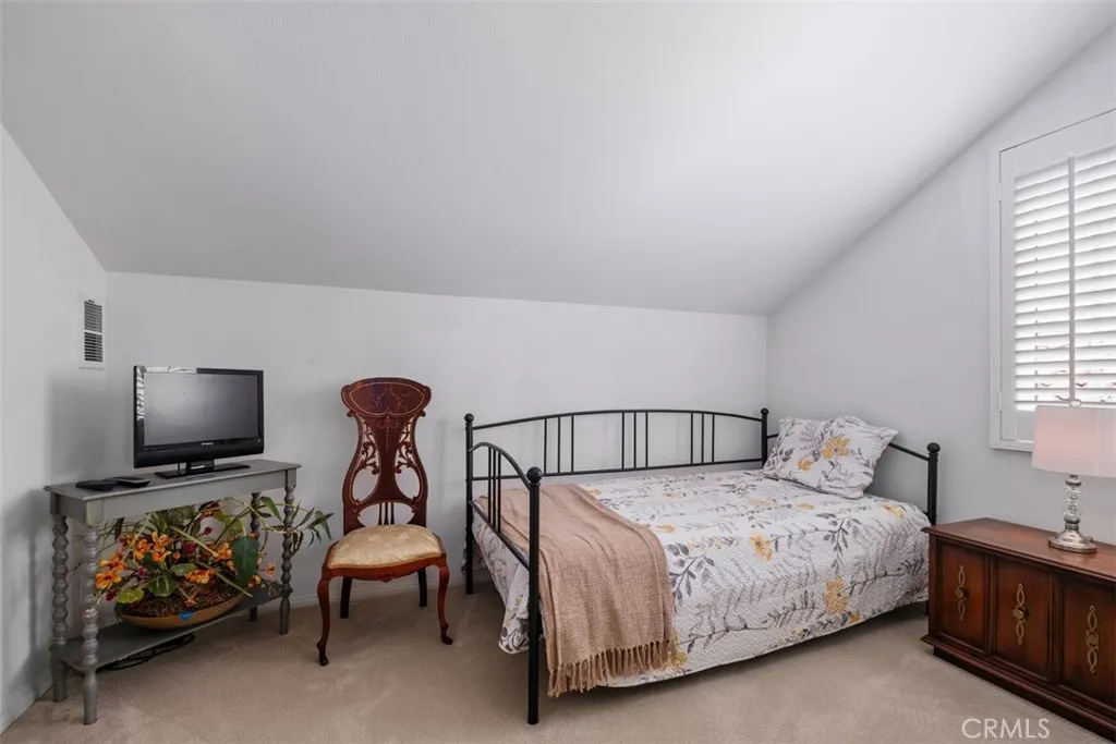 Welcome to this inviting Monterey residence, where timeless design and subtle European-inspired details come together to create a warm and comfortable living environment. Located on a cul-de-sac within the guard-gated Casta del Sol, the home offers a thoughtfully designed floor plan not commonly found in the community. The home features 2 bedrooms, 3 bathrooms, and a spacious loft, including an upstairs bedroom that provides additional living space. The layout includes both a living room and family room, offering flexibility and a natural flow for everyday living. Natural light fills the interior, highlighting hardwood flooring, plantation shutters, and well-maintained finishes throughout. The living area features a cast limestone fireplace, and the kitchen offers a bay window, travertine countertops, and cabinetry with leaded glass accents. Upstairs, the loft includes built-in shelving and adaptable space. The primary suite includes a soaking tub and direct access to the outdoor area. A covered patio with trellis detail and a private garden setting create a comfortable outdoor environment. A brick entry porch and front awnings contribute to the homes welcoming exterior. The community spans approximately 484 acres with mature landscaping and rolling hills, and includes amenities such as pools, spa, clubhouse, fitness facilities, tennis, paddle tennis, shuffleboard, and more. Residents also have access to Lake Mission Viejo, offering additional recreational opportunities. The community is designated for 55+ living, with established occupancy requirements and community guidel