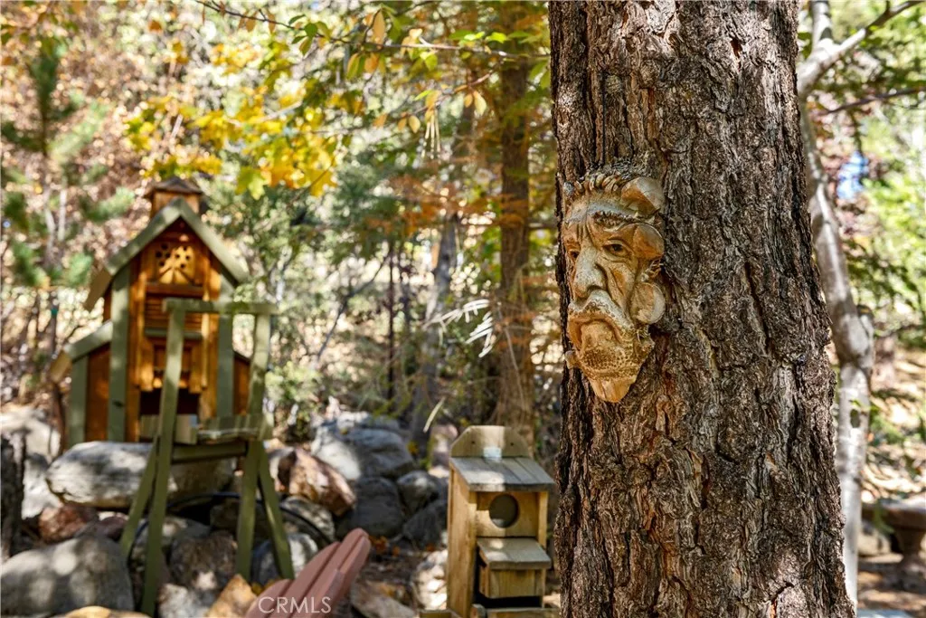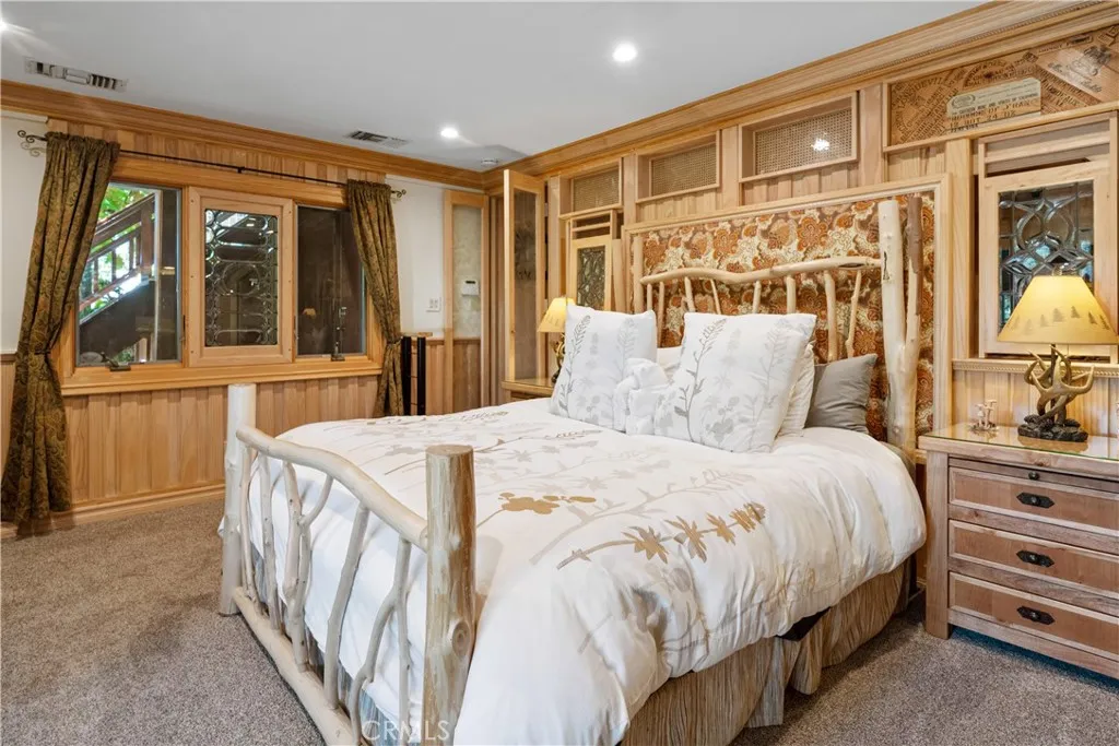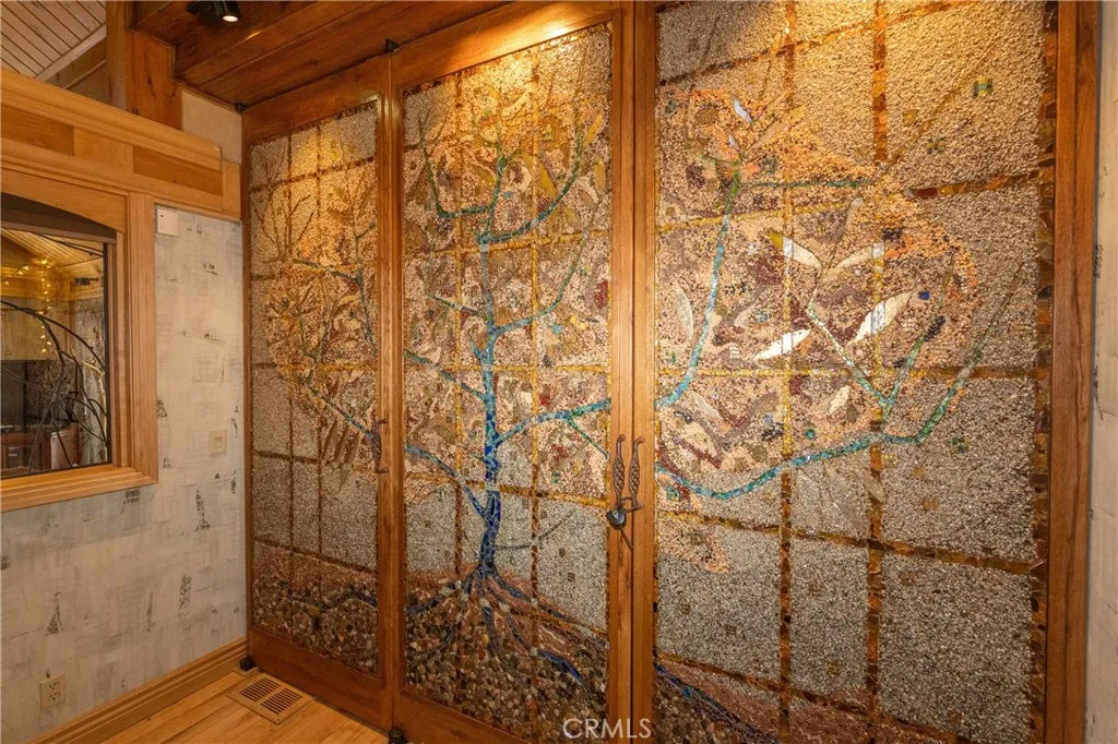 Perched among the trees in sought-after Moonridge, this one-of-a-kind Tree of Life retreat is far more than a cabinits an enchanted artistic and writers retreat, a living work of art. This 2-bedroom with a loft, 2-bath artisan-crafted home offers a rare blend of architectural beauty, natural surroundings, and unforgettable views of the lake and ski slopes, all just minutes from Bear Mountain. Originally handcrafted over a decade by a master craftsman as a tribute to his wife, every inch of this home tells a story. Custom woodwork, intricate glass details, and curated artistic elements are thoughtfully woven throughout, highlighted by the stunning Tree of Life mosaican irreplaceable centerpiece that defines the homes character. The open-concept living space is warm and inviting, designed to bring the outdoors in with expansive windows framing treetop vistas. A custom kitchen features high-end appliances, unique finishes, and a handcrafted island, flowing seamlessly into the dining and living areasperfect for entertaining, quiet mountain evenings, or creative inspiration. The main-level Tree of Life suite serves as a romantic and artistic sanctuary, ideal for reflection, writing, or peaceful escape. It features a cozy queen bed and one of the homes most breathtaking focal points. This room showcases extraordinary custom leaded glasswork and three handcrafted cedar closet doors, each weighing approximately 200 pounds and adorned with an intricate mosaic of crushed stone, glass, and tile. Taking over a year to complete, this remarkable installation stands as a true testament to