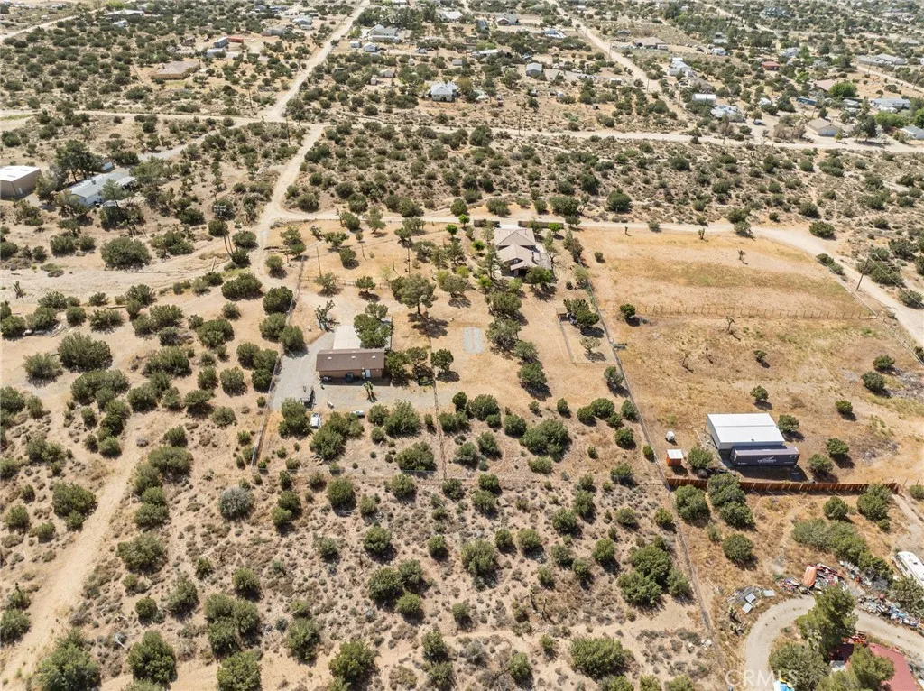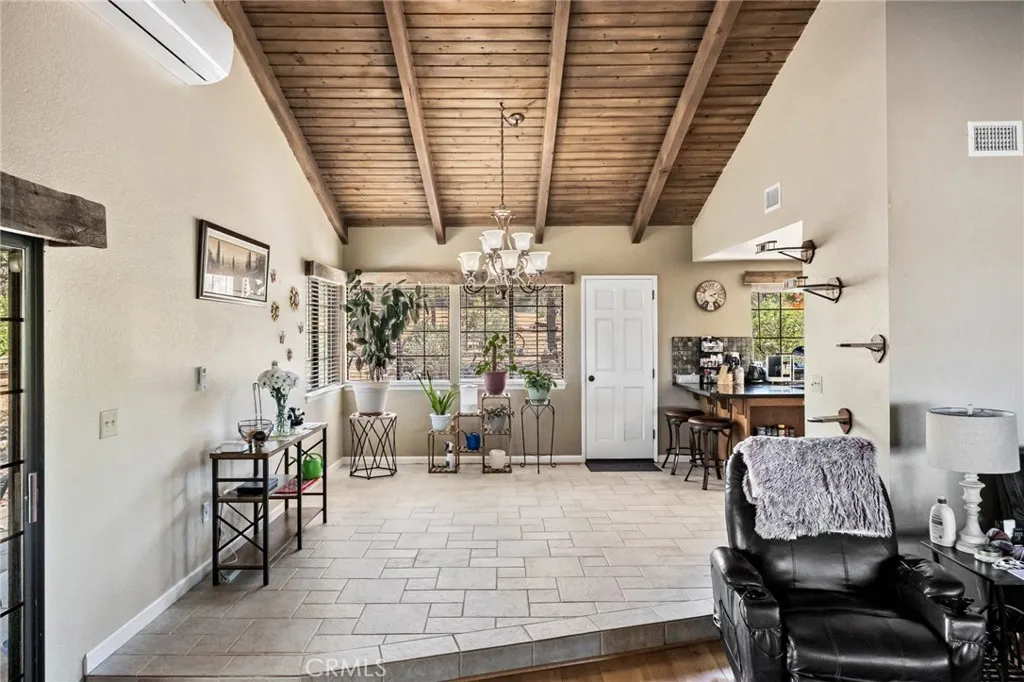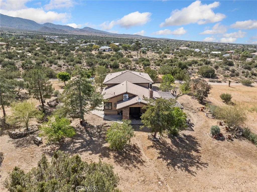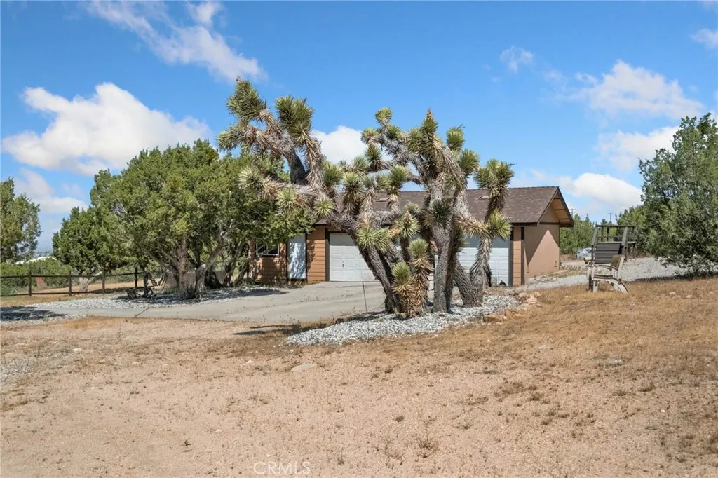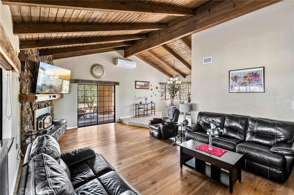 Tucked into the high desert landscape of south Pinon Hills, this charming 3 bedroom, 2.5 bath home offers the perfect blend of rustic character and comfortable living on 2.28 private acres. From the moment you arrive, the sweeping mountain views and dramatic sunset skies set the tone for everything this property delivers. Inside, soaring wood-beamed ceilings and warm tongue-and-groove wood create an inviting, cabin-inspired atmosphere throughout the main living areas. The great room is anchored by a stunning floor-to-ceiling stacked stone fireplace the heart of the home on cool high desert evenings. The ori-level design of the home invites you in with the main level entry the leads to the living room with beautiful wood flooring which wind around to the dining area and kitchen. The kitchen features abundant quality oak cabinetry, updated granite countertops, a breakfast bar, and mountain views right from the sink. A spacious secondary living area with vaulted beamed ceilings, an additional wood burning stove, a mini-split, and an elegant chandelier offers flexible space for dining, a sunroom, or additional lounge. Step outside to the covered patio wrapped in beautiful stacked stone and topped with a pergola the ideal space to entertain or simply take in the natural surroundings. The detached two-car garage is a standout bonus, featuring full insulation, a mini-split system, and a finished living space complete with wood-paneled walls, vaulted wood ceilings, LVP flooring, a kitchenette, and its own private entrance. Whether you envision a guest suite, ADU, home office, or