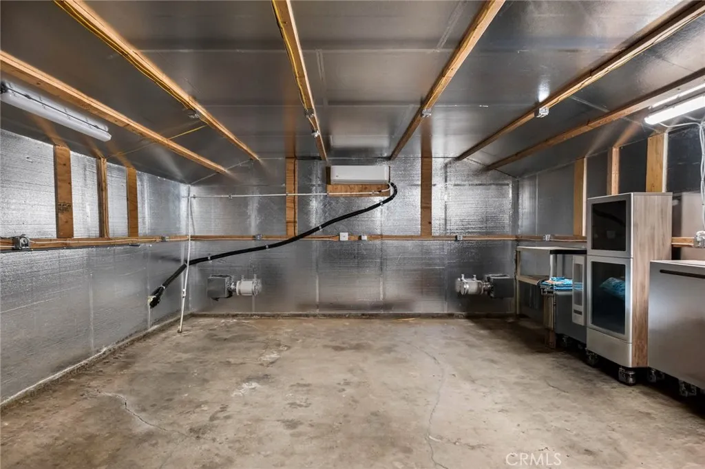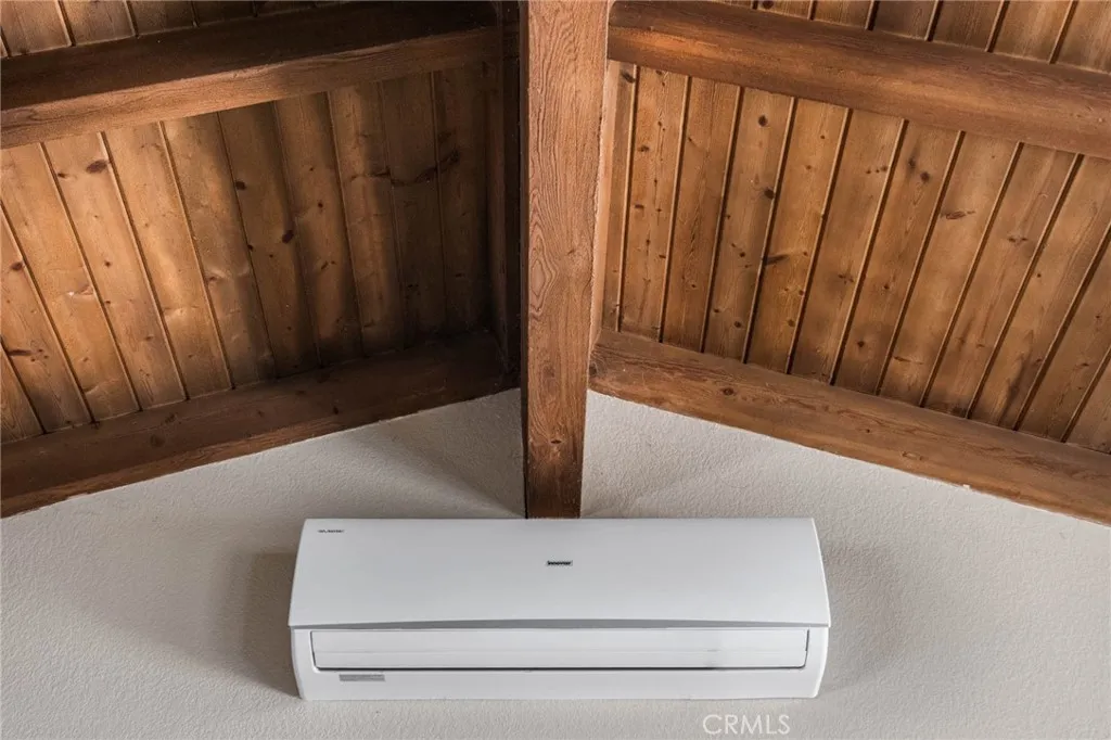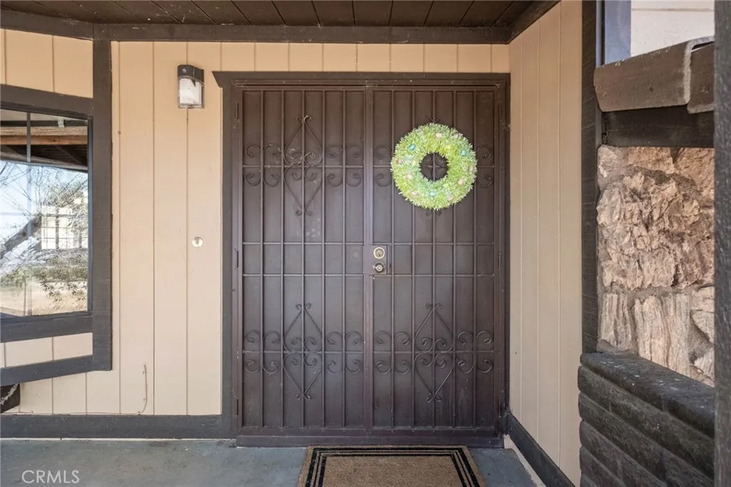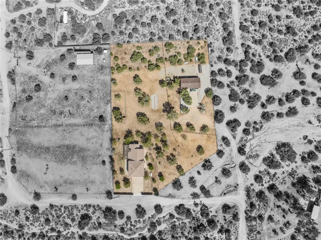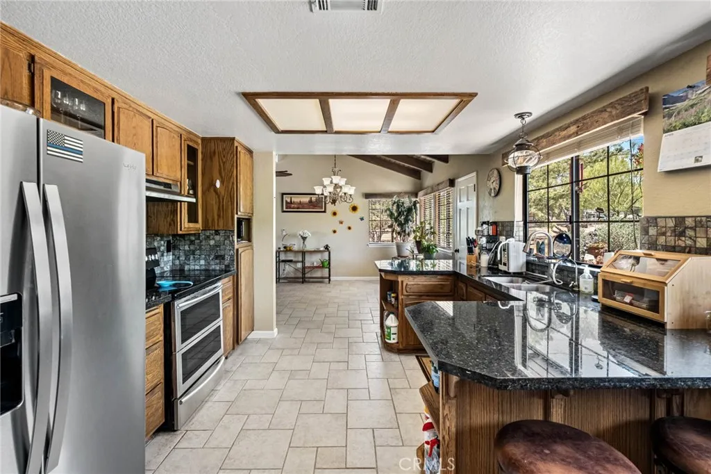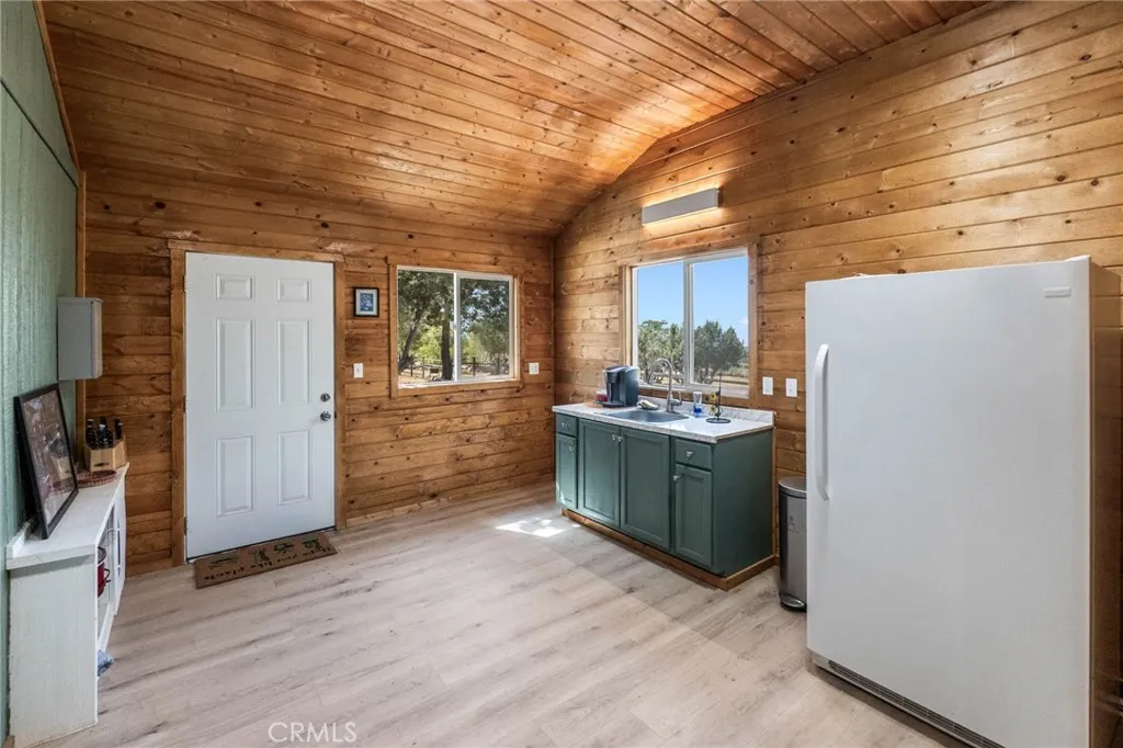 Tucked into the high desert landscape of south Pinon Hills, this charming 3 bedroom, 2.5 bath home offers the perfect blend of rustic character and comfortable living on 2.28 private acres. From the moment you arrive, the sweeping mountain views and dramatic sunset skies set the tone for everything this property delivers. Inside, soaring wood-beamed ceilings and warm tongue-and-groove wood create an inviting, cabin-inspired atmosphere throughout the main living areas. The great room is anchored by a stunning floor-to-ceiling stacked stone fireplace the heart of the home on cool high desert evenings. The ori-level design of the home invites you in with the main level entry the leads to the living room with beautiful wood flooring which wind around to the dining area and kitchen. The kitchen features abundant quality oak cabinetry, updated granite countertops, a breakfast bar, and mountain views right from the sink. A spacious secondary living area with vaulted beamed ceilings, an additional wood burning stove, a mini-split, and an elegant chandelier offers flexible space for dining, a sunroom, or additional lounge. Step outside to the covered patio wrapped in beautiful stacked stone and topped with a pergola the ideal space to entertain or simply take in the natural surroundings. The detached two-car garage is a standout bonus, featuring full insulation, a mini-split system, and a finished living space complete with wood-paneled walls, vaulted wood ceilings, LVP flooring, a kitchenette, and its own private entrance. Whether you envision a guest suite, ADU, home office, or