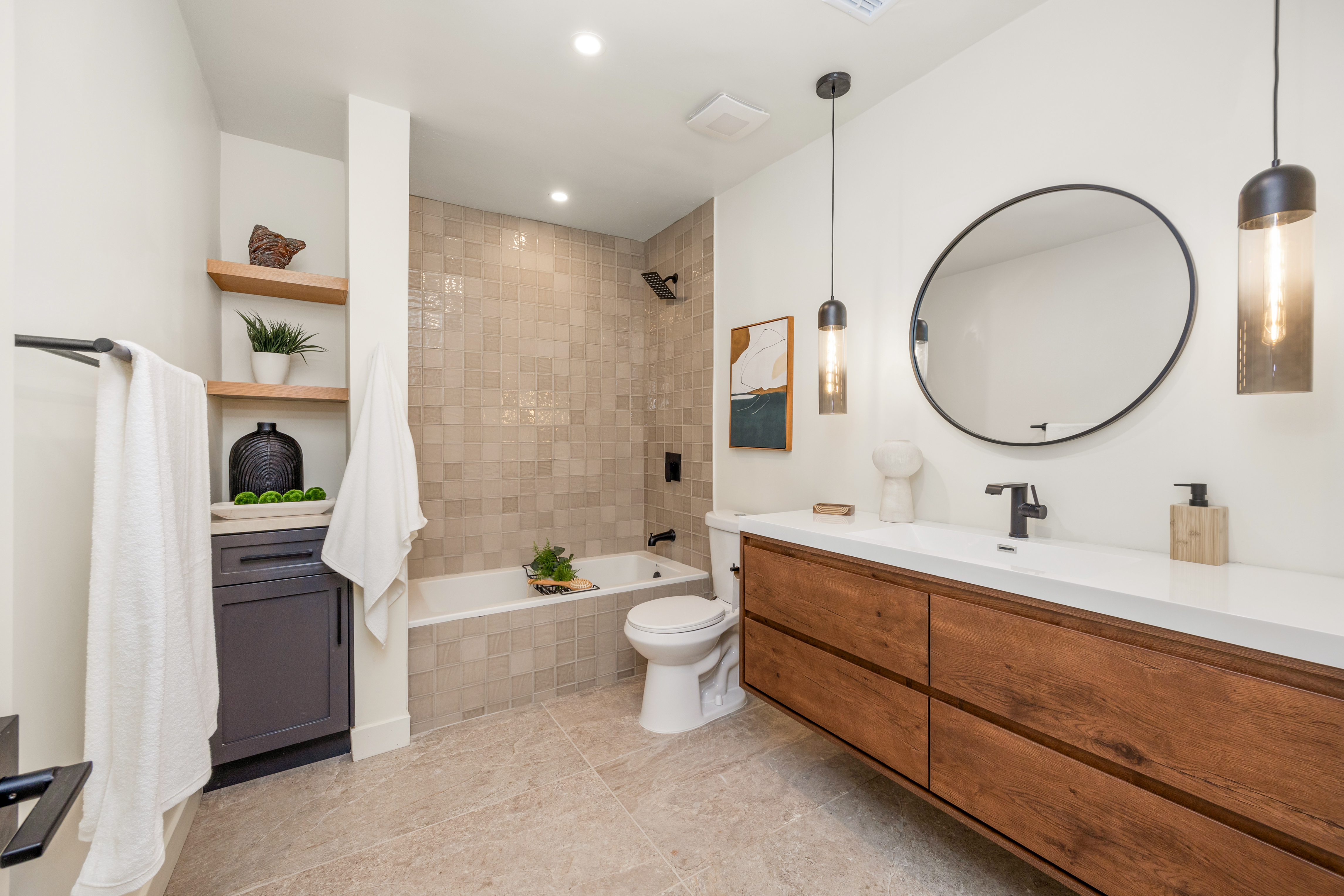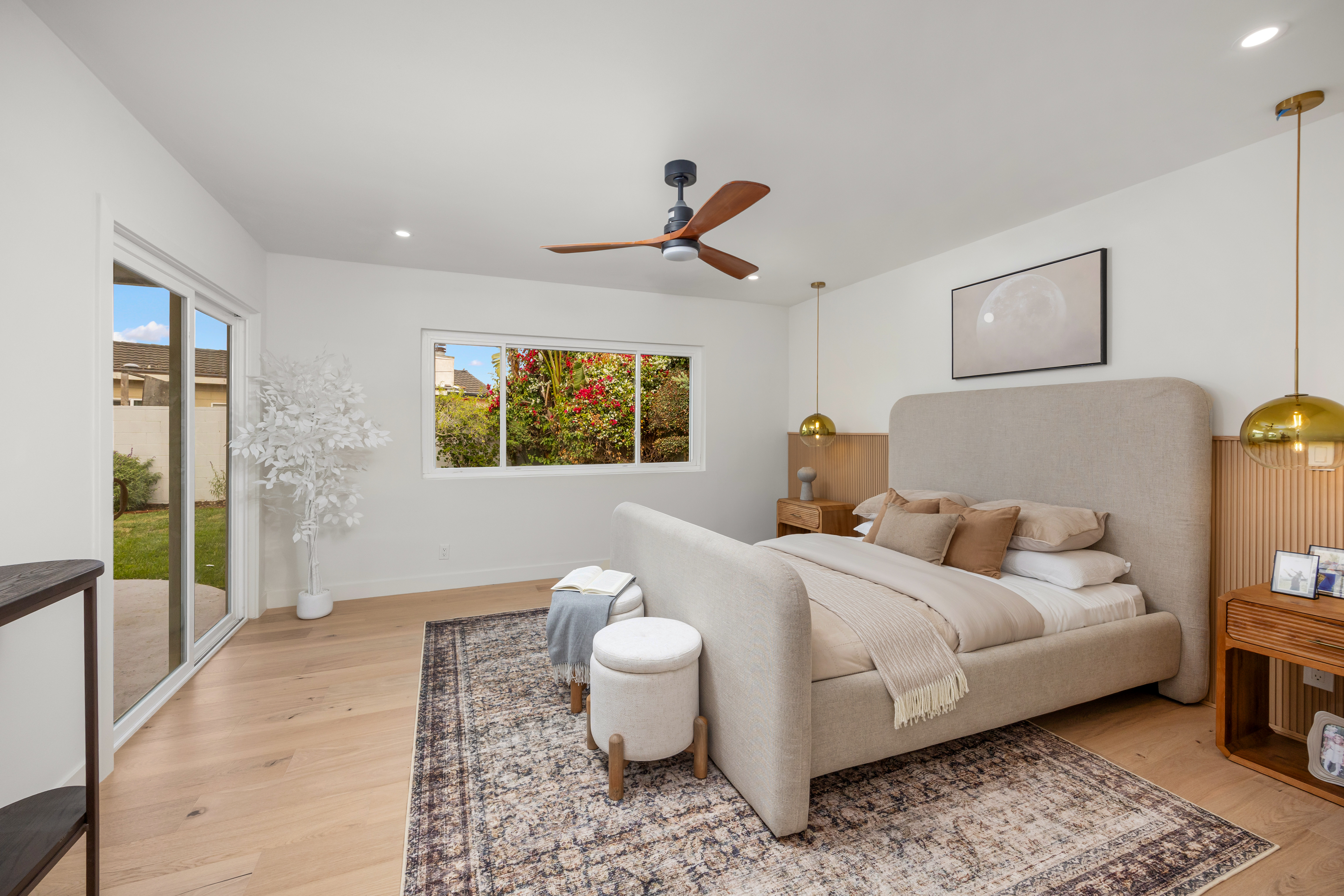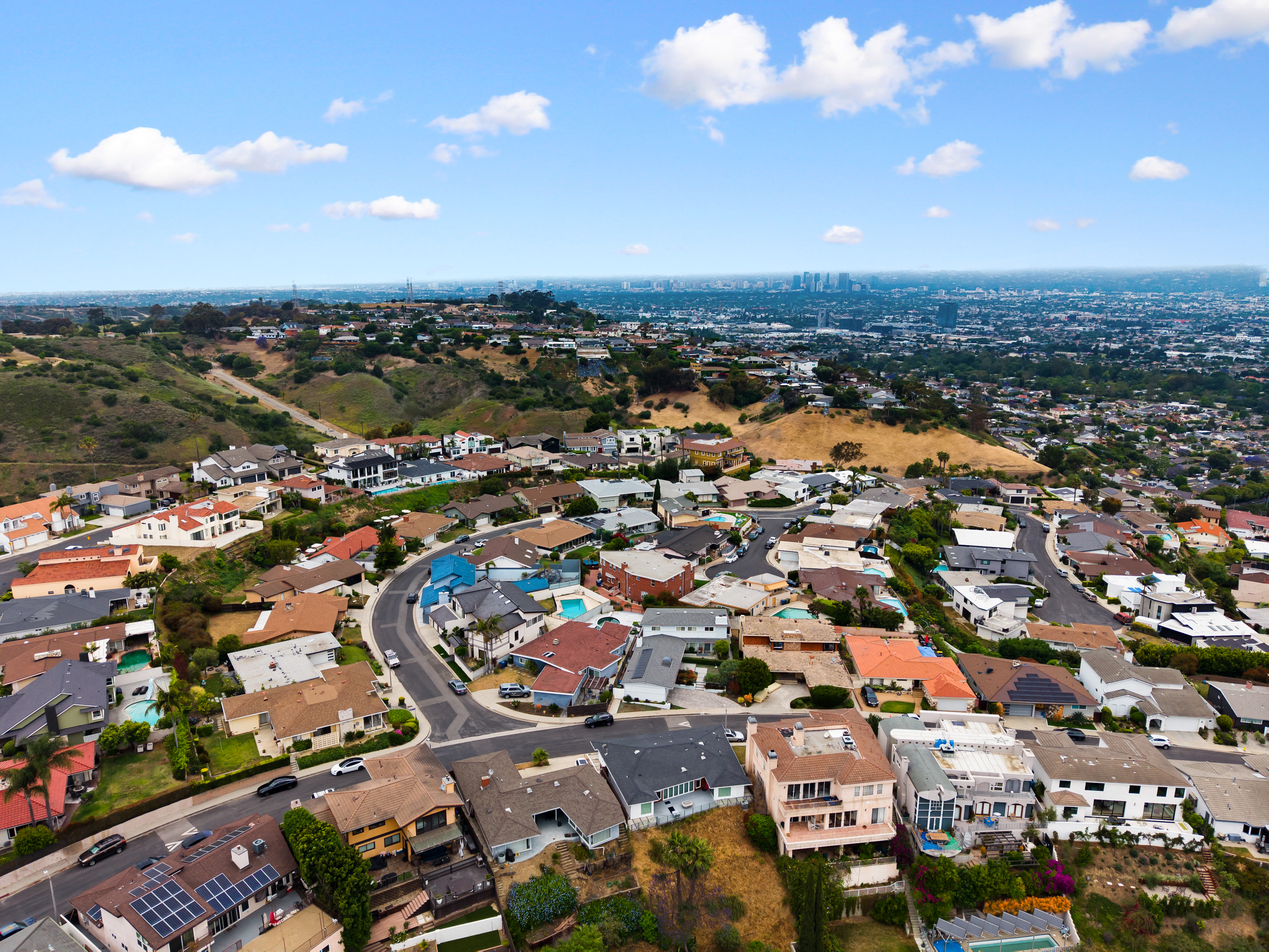 Thoughtfully reimagined from the inside out, this single-story Baldwin Hills residence pairs classic mid-century architecture with curated, contemporary finishes throughout. Wide-plank engineered hardwood flows through an open layout connecting two living spaces, dining room, and kitchen grounded by two fireplaces. A dedicated dry bar zellige tile backsplash and wine fridge carries its own design identity off the living room. The designer kitchen is the home's centerpiece two-tone cabinetry pairing white with oak cabinets, quartz countertops, tile backsplash, reeded-base island, pot filler, and stainless appliances. The primary suite offers a slatted wood accent wall, walk-in closet, and spa-inspired bath with a dual floating vanity, marble-look countertops, and a tile shower with rain head and frameless glass enclosure. Additional bedrooms are served by a secondary full bath with a warm wood floating vanity, while the powder room makes a statement with bold graphic-print wallpaper, a floating vanity, and vessel sink. Large sliding doors open to a private backyard with a covered patio, lush lawn, and mature landscaping. Owned solar adds year-round efficiency. Minutes from SoFi Stadium, the Forum, USC, and the energy of Downtown Los Angeles..