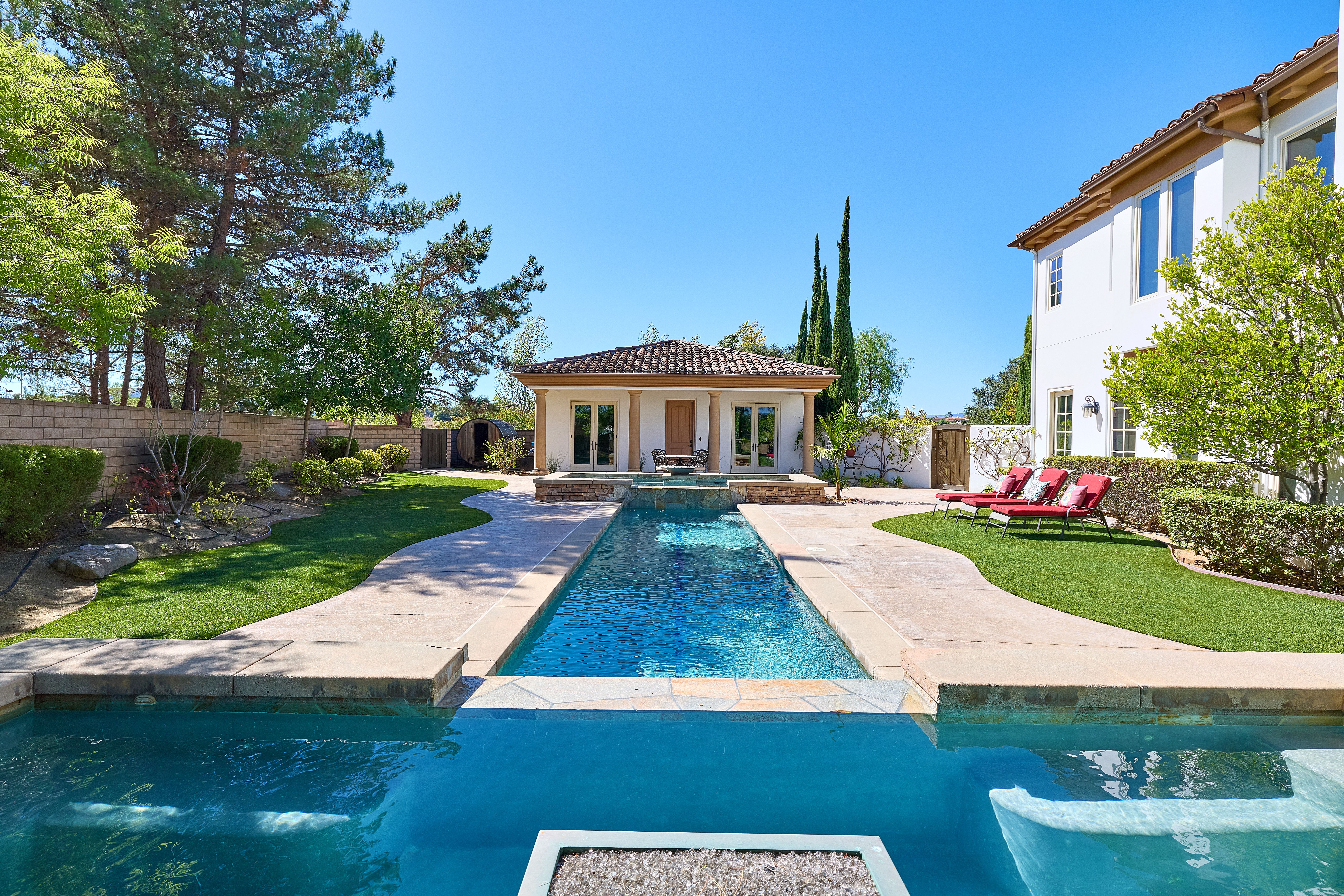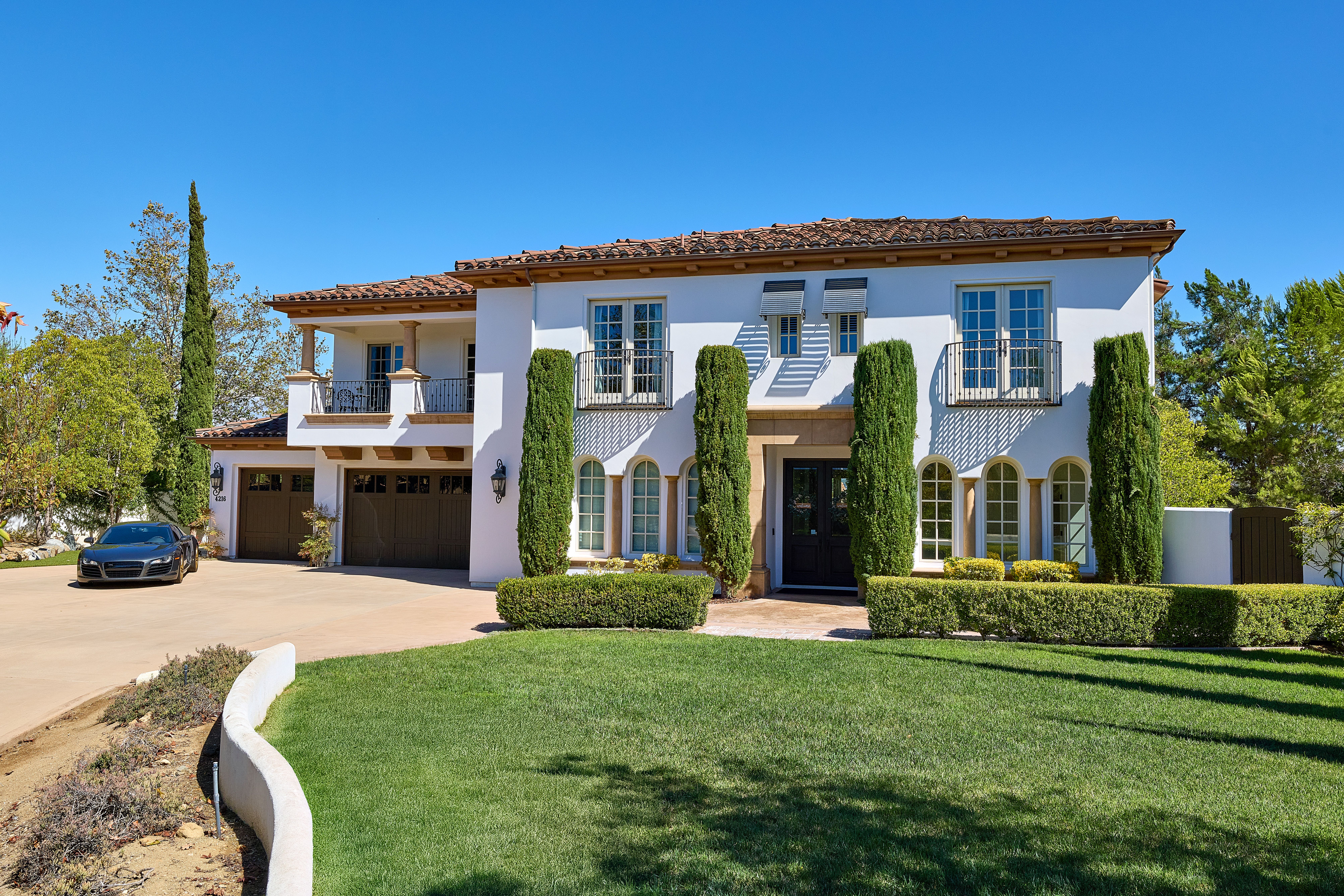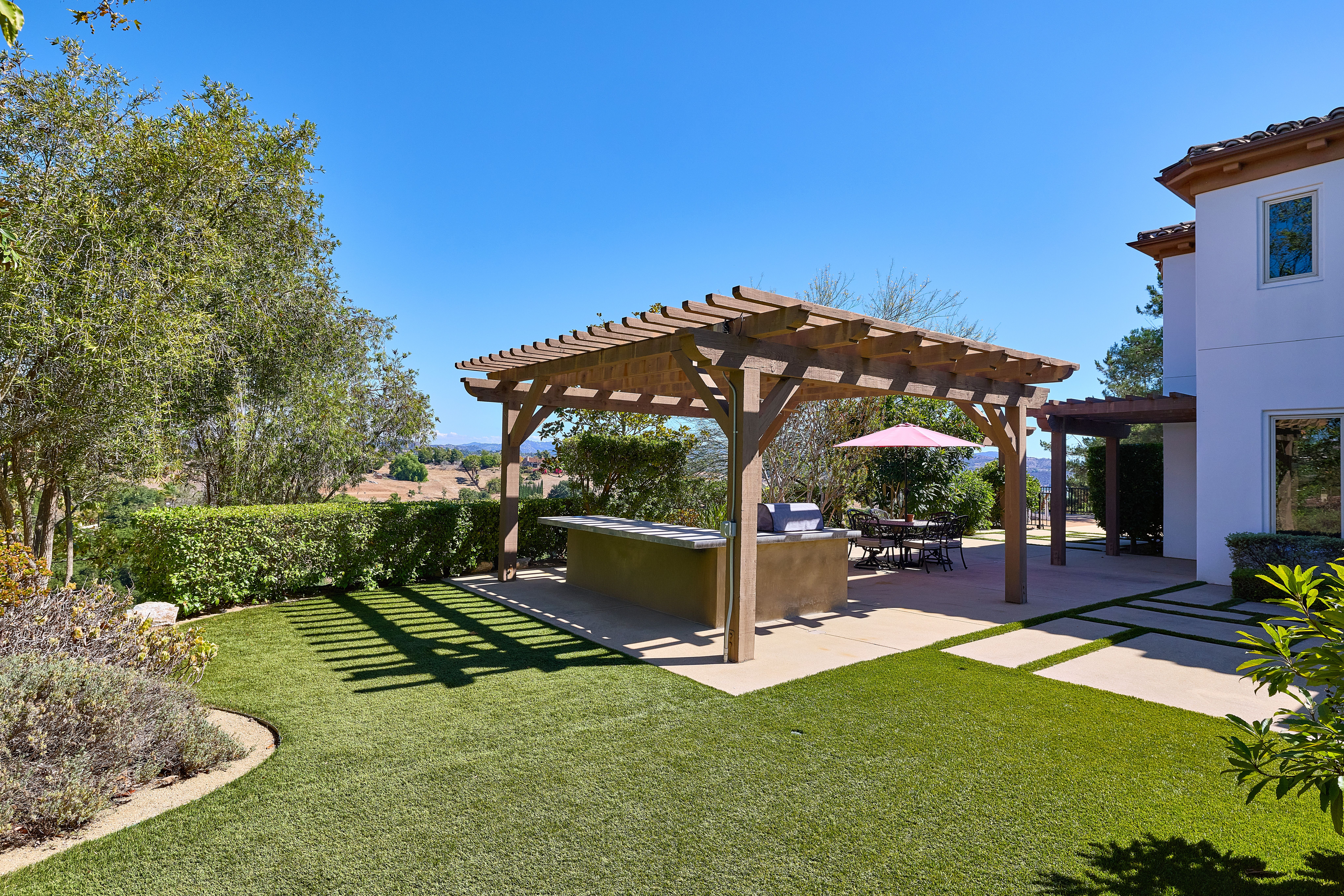 Showcasing a large estate home with resort-style pool and spa, detached guest house, 4-car garage, privacy, and refined architectural details, this residence is designed for both luxury living and entertaining. Set within the exclusive gated enclave of Malabar Ranch, this Spanish Mediterranean–style estate offers the privacy, sophistication, and grandeur that discerning buyers expect. Positioned on 2.11 acres, the property presents commanding curb appeal with timeless Santa Barbara style stucco, arched windows, lush landscaping, and a sense of arrival that makes a lasting impression. Inside, a dramatic two-story formal living room welcomes guests with soaring ceilings and a sweeping grand staircase—an ideal setting for both formal entertaining and quiet reflection. The main home boasts 5 bedrooms and 5.5 bathrooms, designed with both elegance and comfort in mind. At the heart of the home, the chef’s kitchen is outfitted with a Sub-Zero refrigerator, dual ovens, dual dishwashers, and a generous center island, making it both functional and inviting. From the kitchen sink, take in serene views of the rolling Fallbrook hills—a daily reminder of the home’s exceptional setting. A spacious, well-appointed kitchen flows effortlessly between the formal dining room, breakfast nook, and the entertainment area with built-in barbecue island. The detached one-bedroom guest house offers luxurious accommodations. Outside, multiple living and dining areas are thoughtfully oriented to take in the surrounding Fallbrook hills. Enjoy morning sunrises with coffee on one terrace and toast evening sunsets from another. A private resort style in-ground pool and spa, and the cedar wrapped sauna complete the picture, providing the perfect retreat after a demanding day. This residence is more than a home—it’s a statement piece, offering the ideal balance between prestige and personal sanctuary.