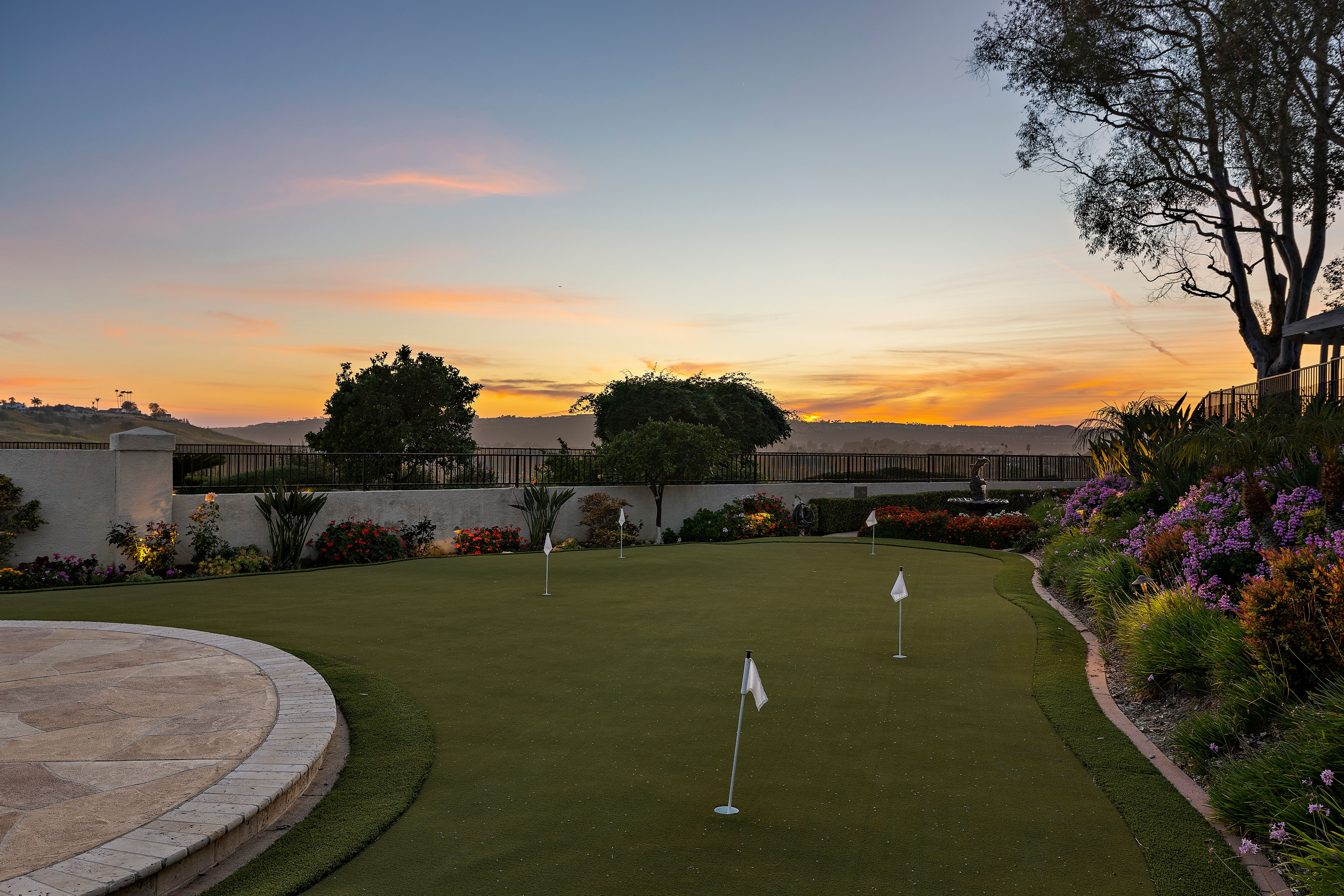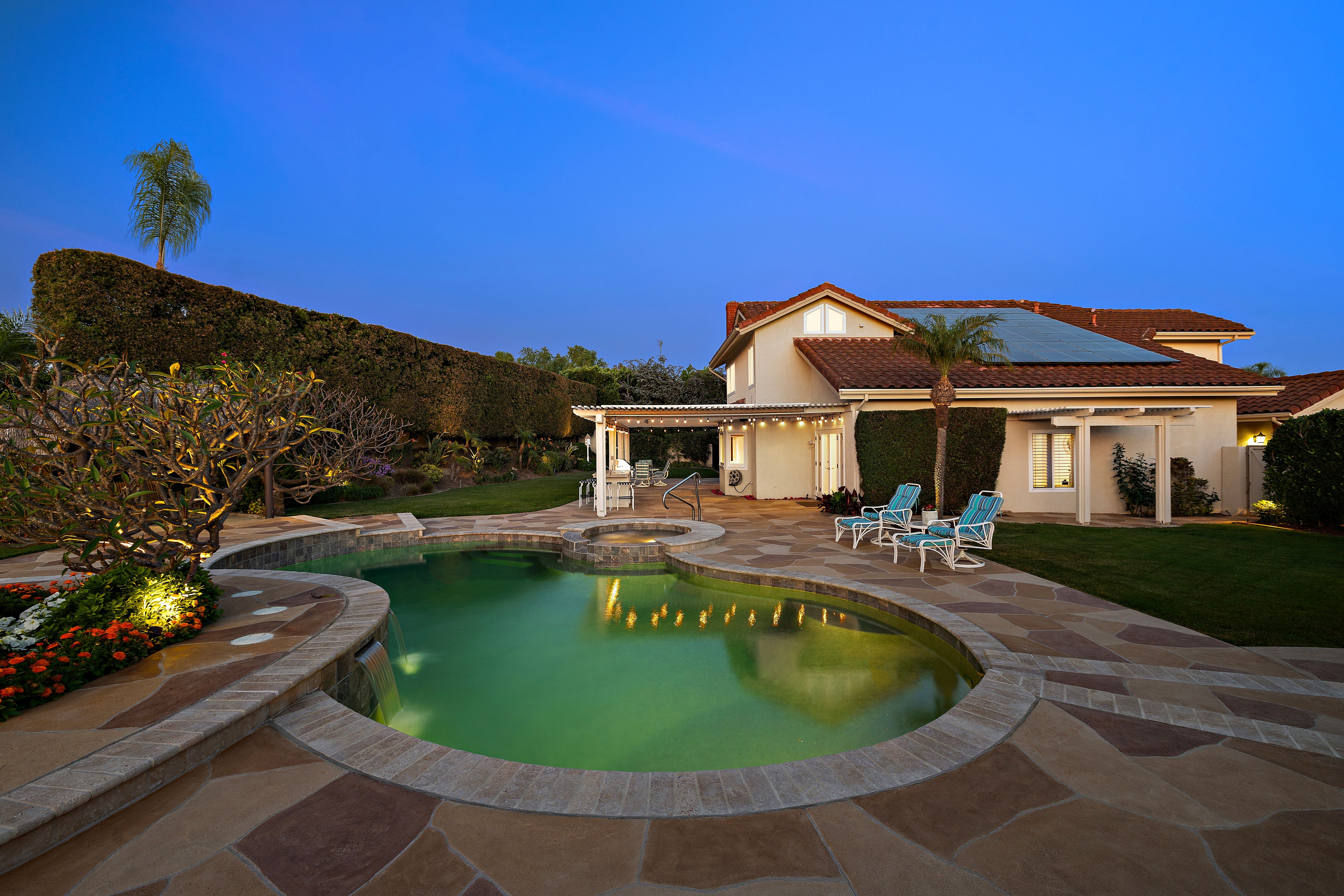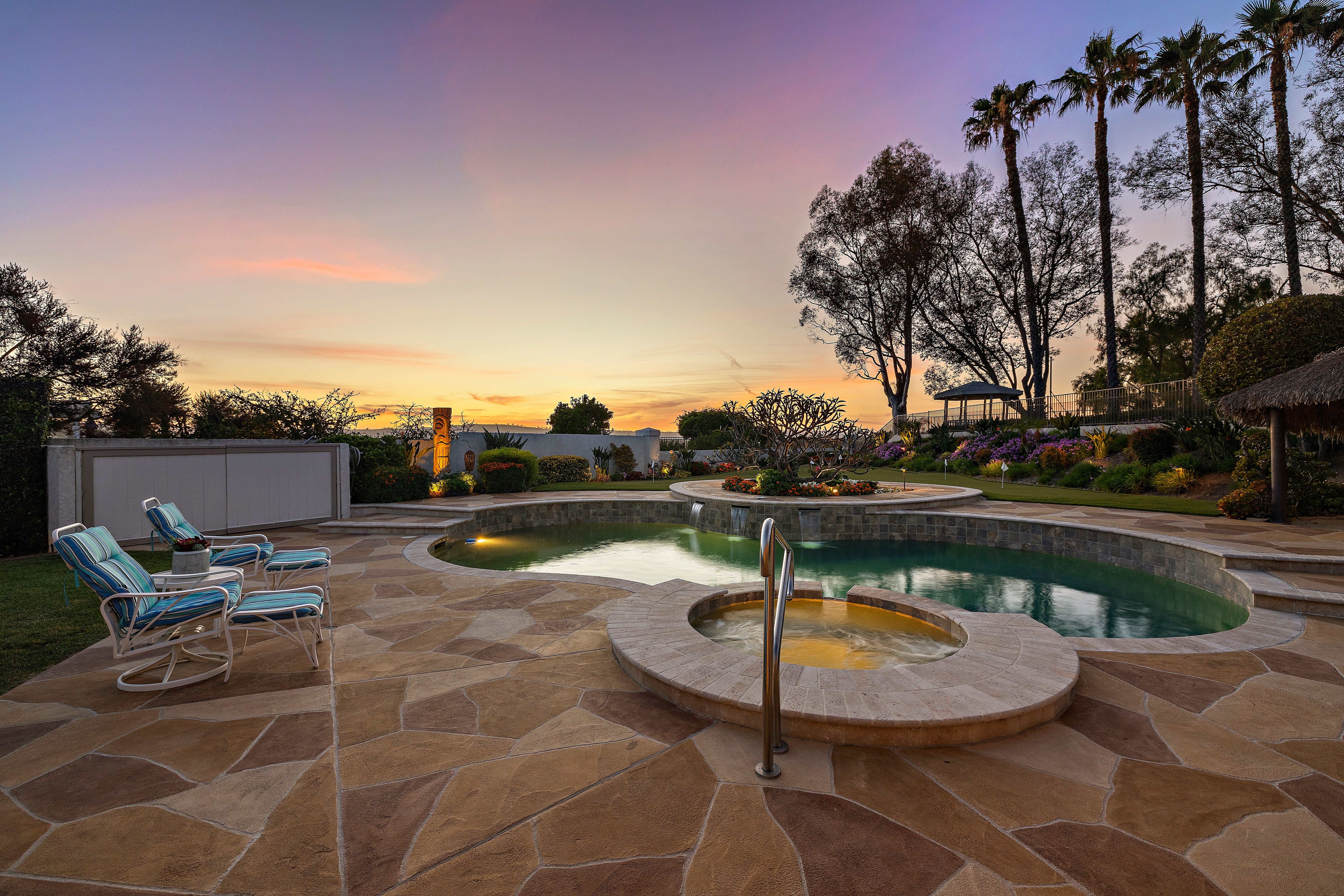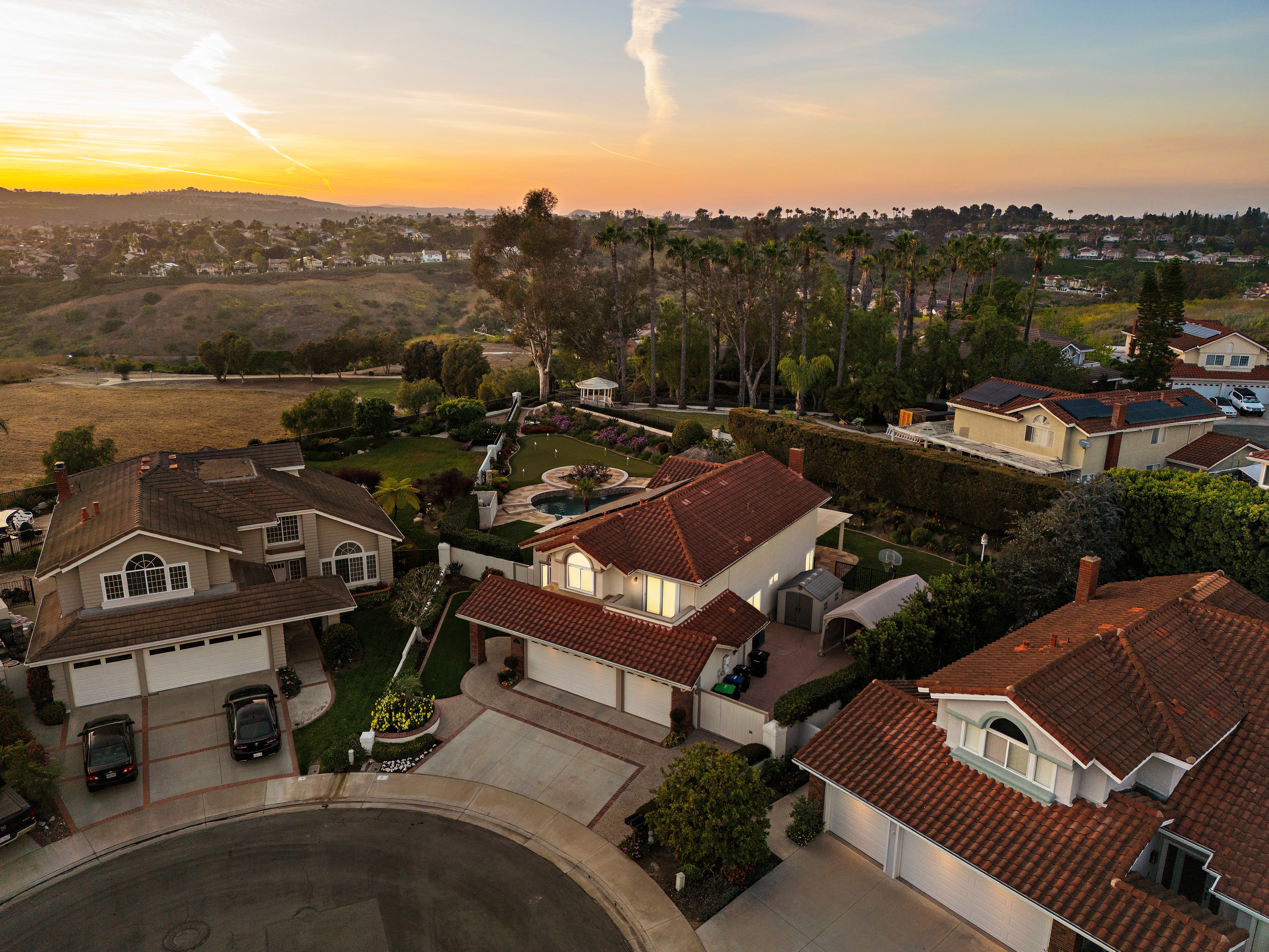 A STANDOUT OFFERING, defined by its EXTRAORDINARILY LARGE AND RARELY available lot size, this property presents a unique opportunity to enjoy space, privacy, canyon and city light views, and a true resort-style setting. Positioned at the end of a quiet cul-de-sac, the expansive grounds immediately set it apart—something not easily found. Thoughtfully designed to evoke the feeling of a private Hawaiian retreat, the backyard is the true centerpiece—lush, expansive, and layered with amenities that create a relaxed, elevated lifestyle. A sparkling pool anchors the space, complemented by a putting green, palapa-covered sandy lounge area, covered patio, built-in BBQ station, and a generous side yard offering flexibility for additional vehicle storage or future expansion. Inside, the home offers a functional and well-balanced layout with four bedrooms and three full bathrooms, with one bedroom and bath located on the main level. Vaulted ceilings and abundant natural light enhance the living spaces, while the floorplan creates a seamless connection between formal and casual areas. As you move toward the rear of the home, the layout transitions into an open-concept family room with a gas fireplace, seamlessly connected to the kitchen and breakfast nook, all overlooking the tropical backyard. Upstairs, the bedrooms are thoughtfully positioned for privacy, including a spacious primary suite with vaulted ceilings and a primary bathroom featuring a combination of stone countertops and tile surfaces, custom cabinetry, along with his and her closets. The upstairs hall bathroom has also been renovated with stone and tile surfaces and custom cabinetry. Additional highlights include OWNED SOLAR, dual-pane vinyl-clad windows, upgraded sliding glass door and French doors, a water softener, and a three-car garage with epoxy-coated floors and built-in cabinetry. A rare combination of lot size, location, and lifestyle—properties like this seldom come to market and present a compelling opportunity.