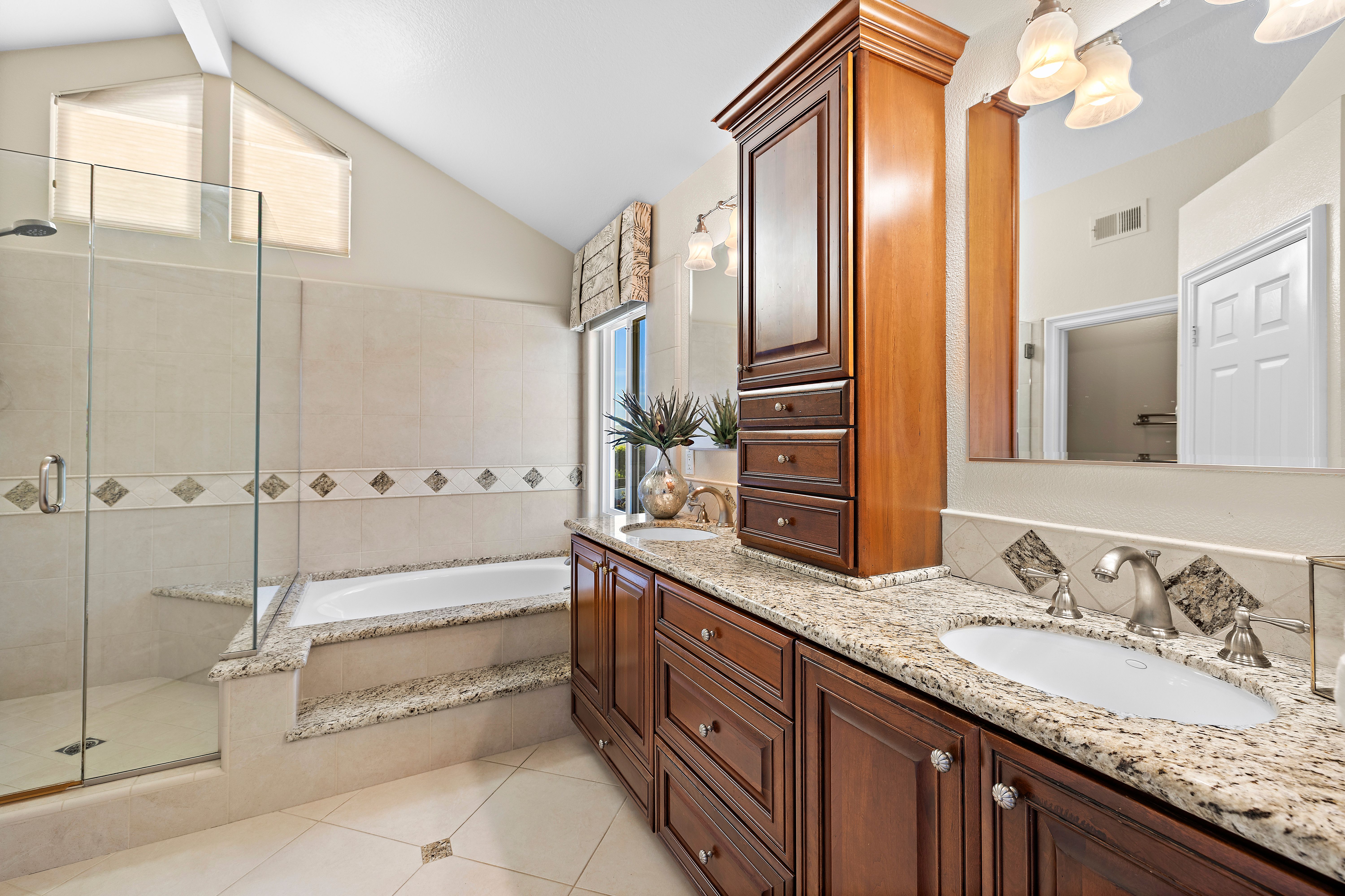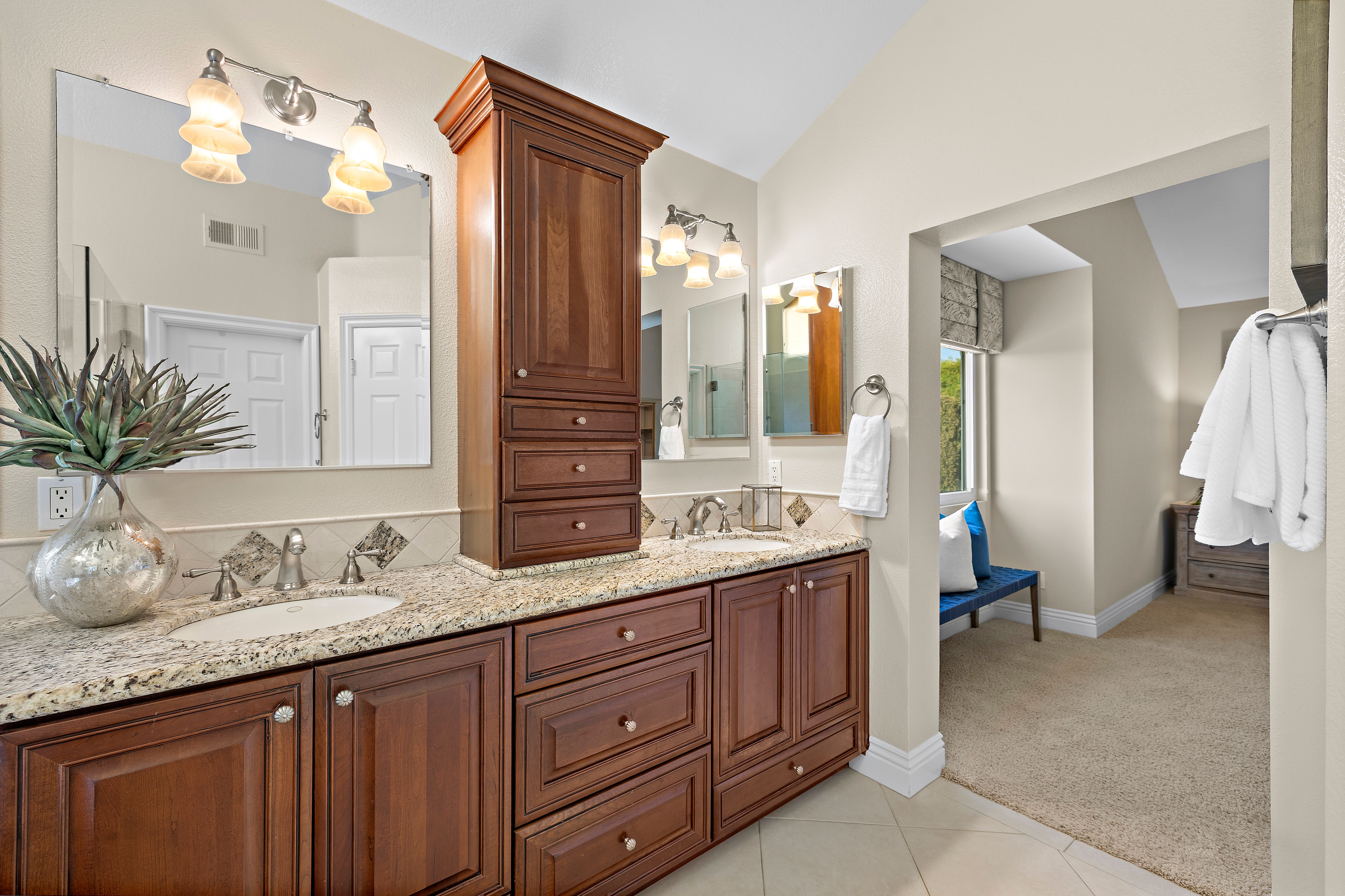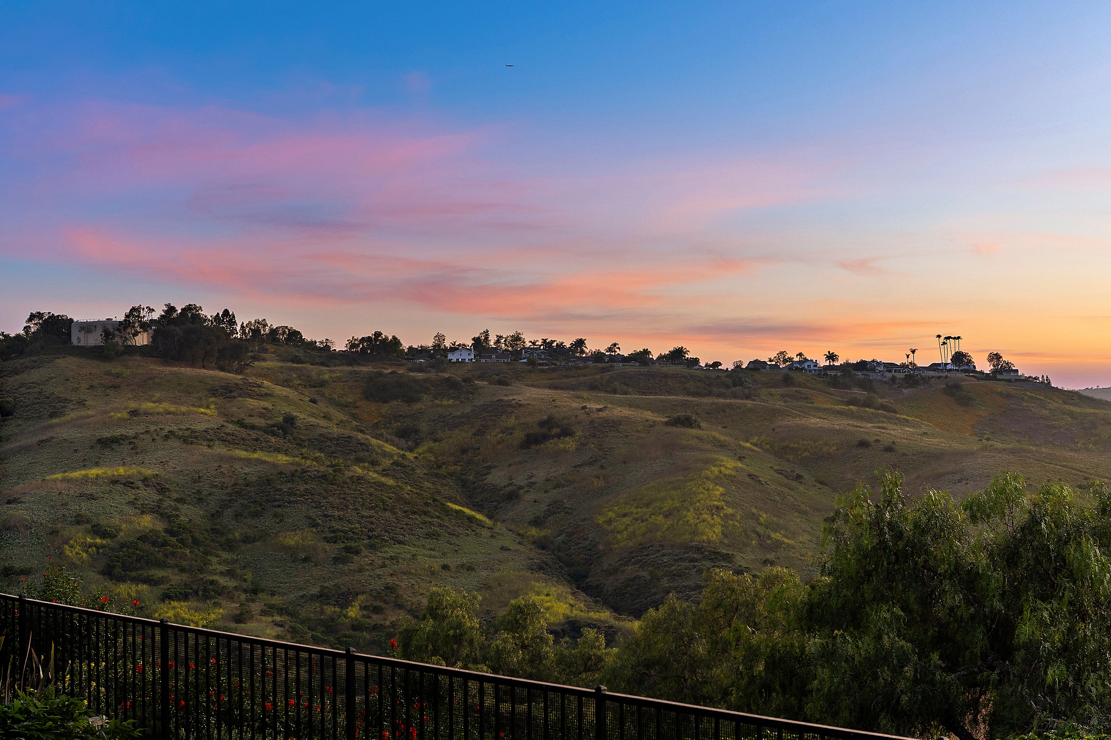 A STANDOUT OFFERING, defined by its EXTRAORDINARILY LARGE AND RARELY available lot size, this property presents a unique opportunity to enjoy space, privacy, canyon and city light views, and a true resort-style setting. Positioned at the end of a quiet cul-de-sac, the expansive grounds immediately set it apart—something not easily found. Thoughtfully designed to evoke the feeling of a private Hawaiian retreat, the backyard is the true centerpiece—lush, expansive, and layered with amenities that create a relaxed, elevated lifestyle. A sparkling pool anchors the space, complemented by a putting green, palapa-covered sandy lounge area, covered patio, built-in BBQ station, and a generous side yard offering flexibility for additional vehicle storage or future expansion. Inside, the home offers a functional and well-balanced layout with four bedrooms and three full bathrooms, with one bedroom and bath located on the main level. Vaulted ceilings and abundant natural light enhance the living spaces, while the floorplan creates a seamless connection between formal and casual areas. As you move toward the rear of the home, the layout transitions into an open-concept family room with a gas fireplace, seamlessly connected to the kitchen and breakfast nook, all overlooking the tropical backyard. Upstairs, the bedrooms are thoughtfully positioned for privacy, including a spacious primary suite with vaulted ceilings and a primary bathroom featuring a combination of stone countertops and tile surfaces, custom cabinetry, along with his and her closets. The upstairs hall bathroom has also been renovated with stone and tile surfaces and custom cabinetry. Additional highlights include OWNED SOLAR, dual-pane vinyl-clad windows, upgraded sliding glass door and French doors, a water softener, and a three-car garage with epoxy-coated floors and built-in cabinetry. A rare combination of lot size, location, and lifestyle—properties like this seldom come to market and present a compelling opportunity.
