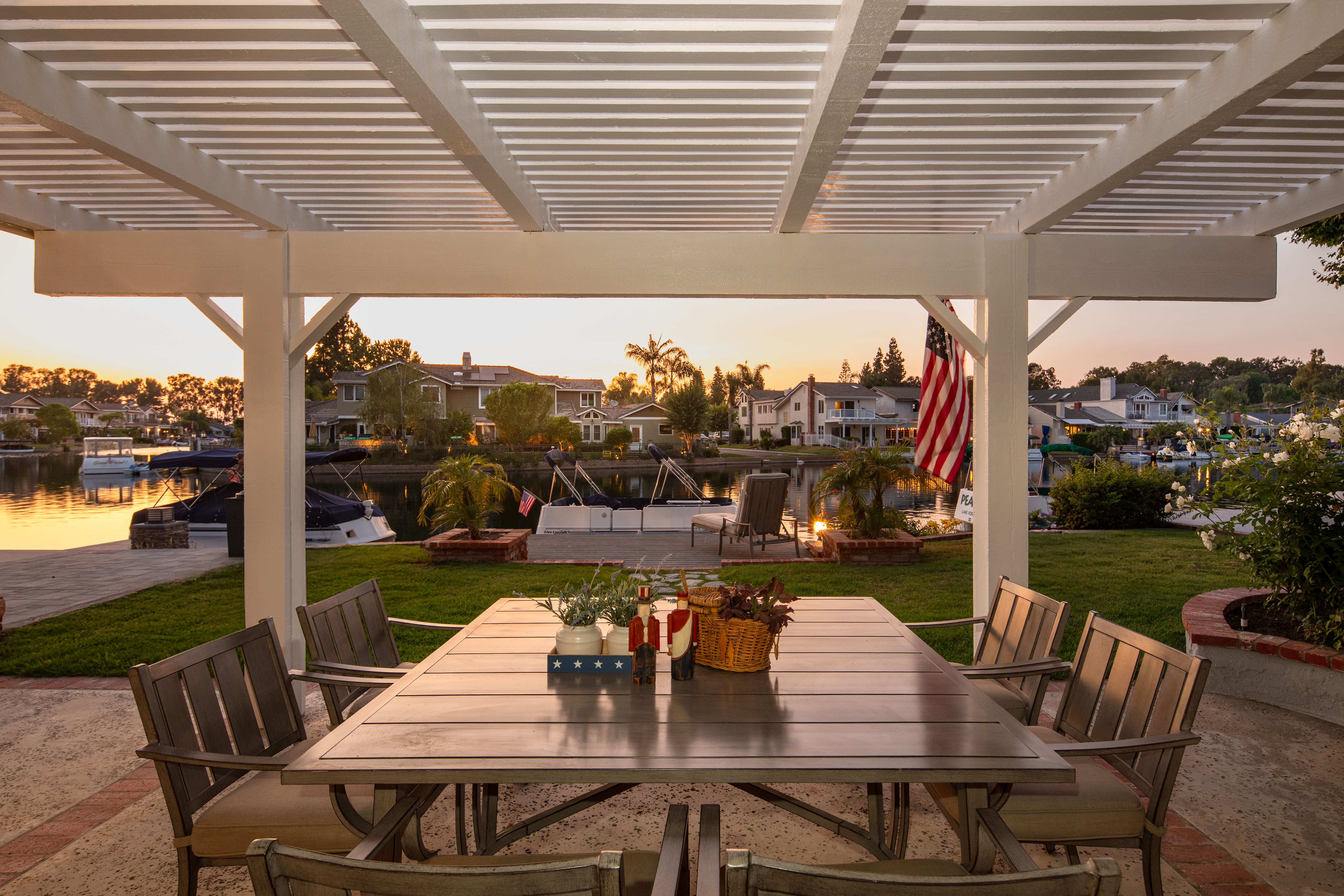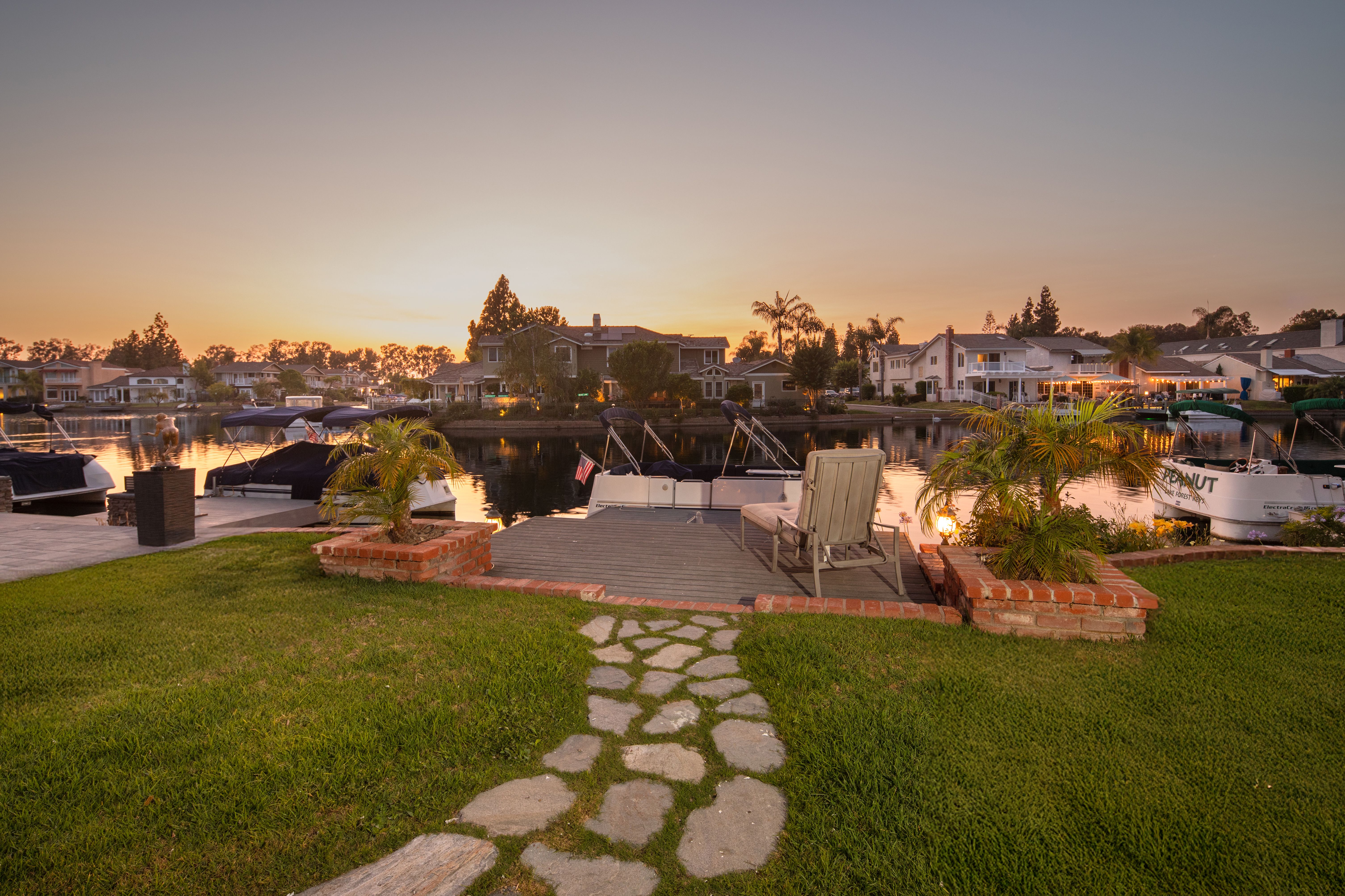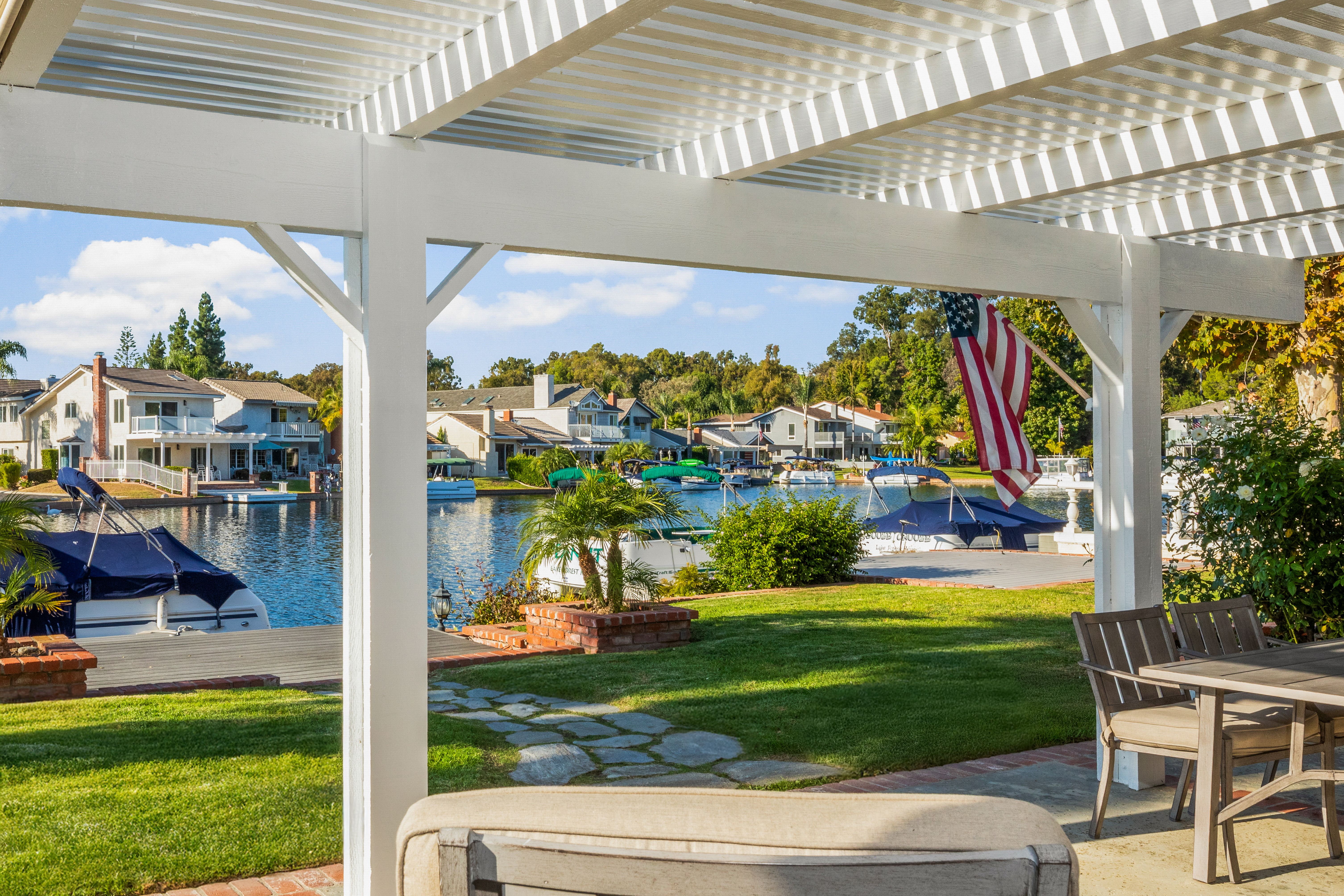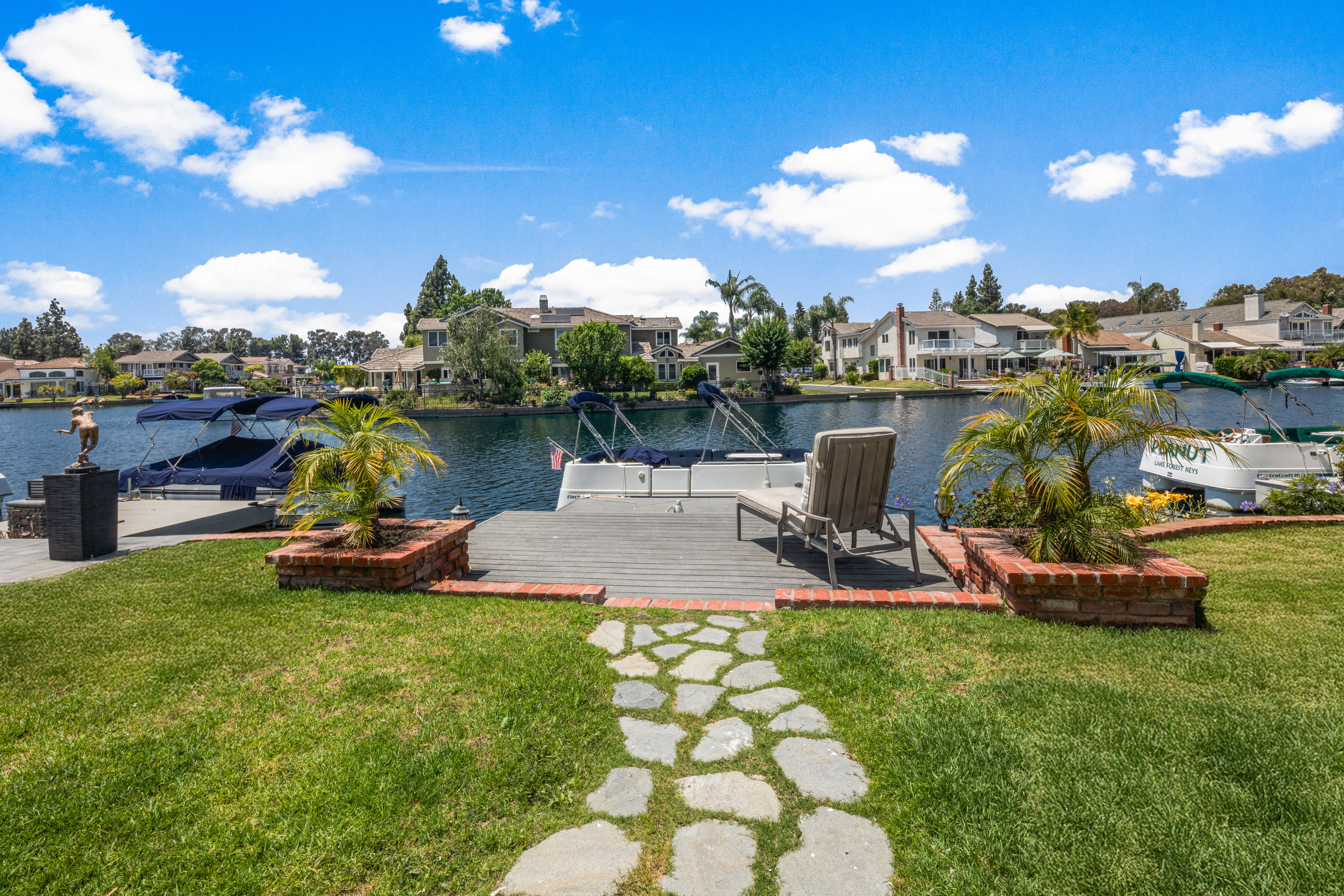 If America was a house, it might look something like this. Nestled along the tranquil edge of the Lake Forest Keys, this lakefront home captures the essence of laid-back all-American living, with a polished yet timeless sensibility. Designed to feel both grounded and elevated, the home leans into a warm palette of deep reds, crisp whites, natural woods, and aged metals, offering an atmosphere that feels classic without being nostalgic, and styled without ever feeling forced. Inside, the layout unfolds gently, with the living room, kitchen, and dining spaces seamlessly connected and oriented to take full advantage of the water views. At its heart, the living area centers around a fireplace framed by large windows, where sunlight plays off the ever-changing reflections of the lake outside. The kitchen, both functional and welcoming, features shaker cabinetry, stone countertops, and a large breakfast bar that invites casual conversation or weekend breakfasts with family. It’s a space that feels lived-in, loved, and ready for both slow mornings and spontaneous gatherings. Outdoors, the experience continues with a generous patio that leads to a private dock, your front-row seat to everything the lake has to offer. From sunlit mornings to lantern-lit nights, this is a place designed for gathering, unwinding, and simply being present. Upstairs, each bedroom carries its own quiet charm, tied together by a cohesive design thread of comfort and classic finishes. The primary suite offers sweeping views of the lake, and the gentle rhythm of the water becomes part of the everyday routine. Throughout, thoughtful details like custom wooden shutters, soft lighting, and heritage-inspired accents create a sense of ease and familiarity. Rooted in tradition but designed for modern life, this home is more than just a residence, it’s an embodiment of comfort, character, and the quiet luxury of lakeside living in one of Orange County’s most beloved communities.