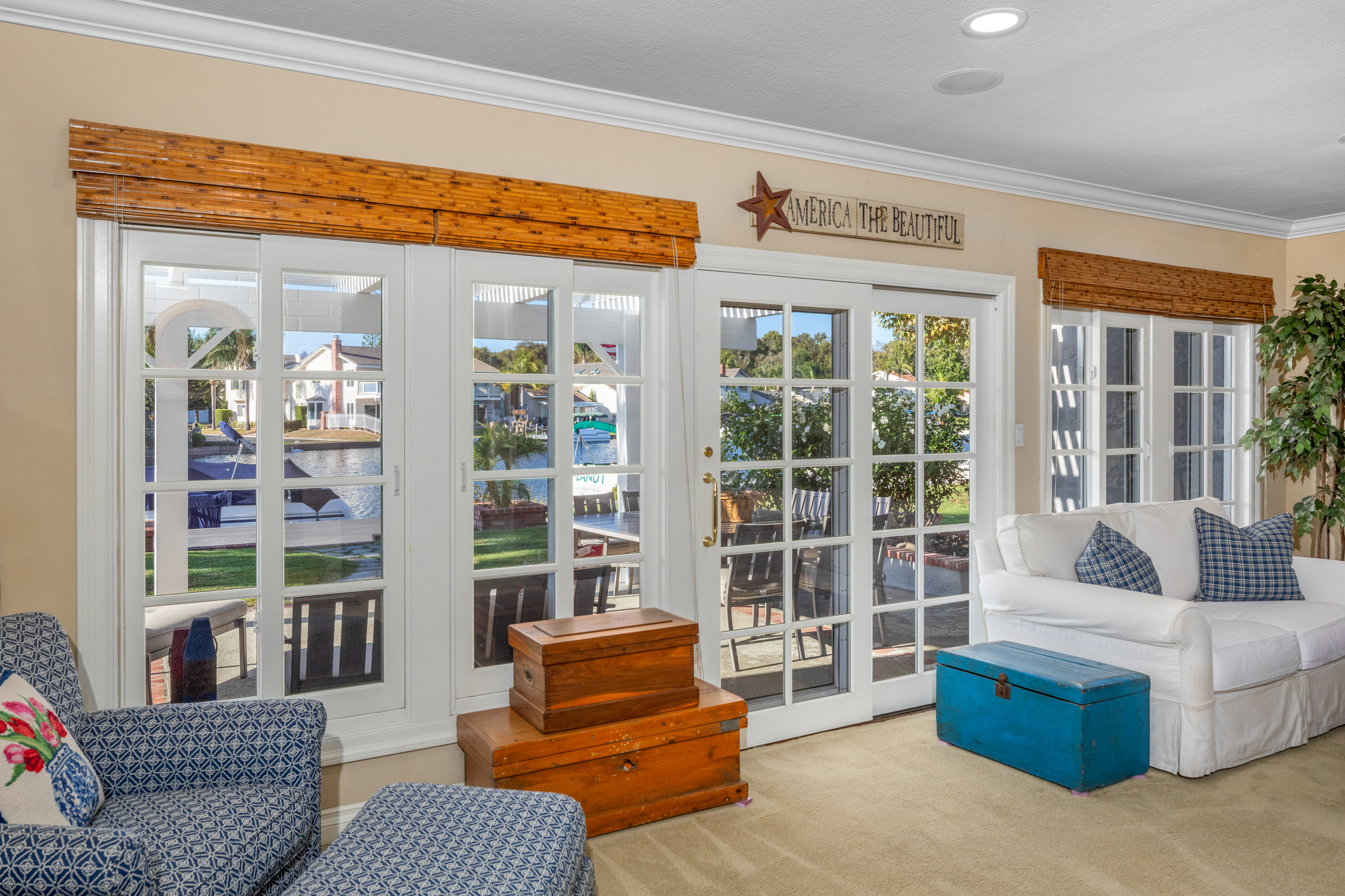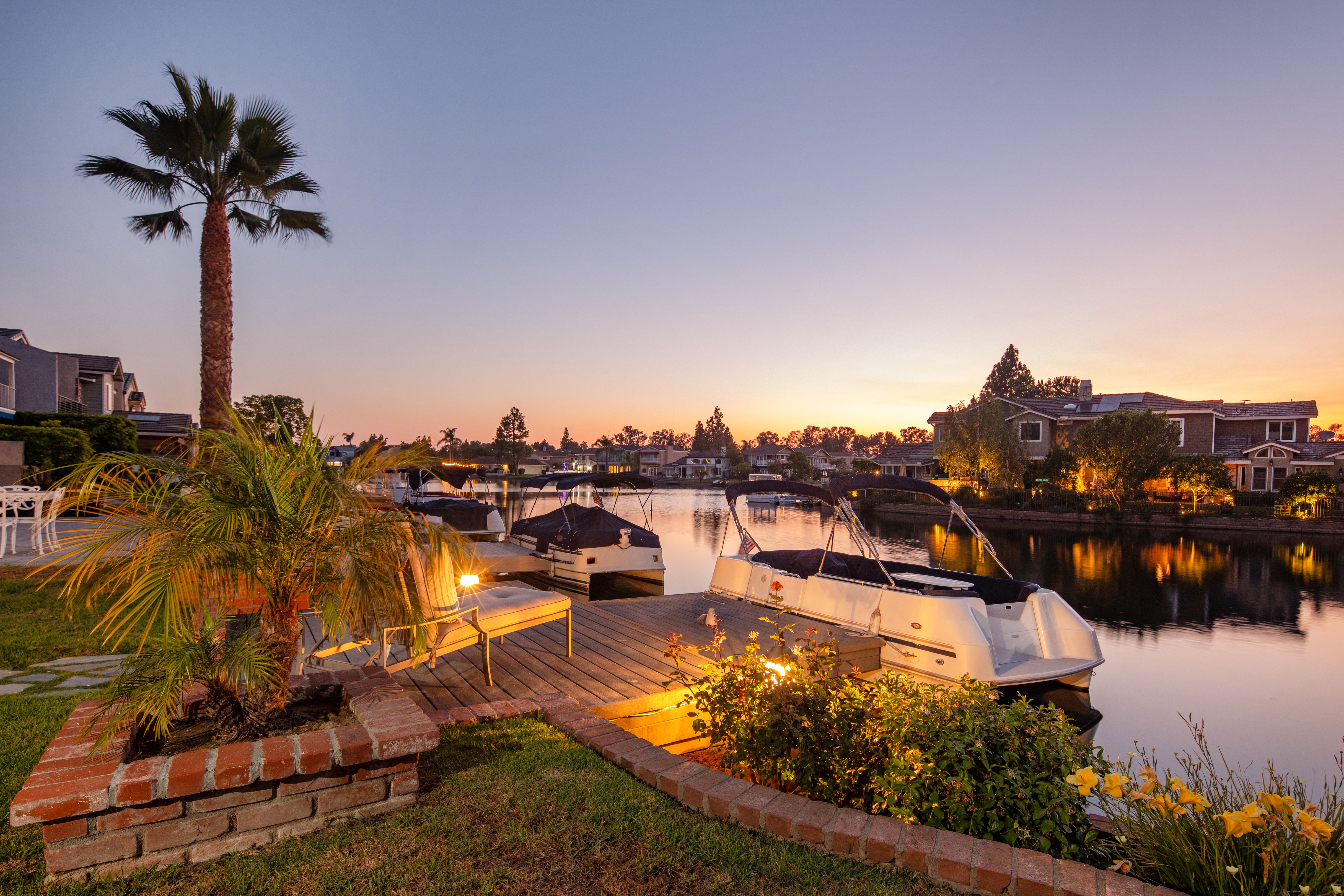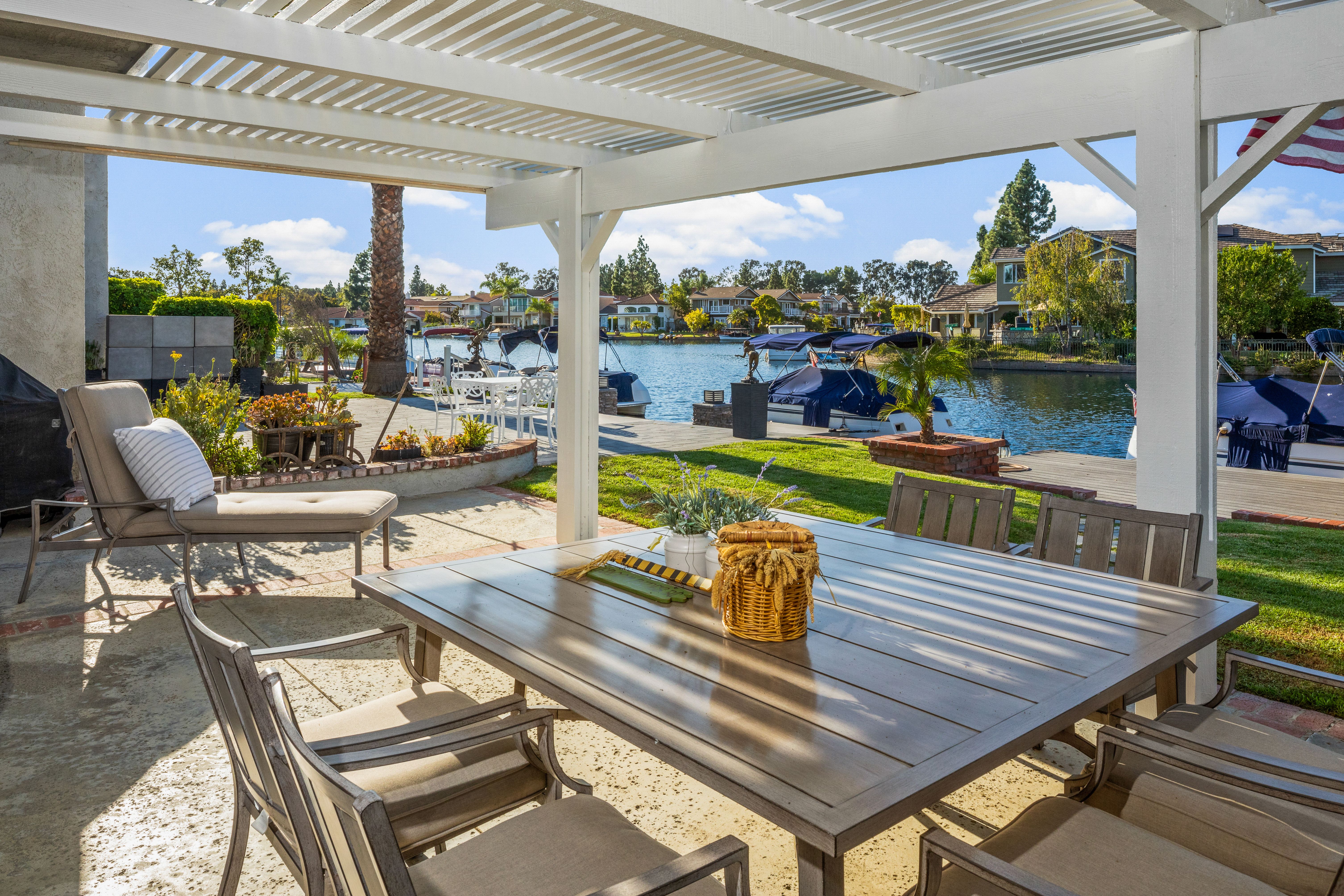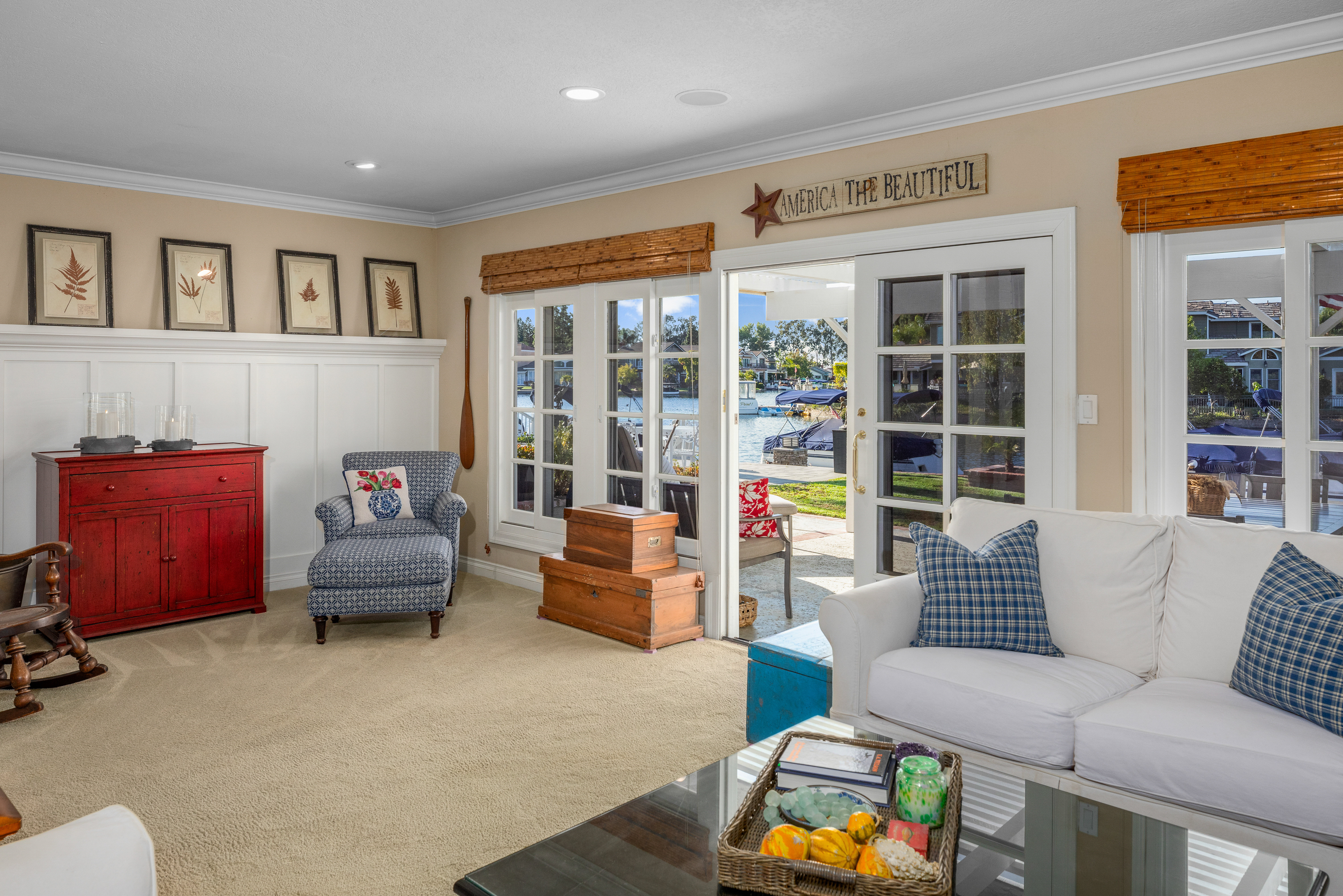 If America was a house, it might look something like this. Nestled along the tranquil edge of the Lake Forest Keys, this lakefront home captures the essence of laid-back all-American living, with a polished yet timeless sensibility. Designed to feel both grounded and elevated, the home leans into a warm palette of deep reds, crisp whites, natural woods, and aged metals, offering an atmosphere that feels classic without being nostalgic, and styled without ever feeling forced. Inside, the layout unfolds gently, with the living room, kitchen, and dining spaces seamlessly connected and oriented to take full advantage of the water views. At its heart, the living area centers around a fireplace framed by large windows, where sunlight plays off the ever-changing reflections of the lake outside. The kitchen, both functional and welcoming, features shaker cabinetry, stone countertops, and a large breakfast bar that invites casual conversation or weekend breakfasts with family. It’s a space that feels lived-in, loved, and ready for both slow mornings and spontaneous gatherings. Outdoors, the experience continues with a generous patio that leads to a private dock, your front-row seat to everything the lake has to offer. From sunlit mornings to lantern-lit nights, this is a place designed for gathering, unwinding, and simply being present. Upstairs, each bedroom carries its own quiet charm, tied together by a cohesive design thread of comfort and classic finishes. The primary suite offers sweeping views of the lake, and the gentle rhythm of the water becomes part of the everyday routine. Throughout, thoughtful details like custom wooden shutters, soft lighting, and heritage-inspired accents create a sense of ease and familiarity. Rooted in tradition but designed for modern life, this home is more than just a residence, it’s an embodiment of comfort, character, and the quiet luxury of lakeside living in one of Orange County’s most beloved communities.