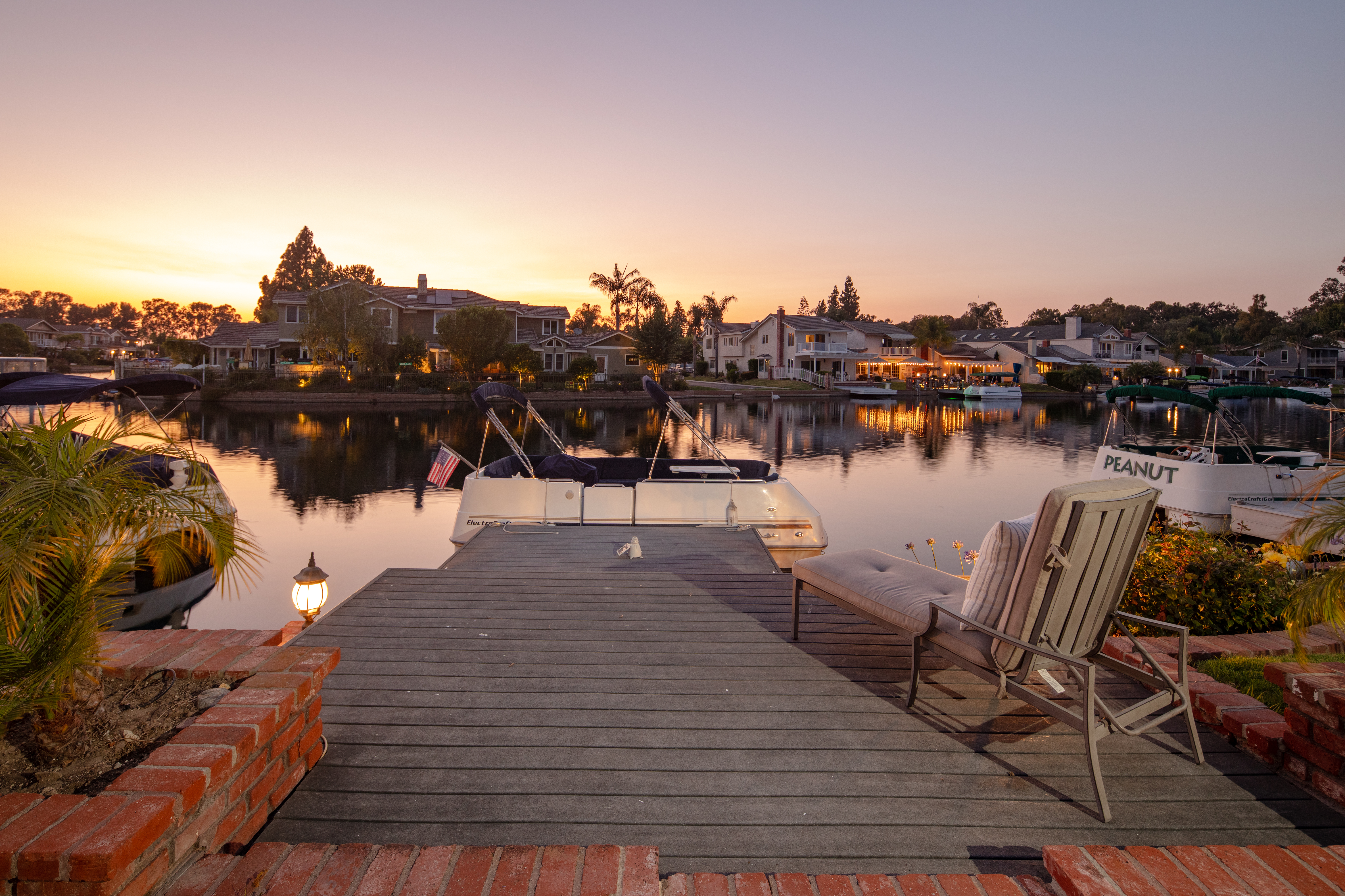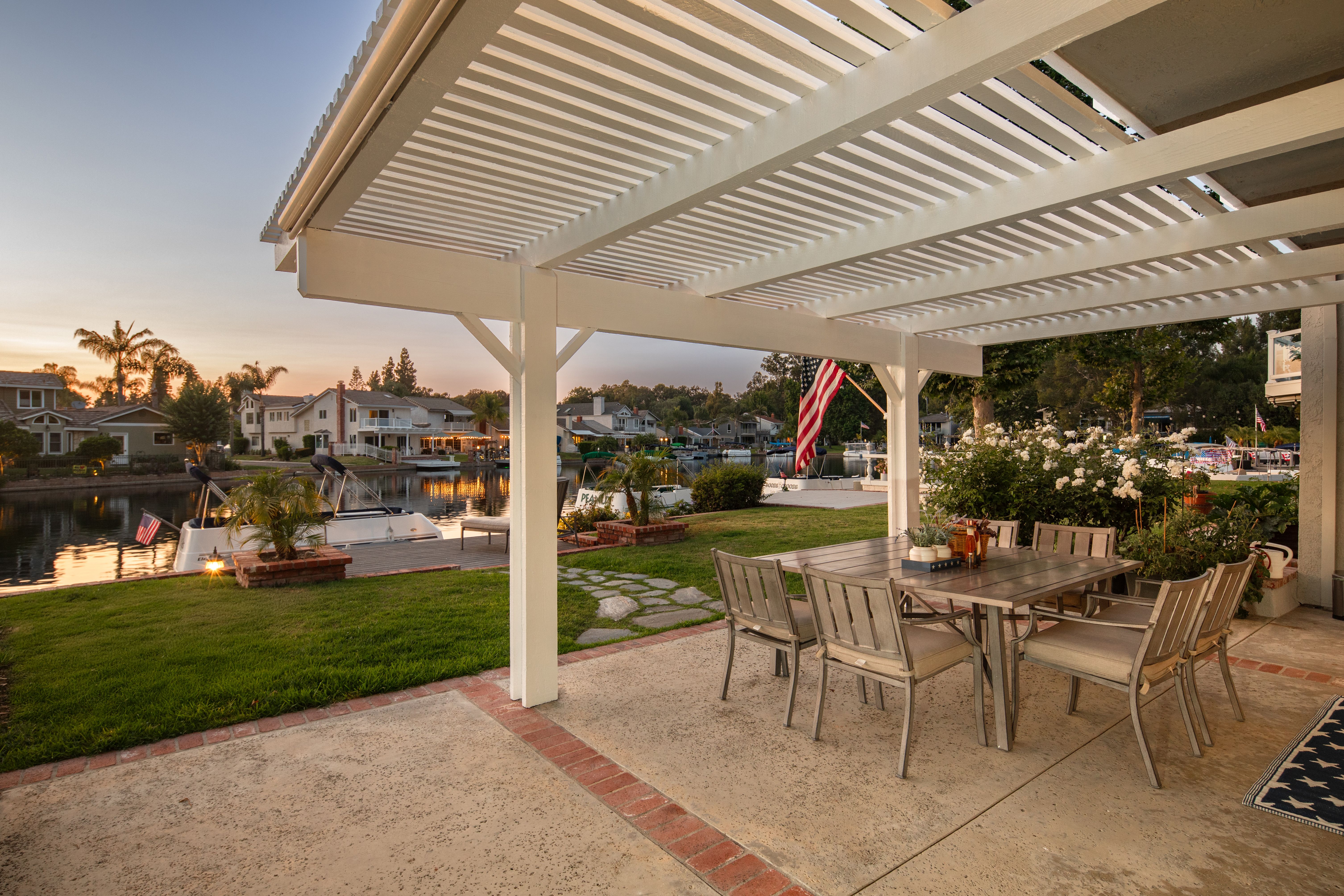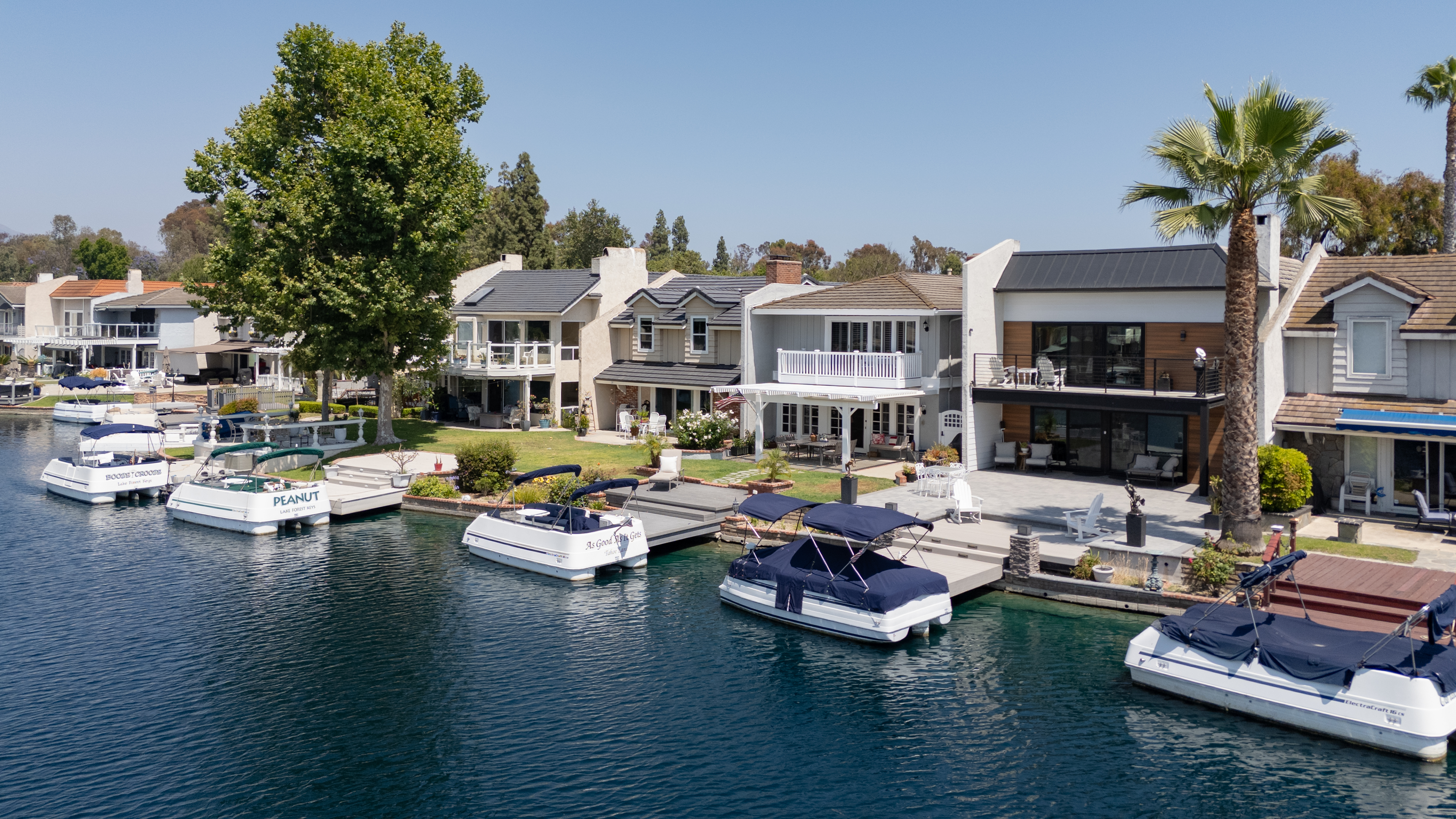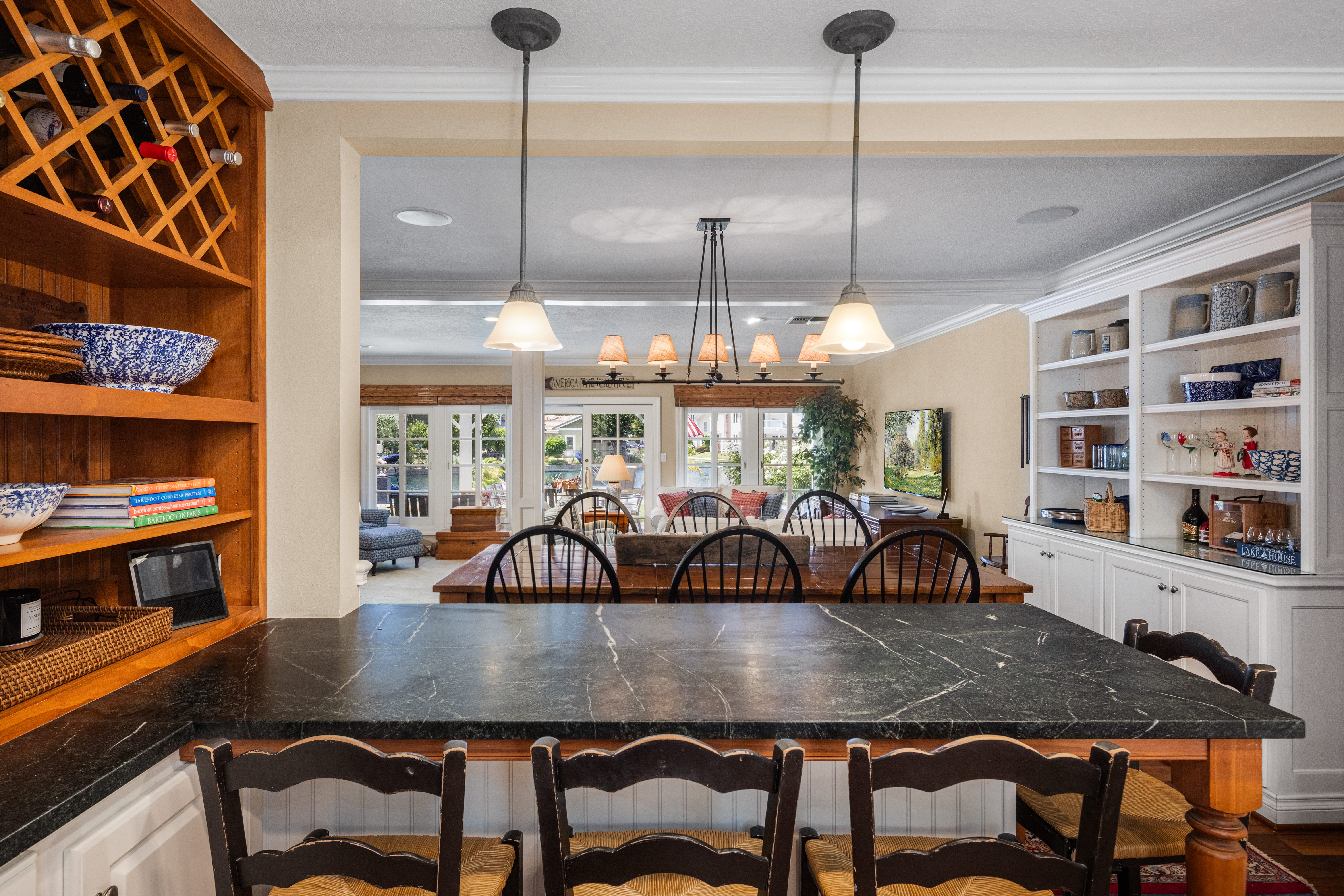 If America was a house, it might look something like this. Nestled along the tranquil edge of the Lake Forest Keys, this lakefront home captures the essence of laid-back all-American living, with a polished yet timeless sensibility. Designed to feel both grounded and elevated, the home leans into a warm palette of deep reds, crisp whites, natural woods, and aged metals, offering an atmosphere that feels classic without being nostalgic, and styled without ever feeling forced. Inside, the layout unfolds gently, with the living room, kitchen, and dining spaces seamlessly connected and oriented to take full advantage of the water views. At its heart, the living area centers around a fireplace framed by large windows, where sunlight plays off the ever-changing reflections of the lake outside. The kitchen, both functional and welcoming, features shaker cabinetry, stone countertops, and a large breakfast bar that invites casual conversation or weekend breakfasts with family. It’s a space that feels lived-in, loved, and ready for both slow mornings and spontaneous gatherings. Outdoors, the experience continues with a generous patio that leads to a private dock, your front-row seat to everything the lake has to offer. From sunlit mornings to lantern-lit nights, this is a place designed for gathering, unwinding, and simply being present. Upstairs, each bedroom carries its own quiet charm, tied together by a cohesive design thread of comfort and classic finishes. The primary suite offers sweeping views of the lake, and the gentle rhythm of the water becomes part of the everyday routine. Throughout, thoughtful details like custom wooden shutters, soft lighting, and heritage-inspired accents create a sense of ease and familiarity. Rooted in tradition but designed for modern life, this home is more than just a residence, it’s an embodiment of comfort, character, and the quiet luxury of lakeside living in one of Orange County’s most beloved communities.